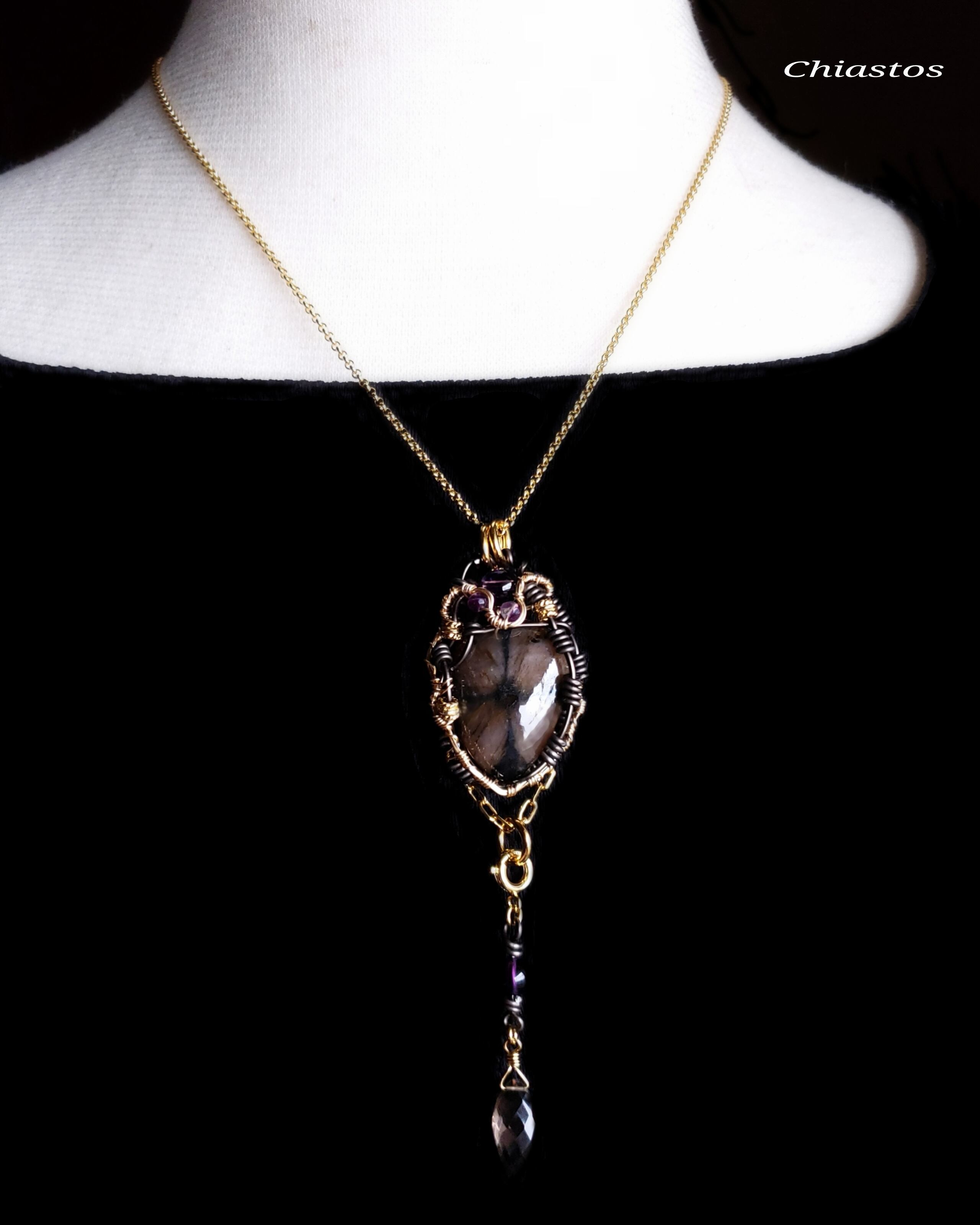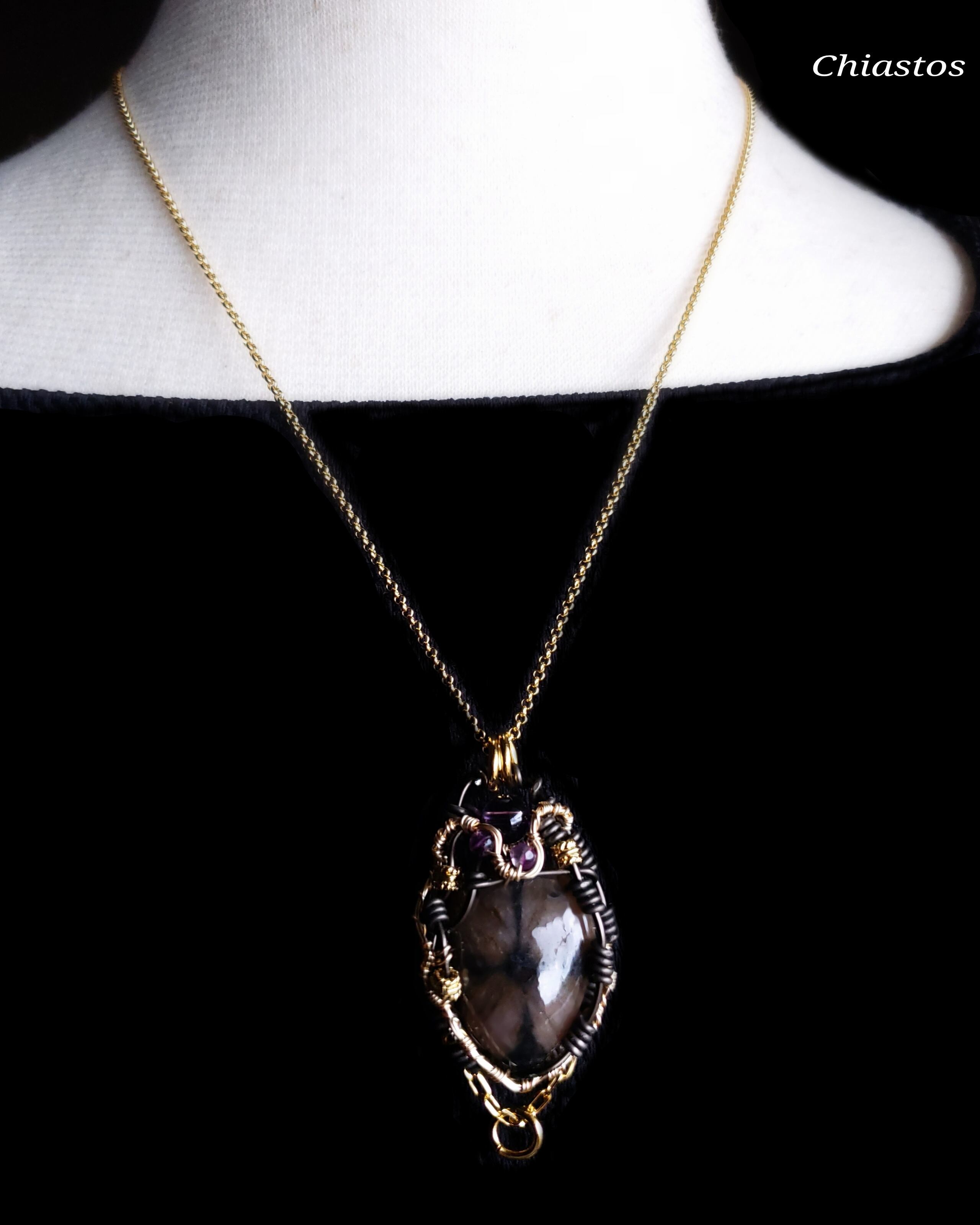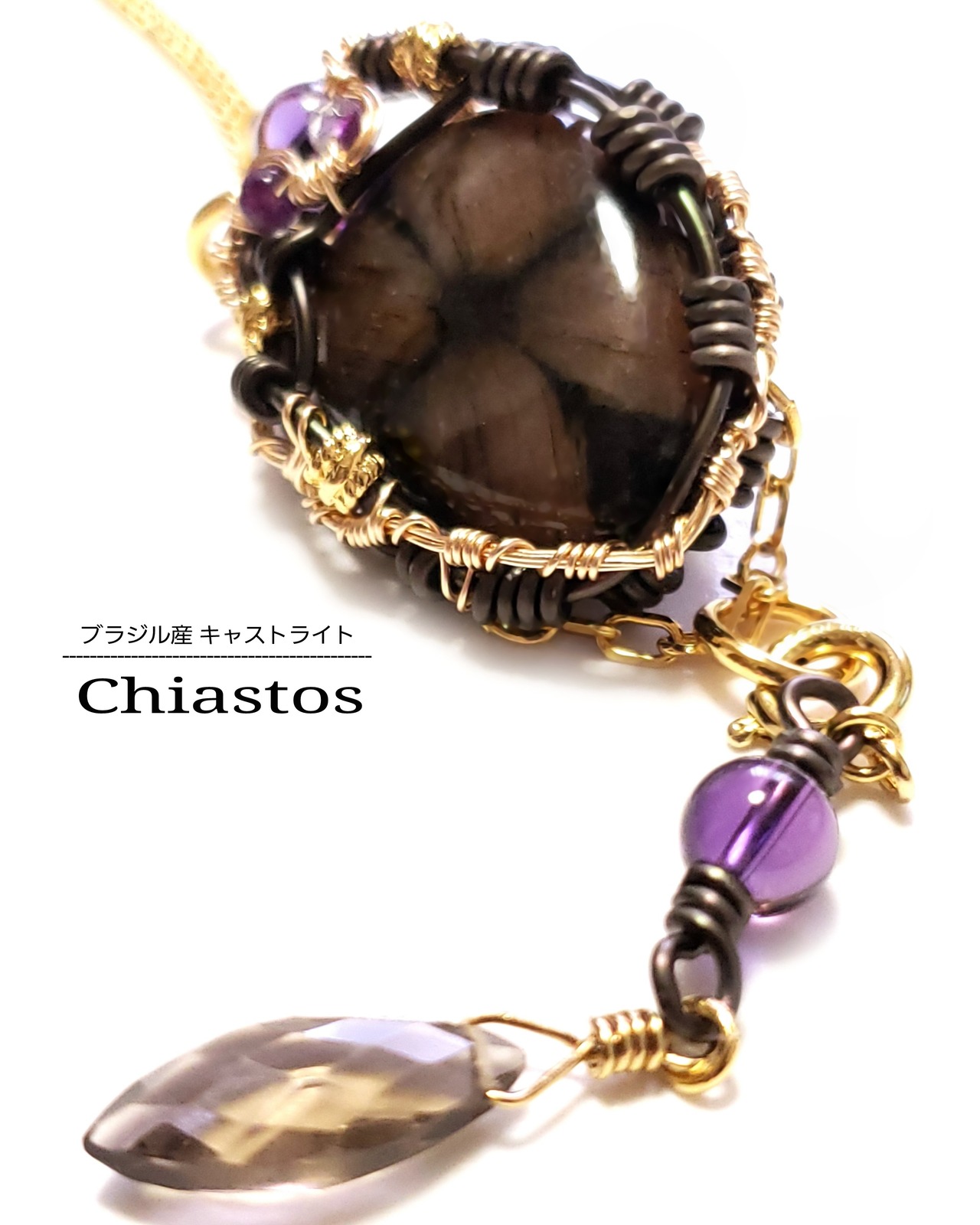 黒いクロス模様が個性的なブラジル産キャストライトに、アメジストとフローライト、そして、スモーキークォーツとアメジストのチャームを組み合わせ、ゴールドのアーティスティックワイヤーアートとアルマイト鍍金アルミ製ワイヤーを使用し、ペンダントトップにデザインしました。