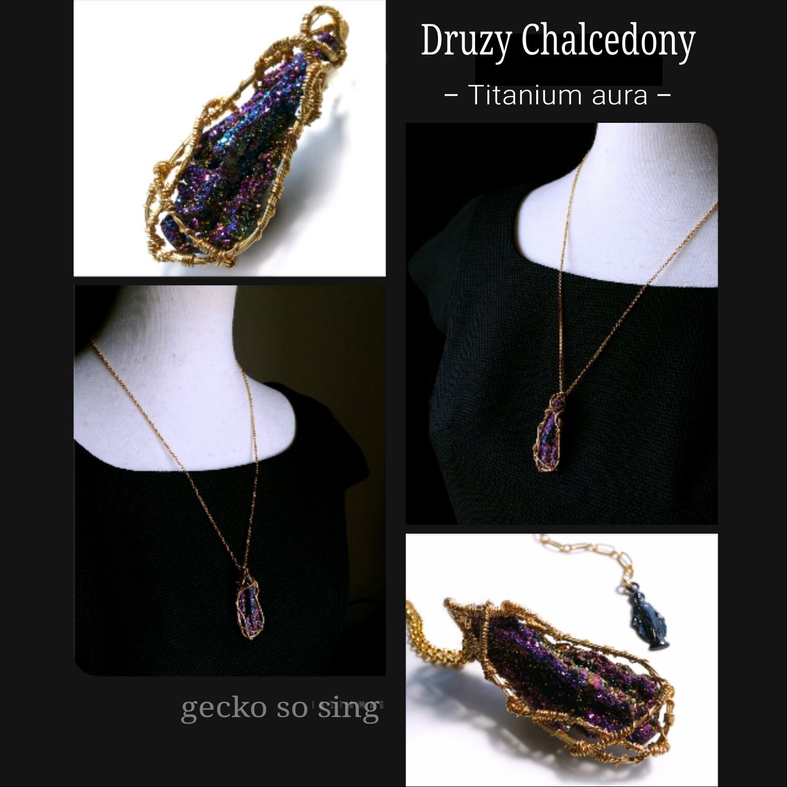 ドゥルージー・カルセドニーを、ゴールドのアーティスティックワイヤーを使用し、ペンダントトップにデザインしました。