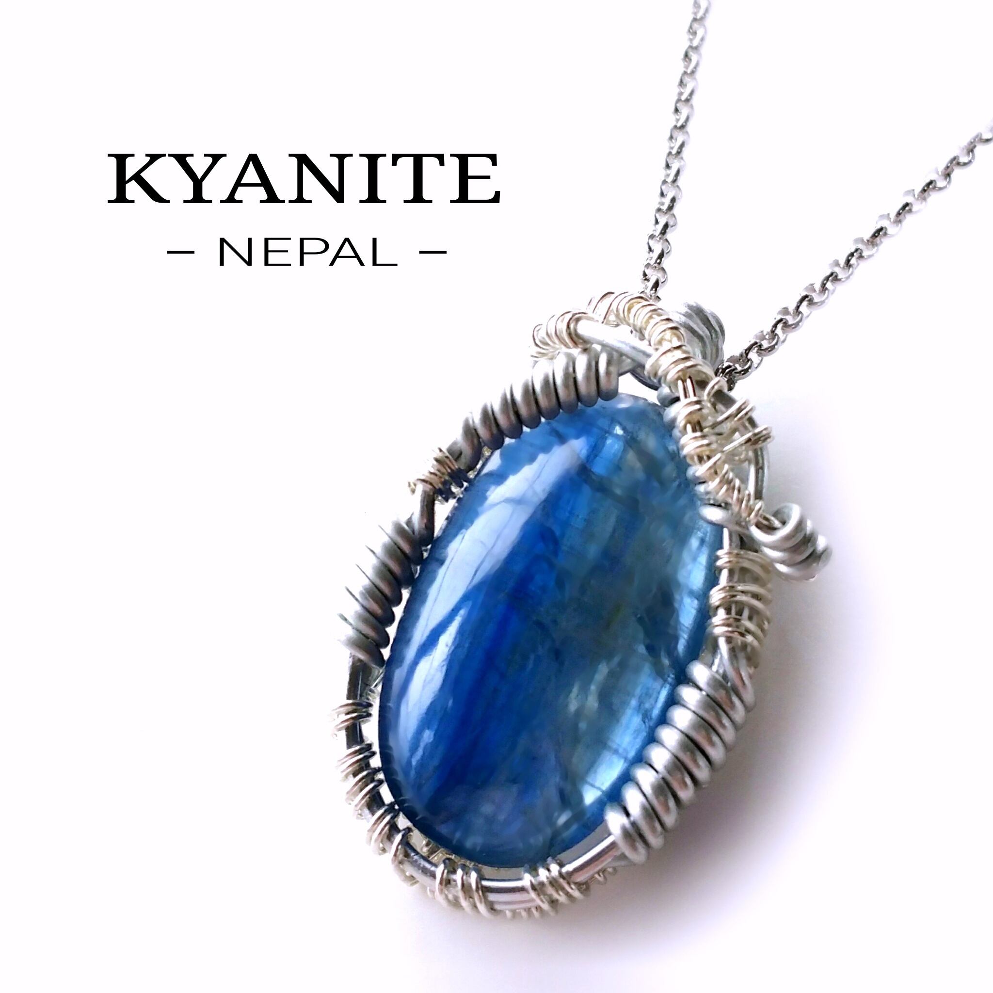 濃紺から青に近いグラデーションの透明感あるカイヤナイトを、シルバーのアーティスティックワイヤーとアルマイト鍍金アルミ製のワイヤーを組み合わせ、ペンダントトップにデザインしました。