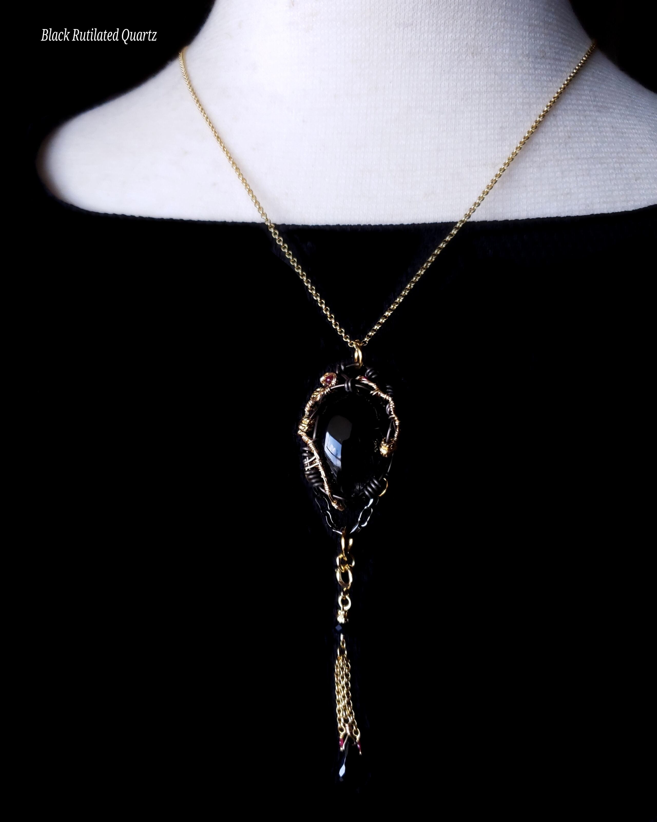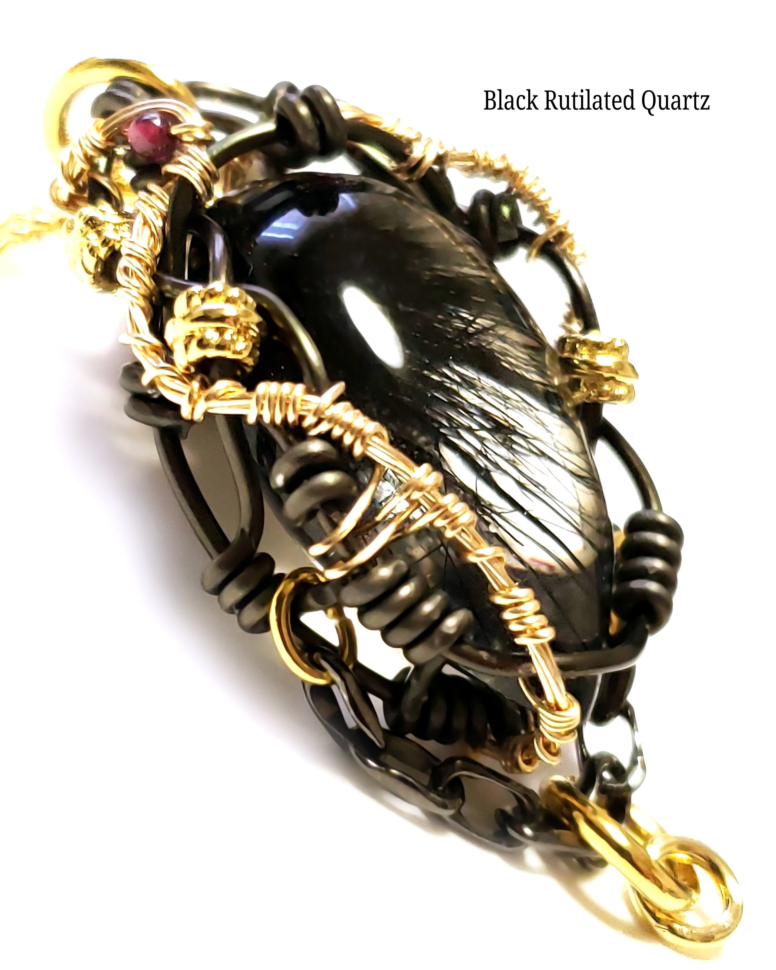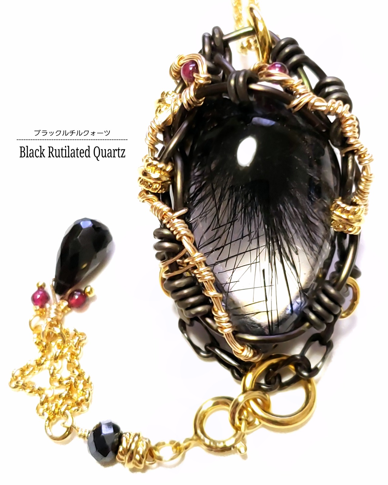 透明度が高い水晶の中に、放射状に広がる黒い針状結晶が美しいブラックルチルクォーツにガーネットを、そして、ブラックスピネルとガーネットのチャームを組み合わせ、ゴールドのアーティスティックワイヤーとアルマイト鍍金アルミ製ワイヤーを使用し、ペンダントトップにデザインしました。