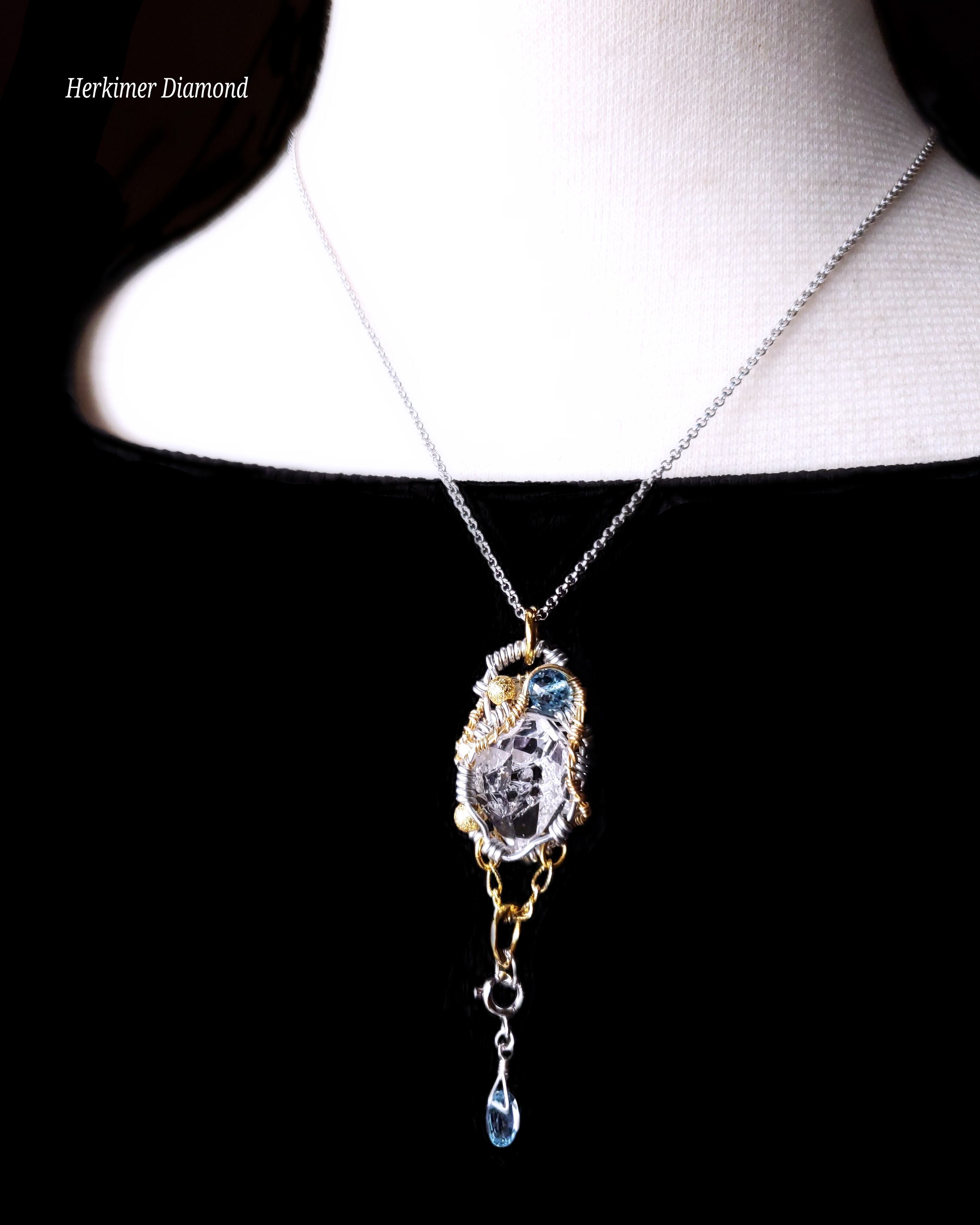 とても透明感のあるハーキマーダイヤモンドにブルートパーズとアメジストと淡水パール、そして、ブルートパーズのチャームを組み合わせ、ゴールドのアーティスティックワイヤーとアルミ製ワイヤーを使用し、ペンダントトップにデザインしました。