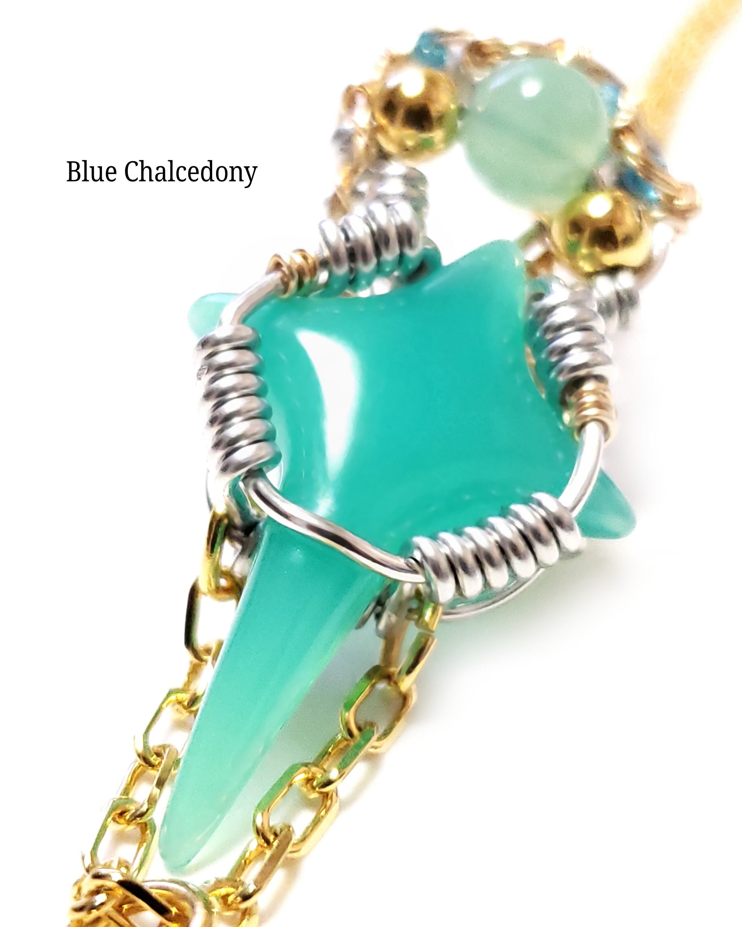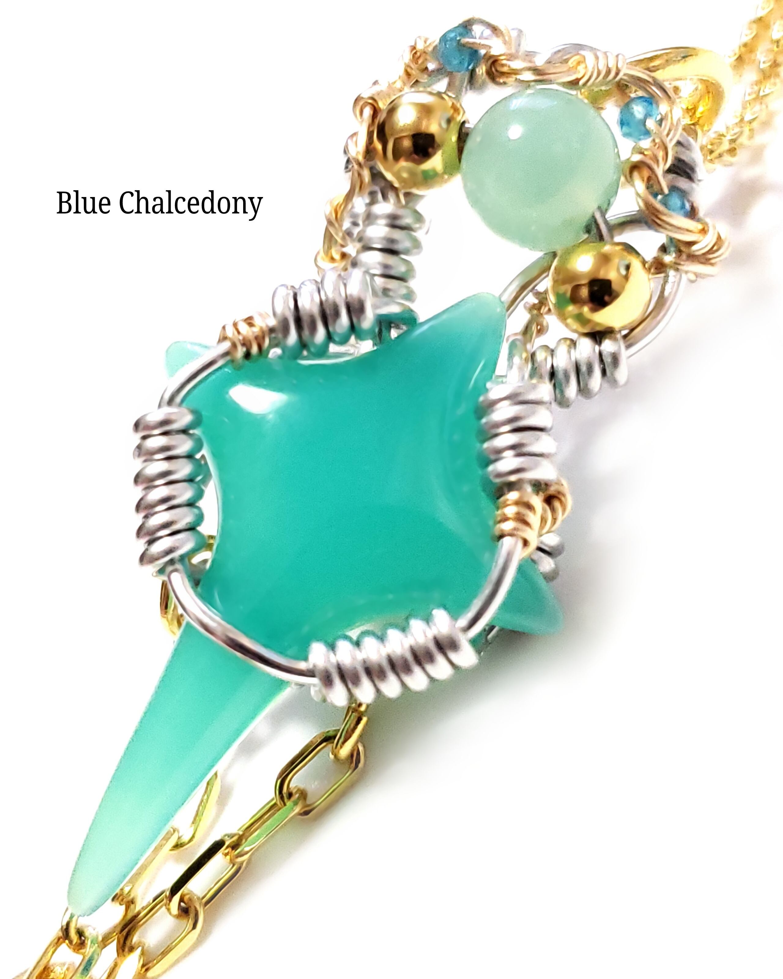 透明感あるブルーカルセドニーにブルーカルセドニーとブルーアパタイト、そして、月と星と十字架の3つのチャームを組み合わせ、ゴールドのアーティスティックワイヤーとアルミ製ワイヤーを使用して、ペンダントトップにデザインしました。