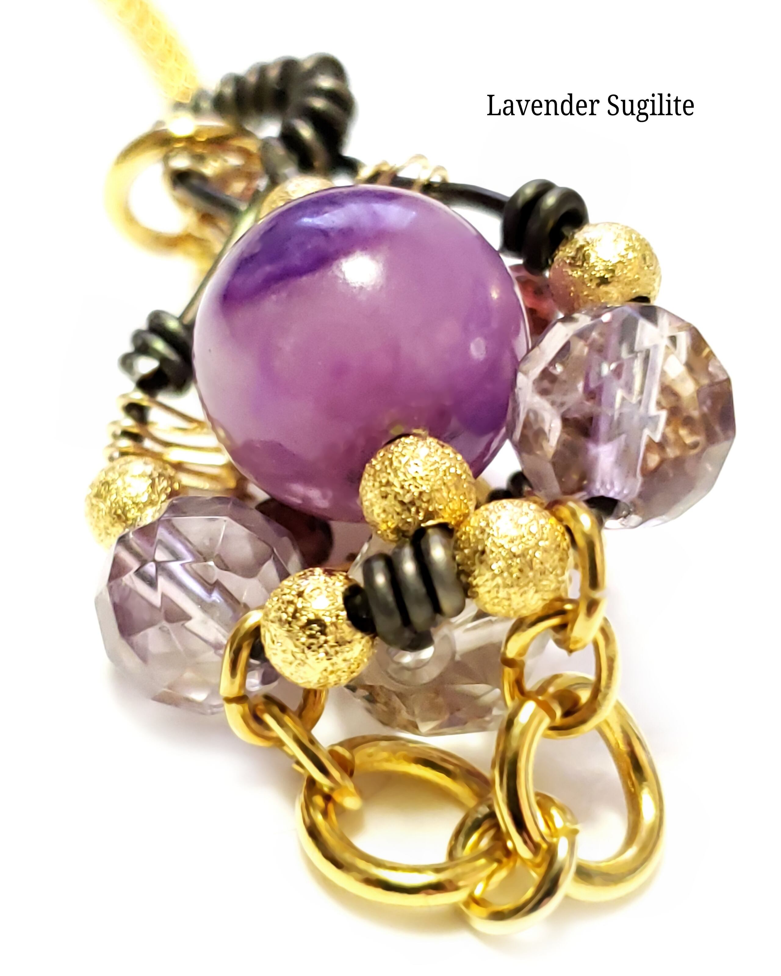 南アフリカ産の珍しいラベンダー色したスギライトの丸玉に、ラベンダーアメジストとガーネットとクンツァイト、そして、スコロライトのチャームと月のチャームを組み合わせ、ゴールドのアーティスティックワイヤーとブラックアルマイト鍍金アルミ製ワイヤーを使用して、ペンダントにデザインしました。