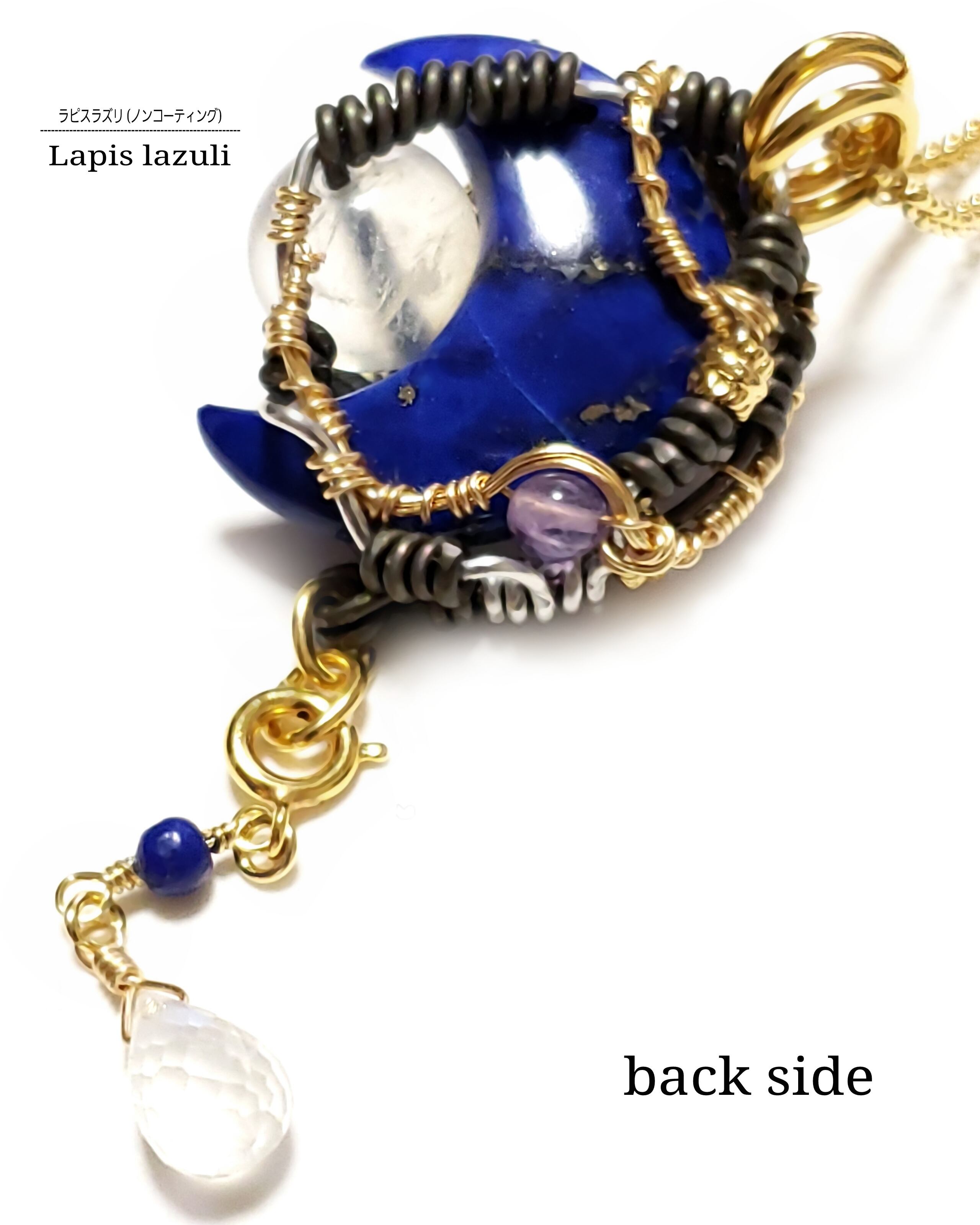 紺色から藍色の中に、黄鉄鉱の粒を含んで夜空のような輝きを持つ三日月のラピスラズリに、ホワイトラブラドライトとアメジスト、そして、ムーンストーンとラピスラズリのチャームを組み合わせ、ゴールドのアーティスティックワイヤーとブラックのアルマイト鍍金アルミ製ワイヤーを使用し、ペンダントトップにデザインしました。