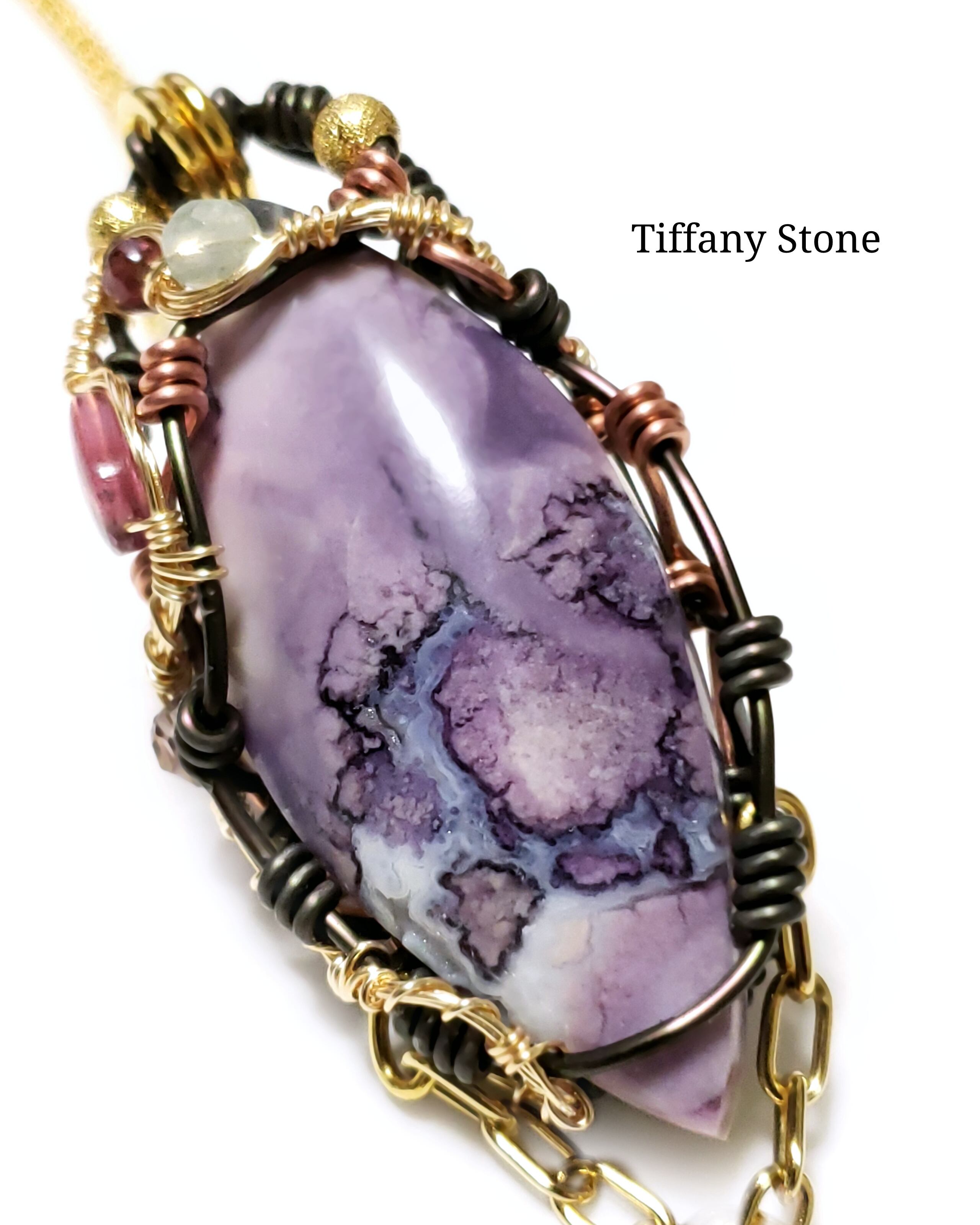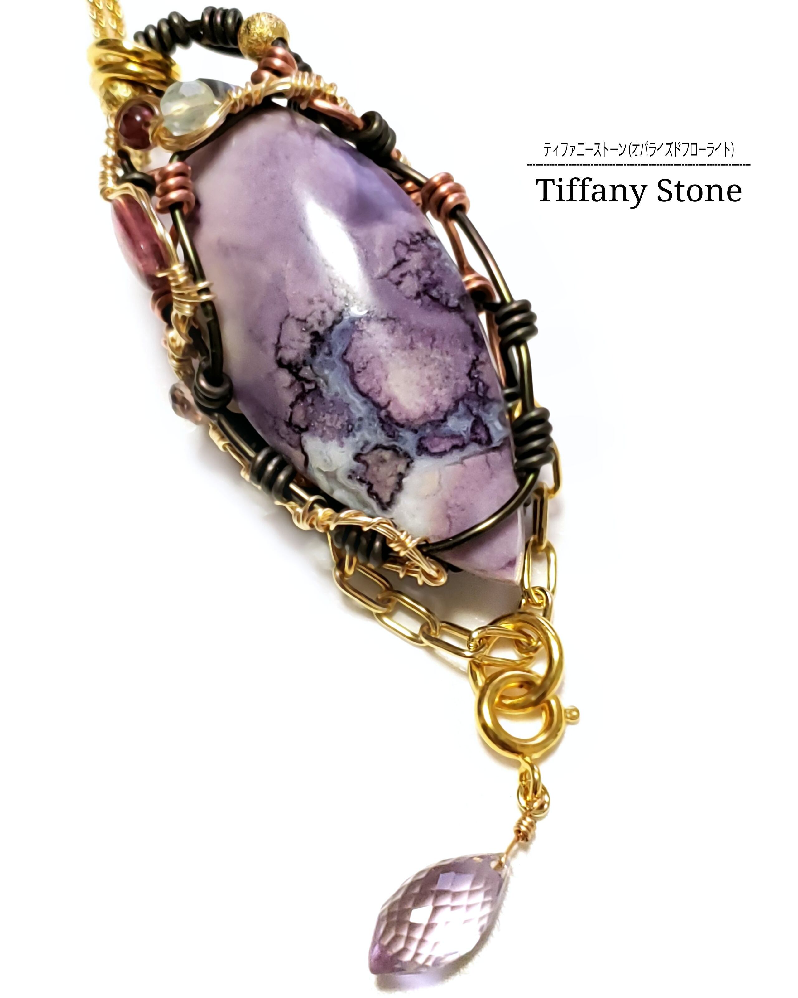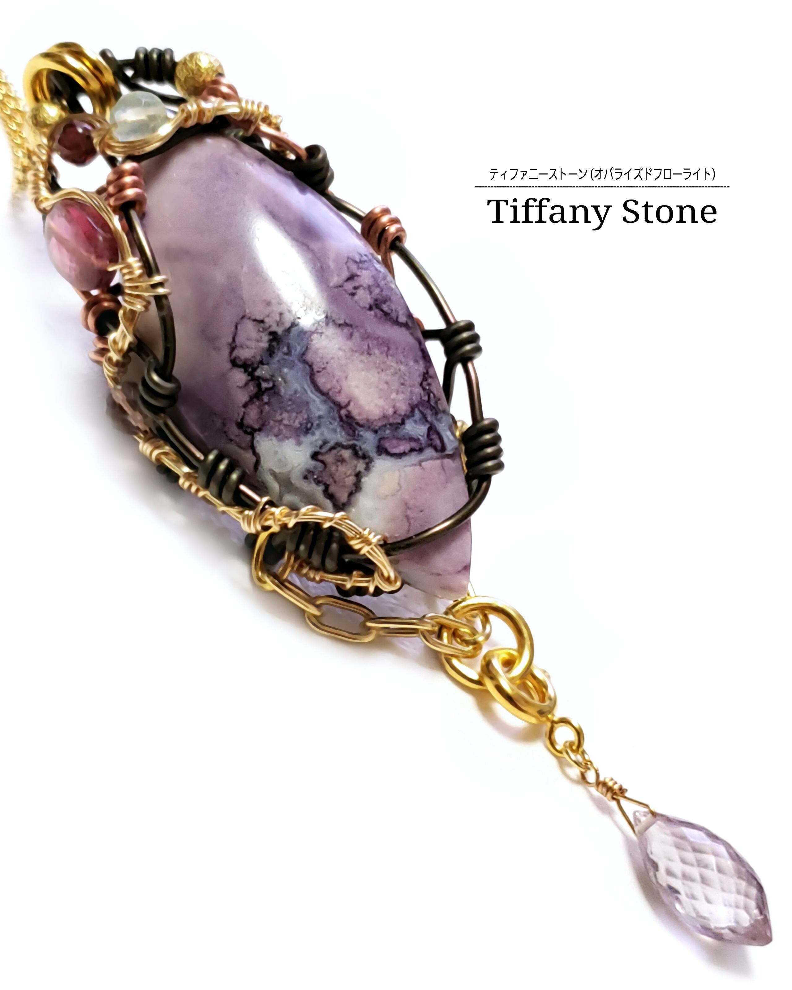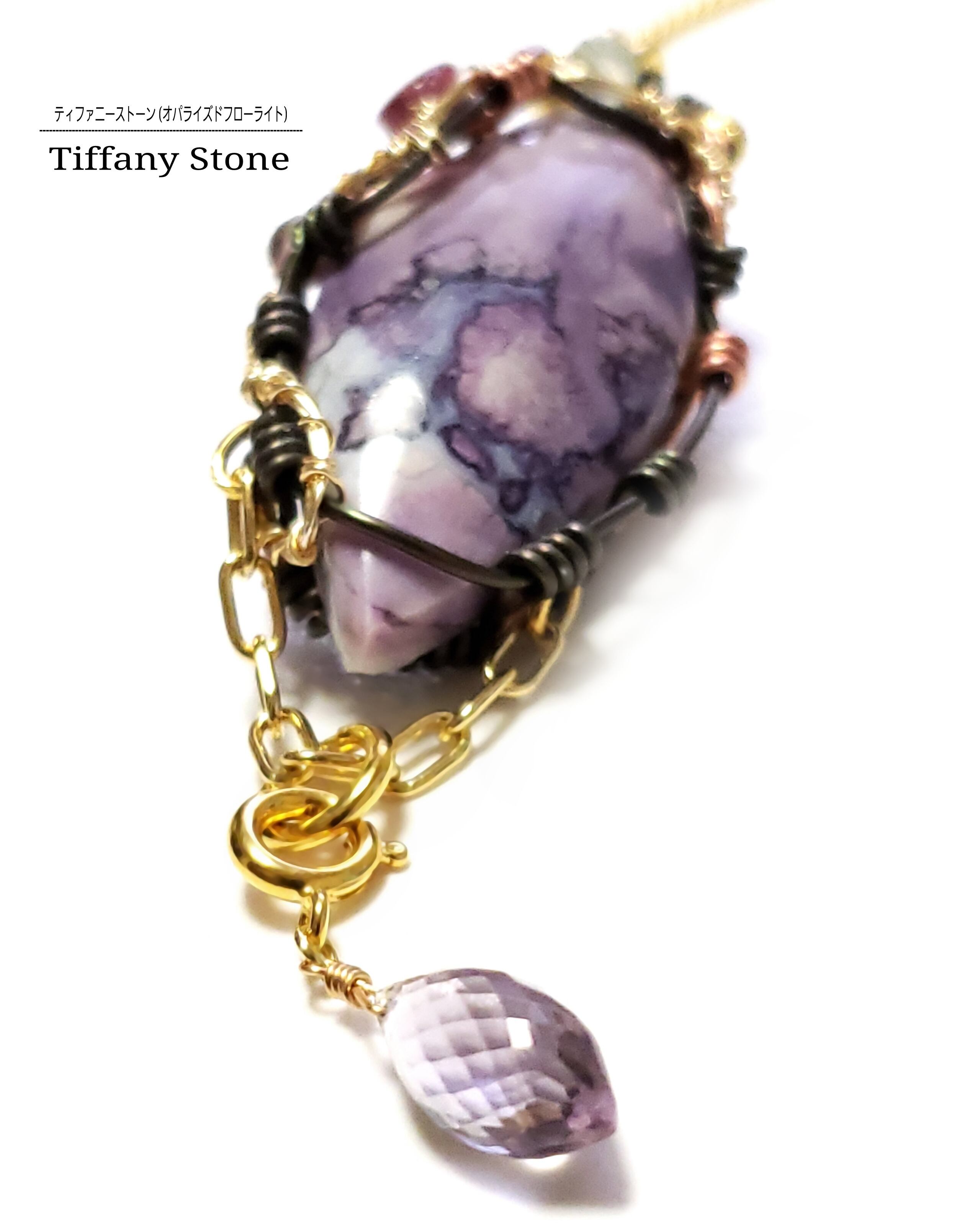 紫色のグラデーションが織り成す模様が素晴らしいティファニーストーンを、ピンクトルマリンとフローライトとガーネット、そして、ピンクアメジストのチャームを組み合わせ、ゴールドのアーティスティックワイヤーとブラックのアルマイト鍍金アルミ製ワイヤーと銅製ワイヤーを使用し、ペンダントトップにデザインしました。