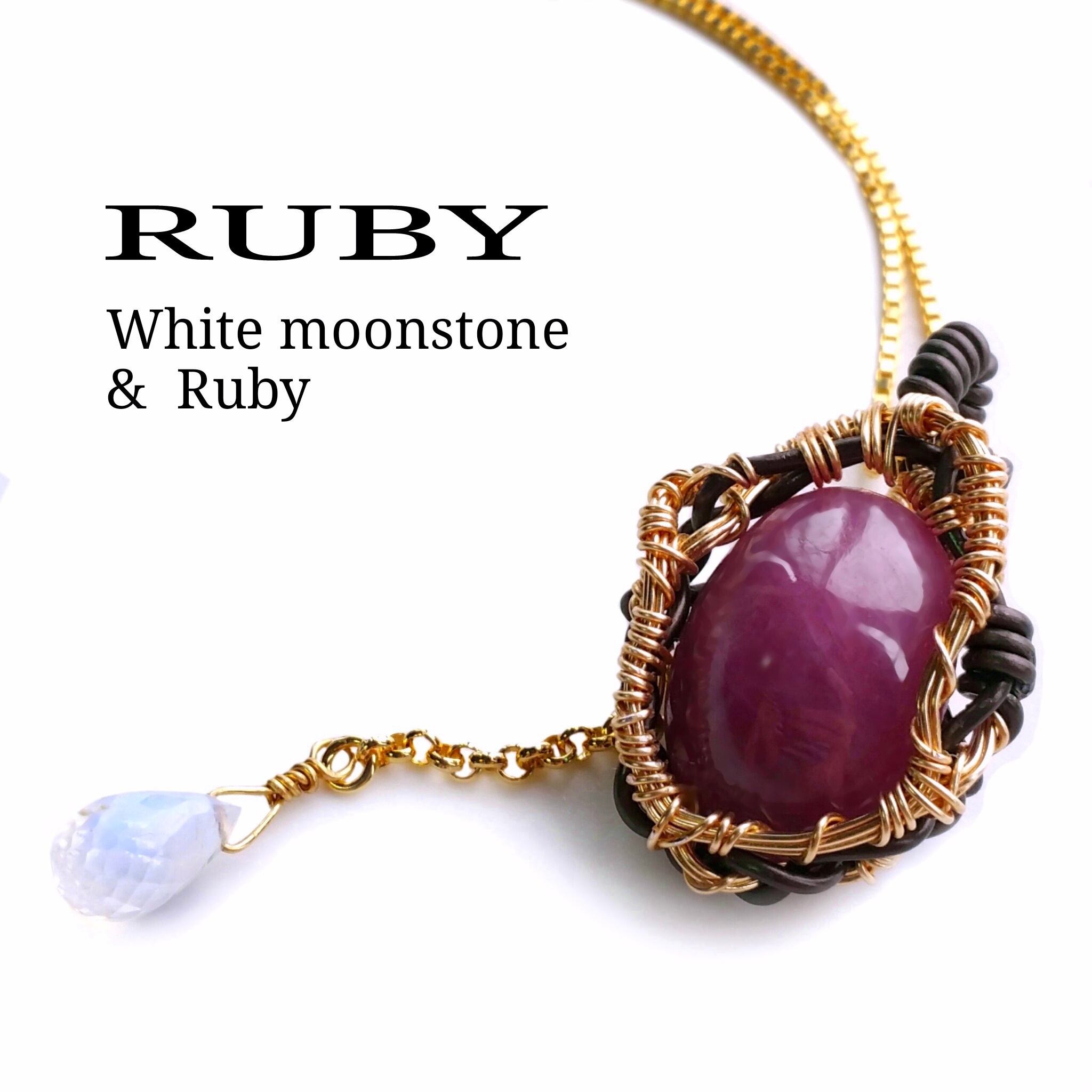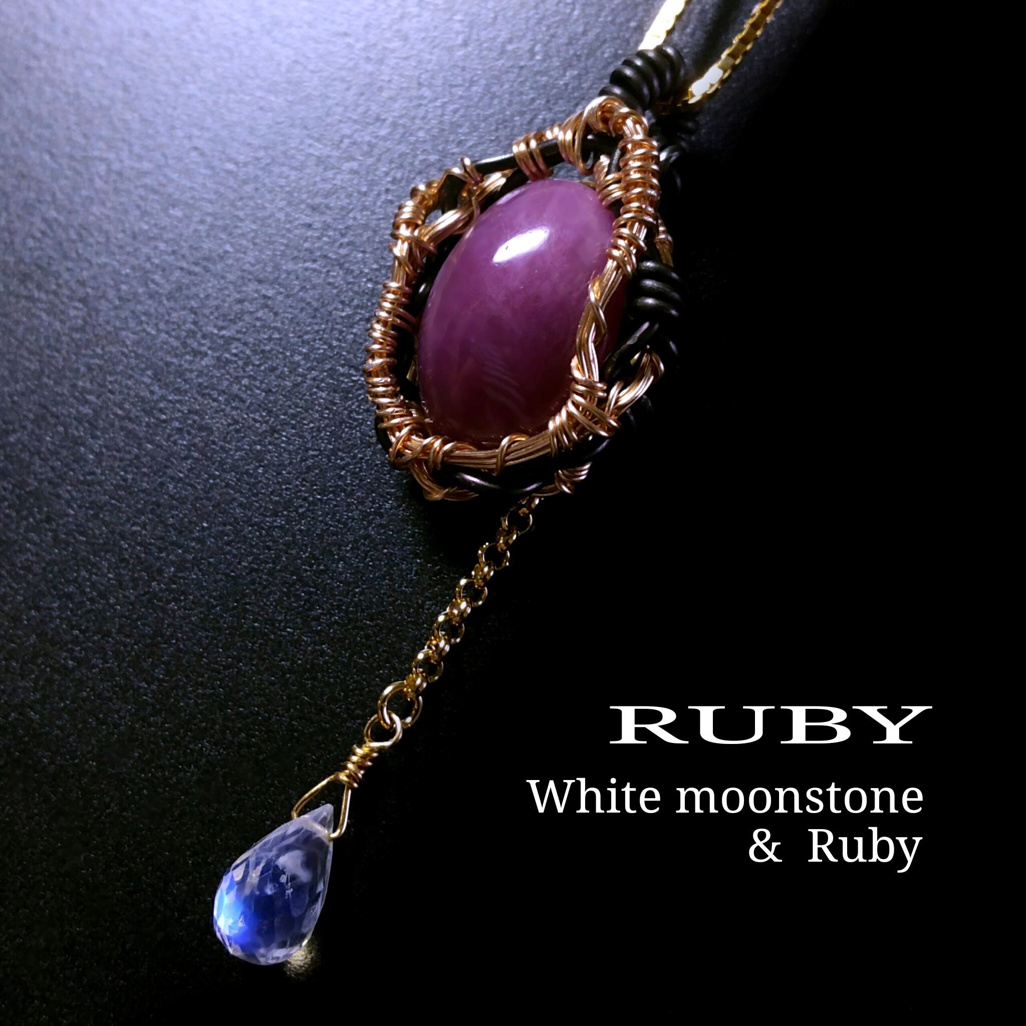 美しく深紅に輝く大粒のルビーとホワイトラブラドライトを、ゴールドのアーティスティックワイヤーとアルマイト鍍金アルミ製ワイヤーを使用し、ペンダントトップにデザインしました。