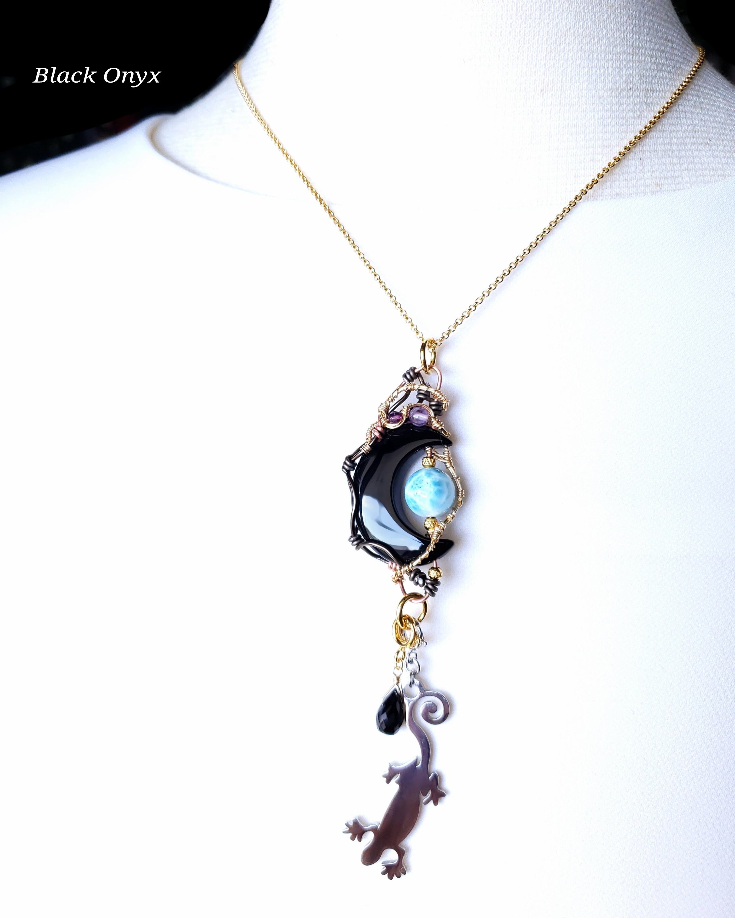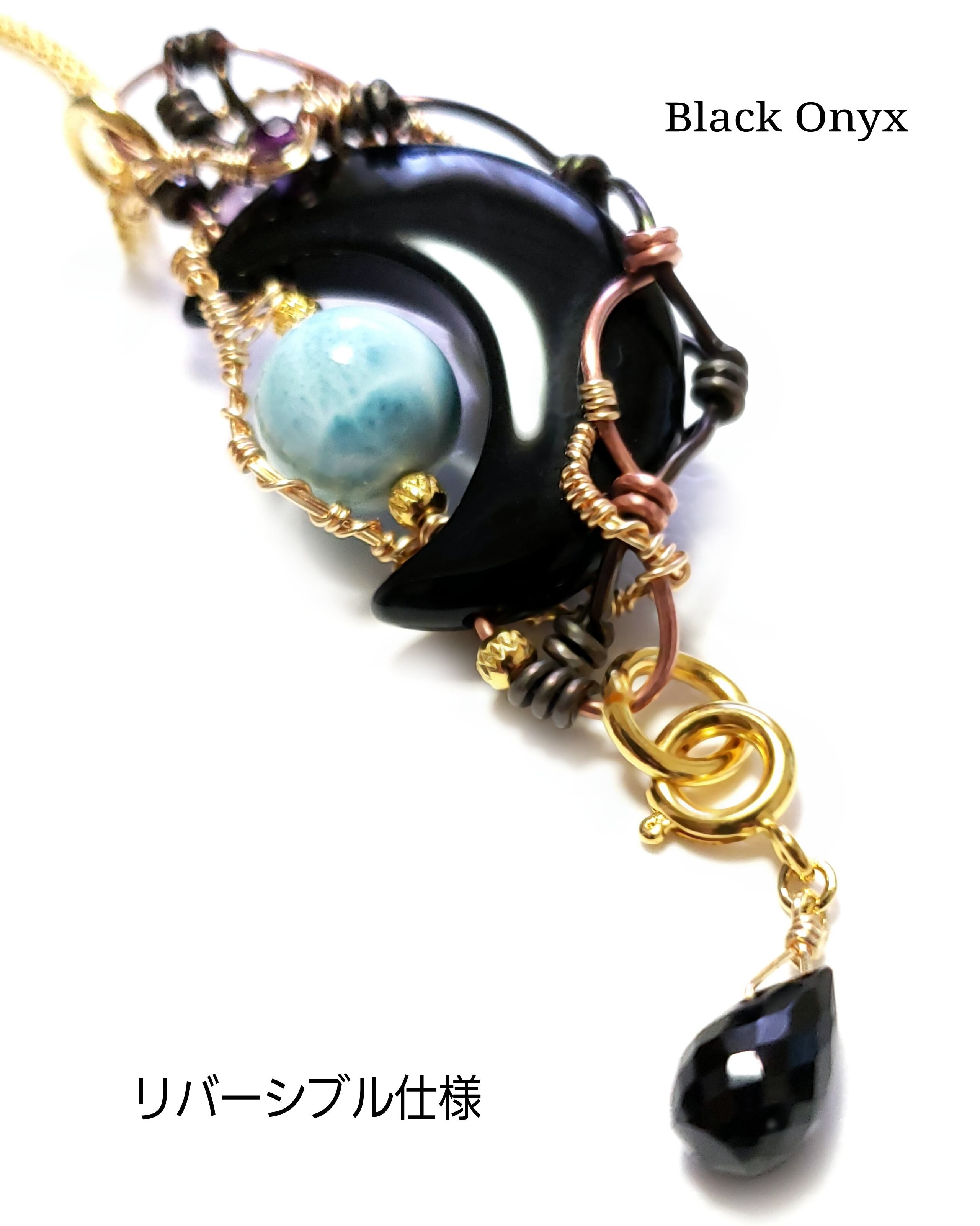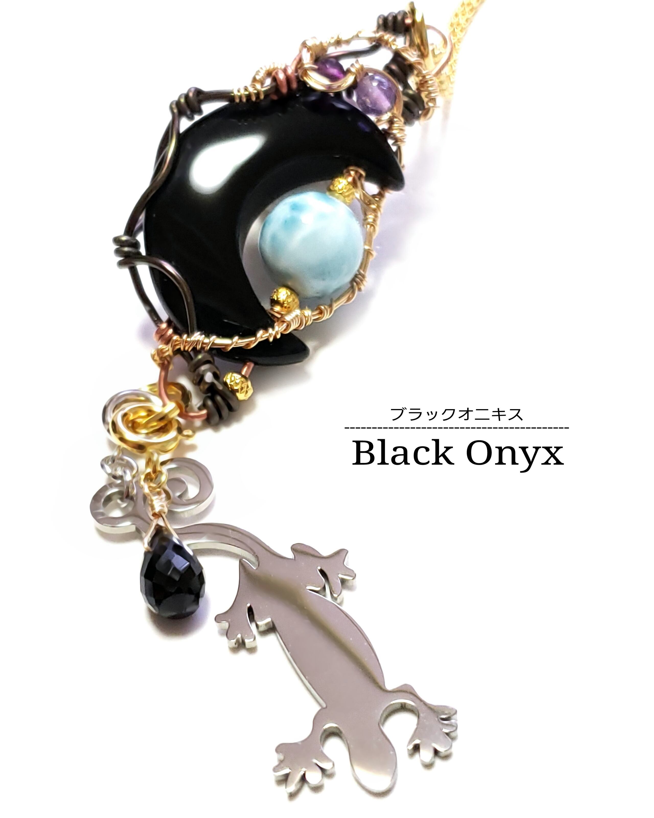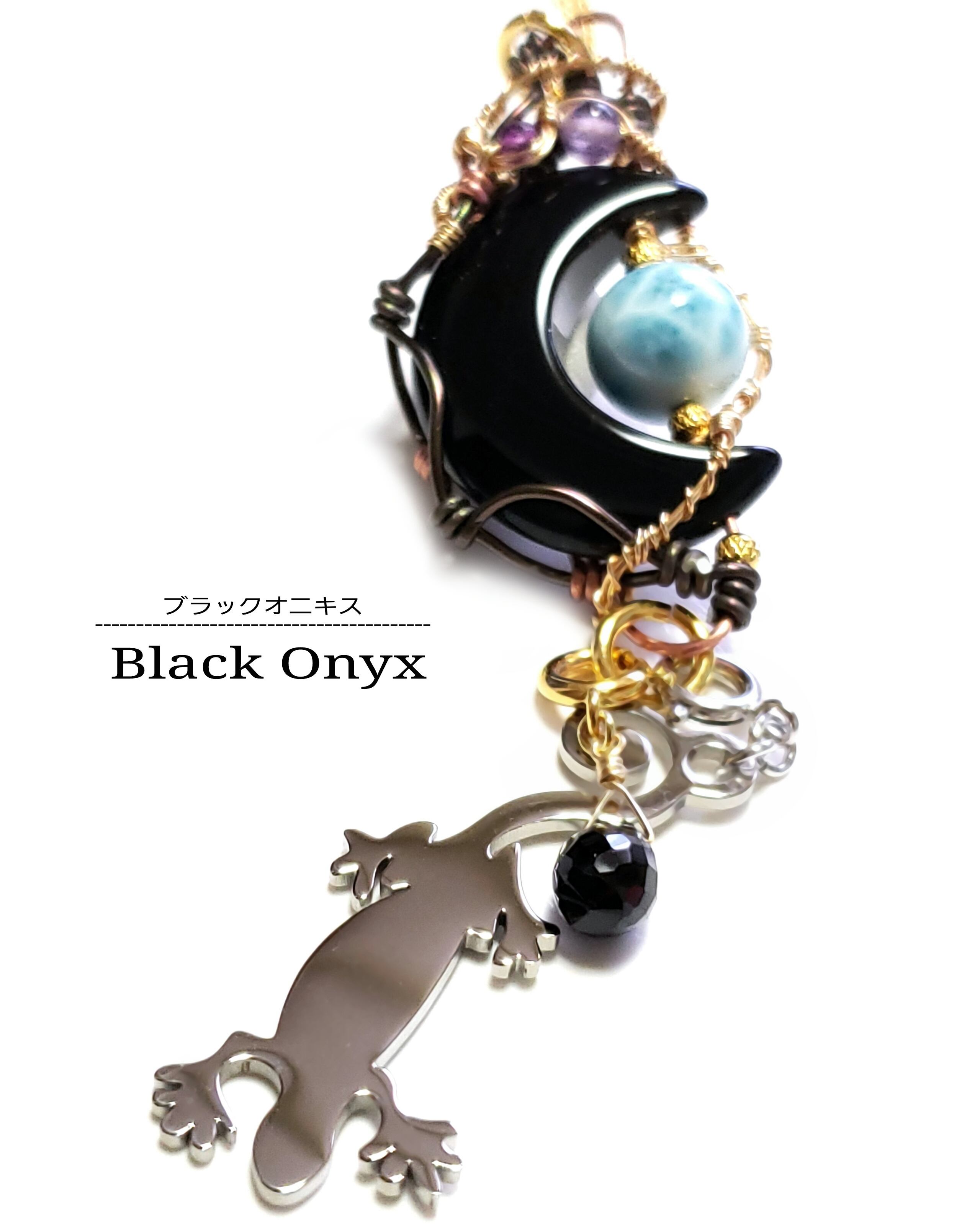 三日月型のブラックオニキスにラリマーとアメジストとガーネット、そして、ブラックスピネルのチャームと蜥蜴チャームを組み合わせ、ゴールドのアーティステックワイヤーとアルマイト鍍金アルミ製ワイヤーと銅製ワイヤーを使用し、ペンダントトップにデザインしました。