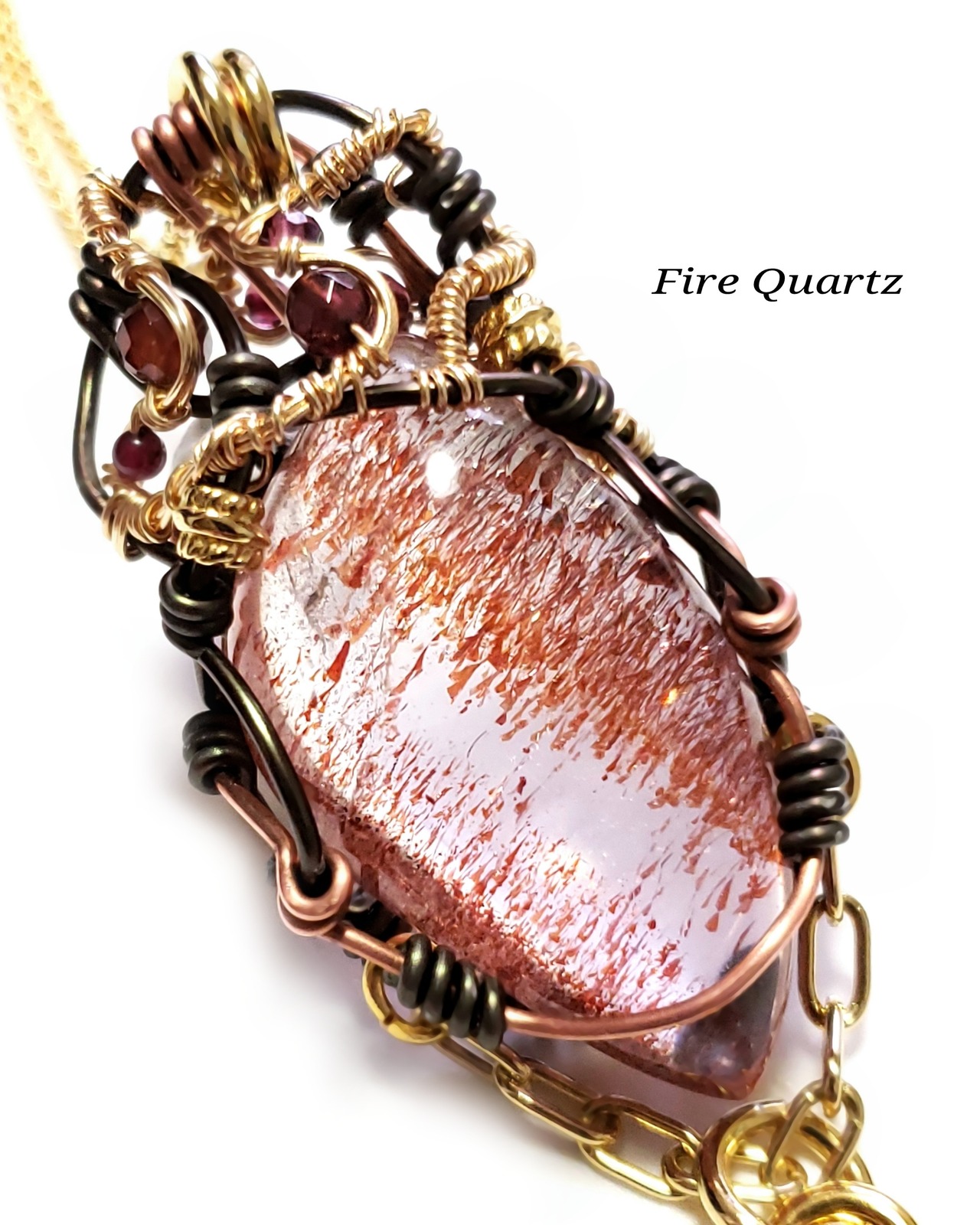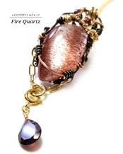 ファイヤークォーツにガーネット、そして、ガーネットのチャームを組み合わせ、ゴールドのアーティスティックワイヤーとブラックのアルマイト鍍金アルミ製ワイヤーと銅製ワイヤーを使用し、ペンダントトップにデザインしました。