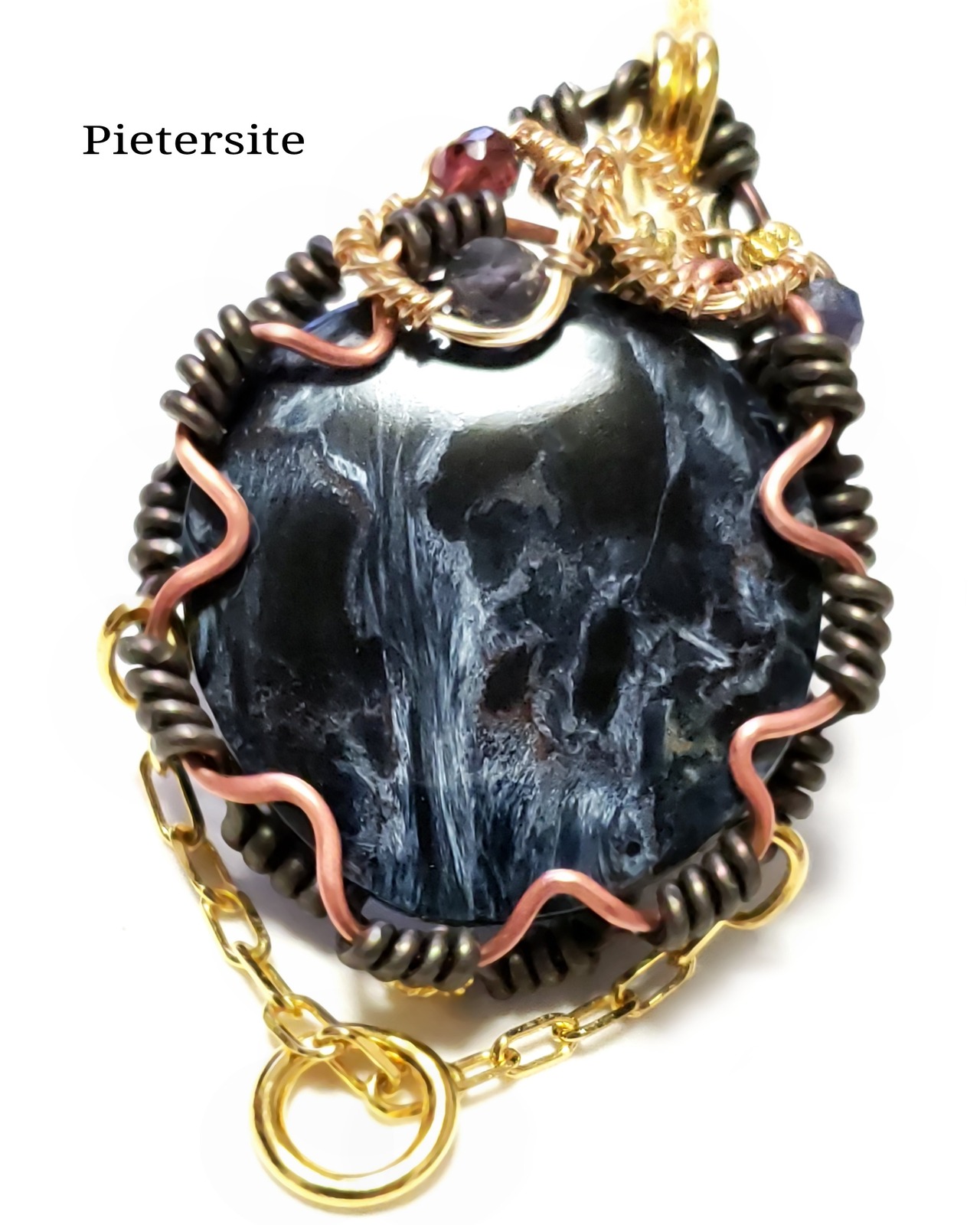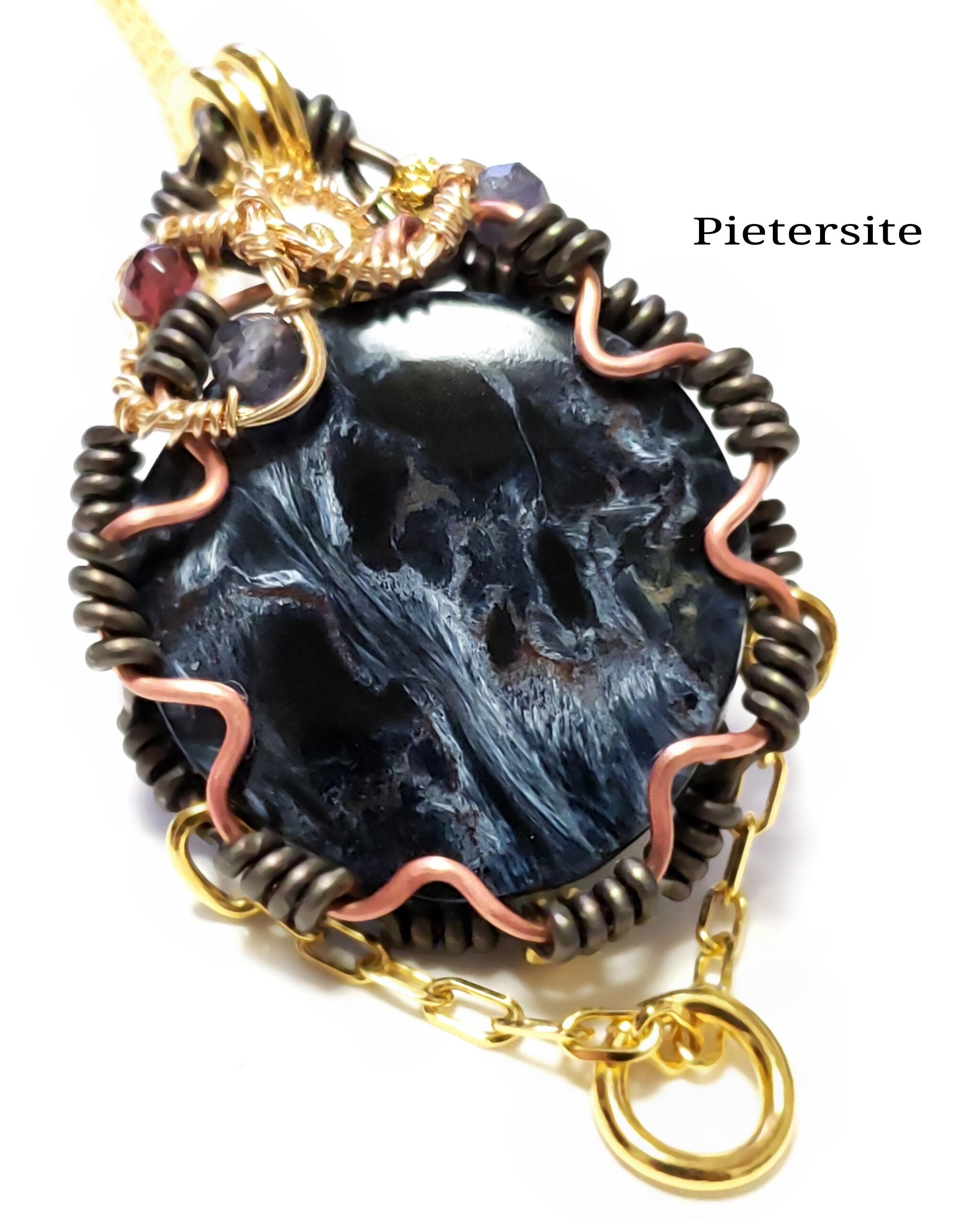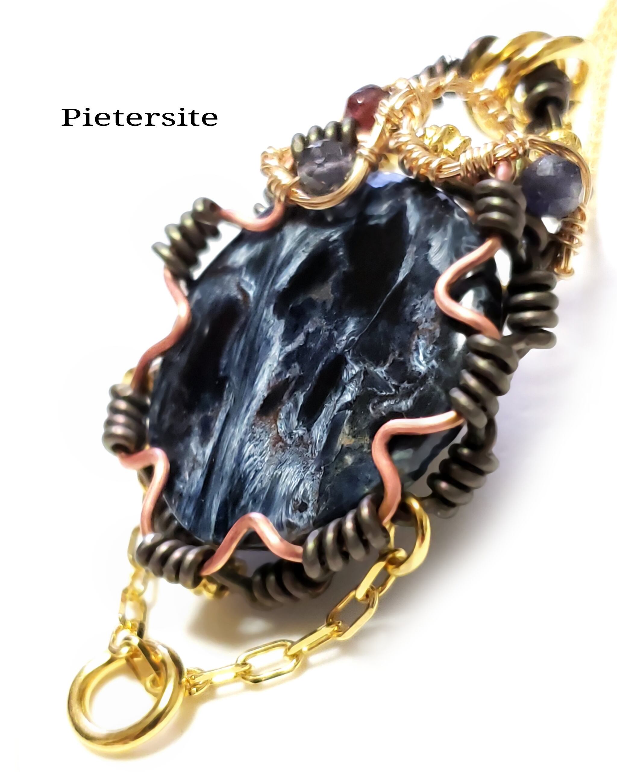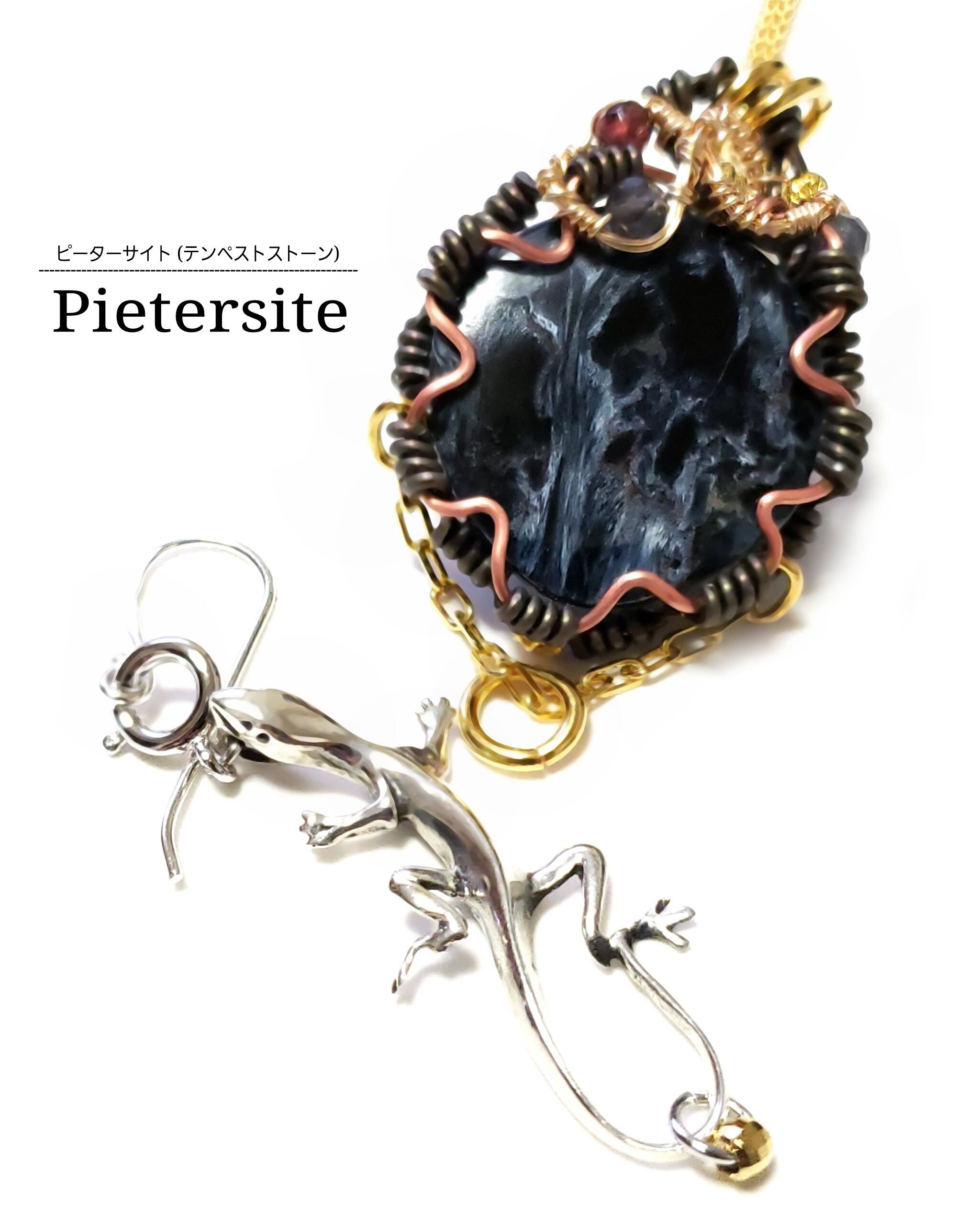 ナミビア産のピーターサイトにアイオライトとガーネット、そして、silver製蜥蜴チャームを組み合わせ、ゴールドのアーティスティックワイヤーとブラックのアルマイト鍍金アルミ製ワイヤーと銅製ワイヤーを使用し、ペンダントトップにデザインしました。