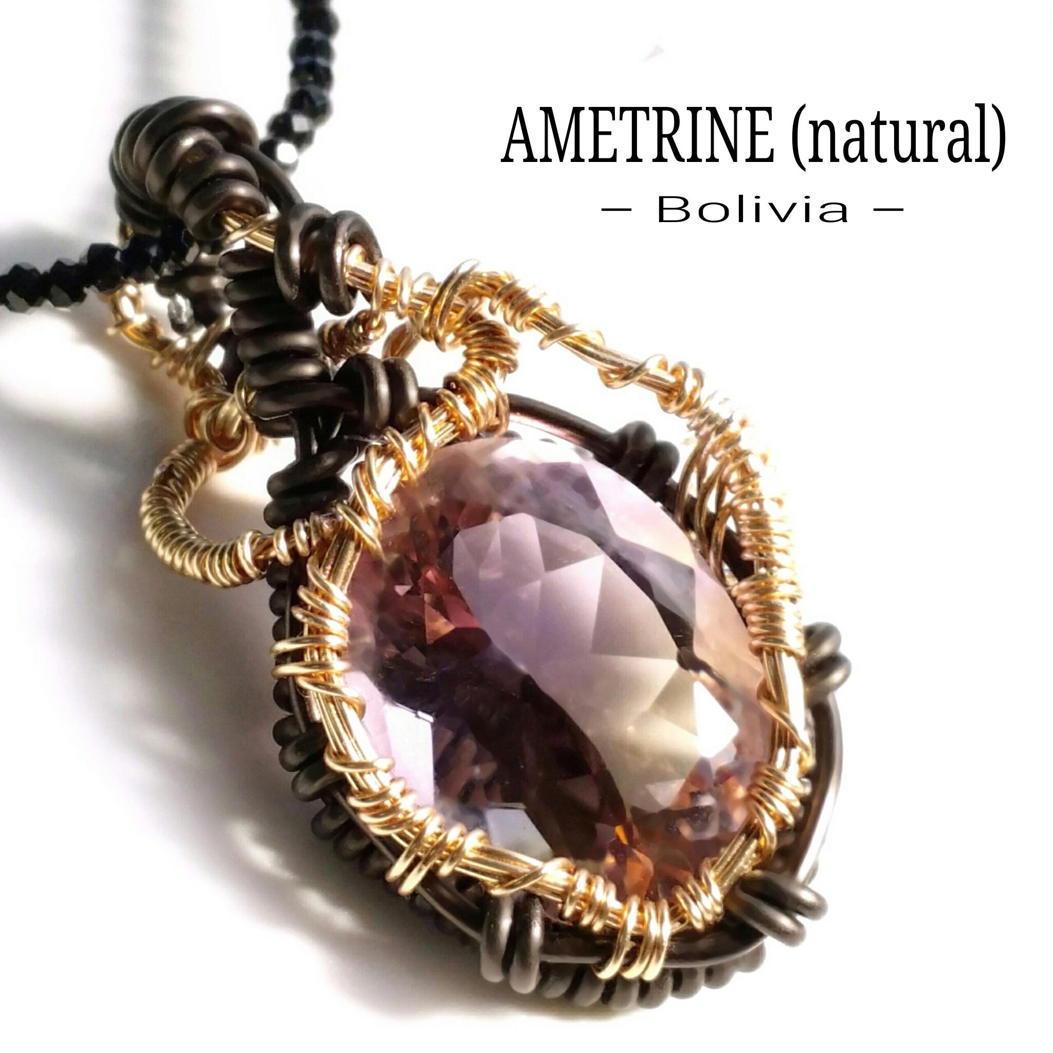 美しい色合いを持つ2色の水晶のボリビア産アメトリンを、ゴールドのアーティスティックワイヤーとアルマイト鍍金アルミ製ワイヤーを使用し、ペンダントトップにデザインしました。