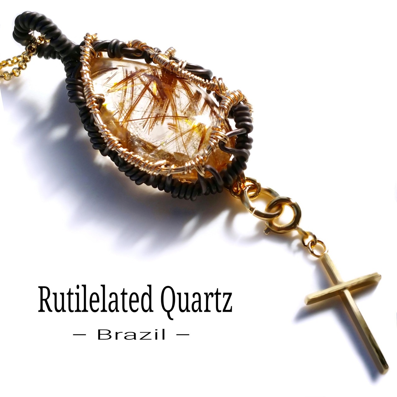 透明度の高いブラジル産の美しいルチルクォーツを、ゴールドのアーティスティックワイヤーとアルマイト鍍金アルミ製ワイヤーを使用し、ペンダントトップにデザインしました。
