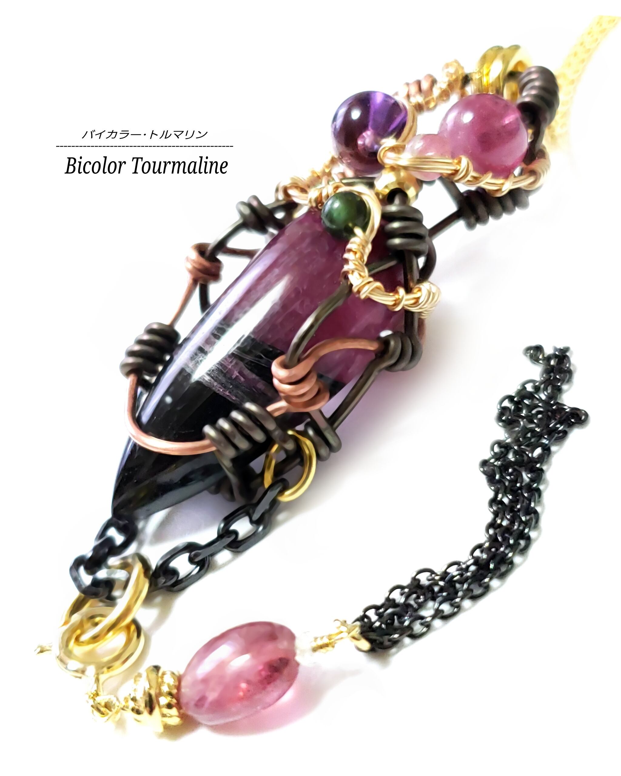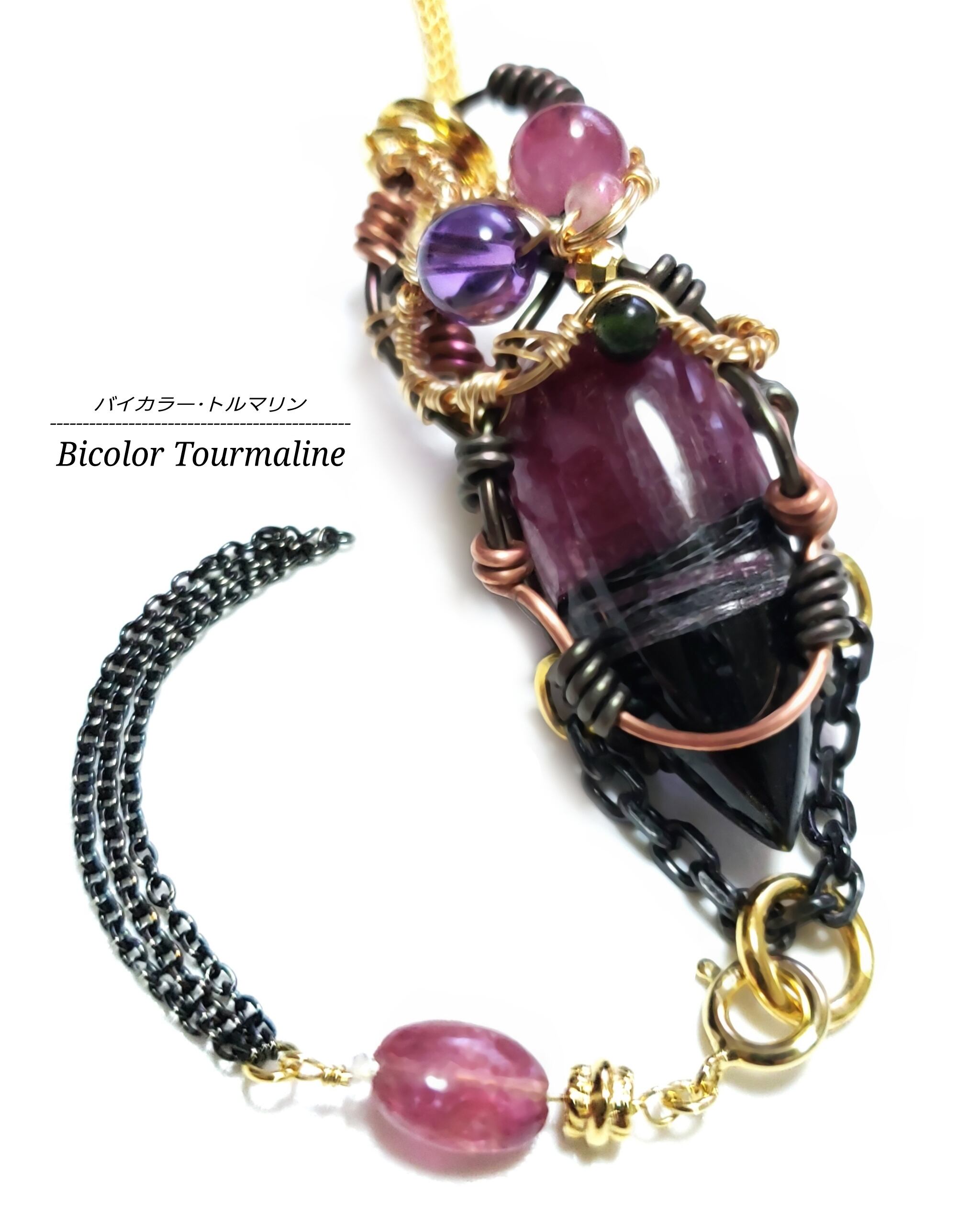 濃いクランベリー色とブラックのバイカラーのトルマリンとアメジスト、そして、ピンクトルマリンのタッセルチェーン付きチャームを組み合わせ、ゴールドのアーティスティックワイヤーと、ブラックのアルマイト鍍金アルミ製ワイヤーを使用し、ペンダントトップにデザインしました。