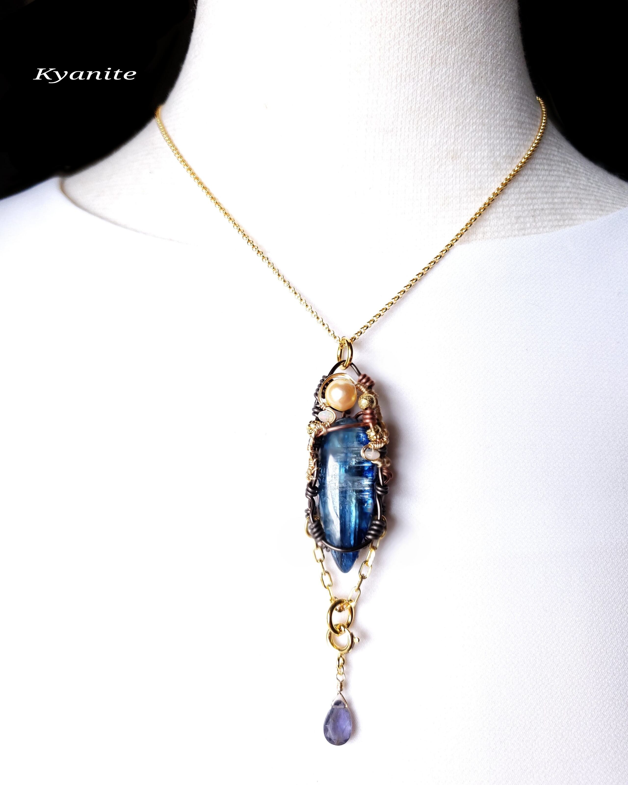 ネパール産の濃紺から青に近いグラデーションの透明感あるカイヤナイトに、伊勢志摩産アコヤ真珠(染付けと)エチオピア産オパール、そして、アイオライトのチャームを組み合わせ、ゴールドのアーティスティックワイヤーとブラックのアルマイト鍍金アルミ製ワイヤーと銅製ワイヤーを使用し、ペンダントトップにデザインしました。