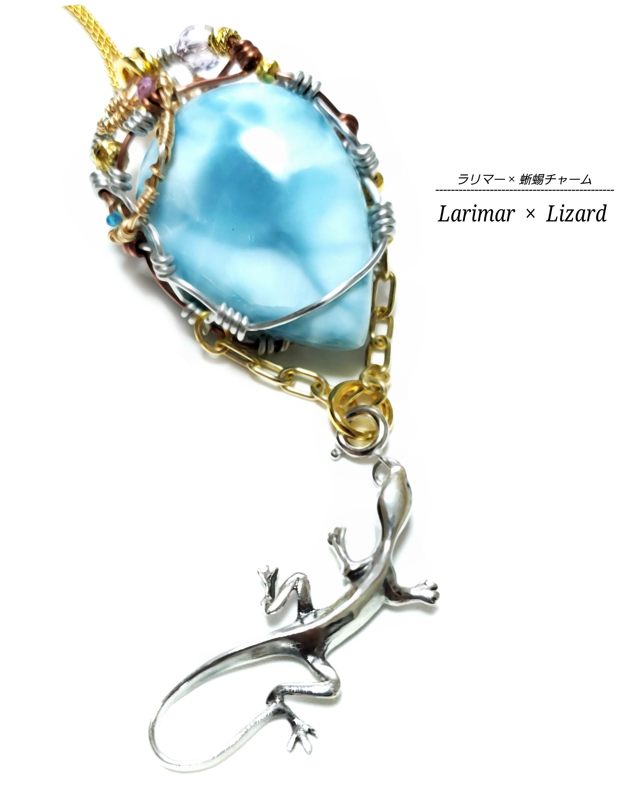 ラリマー&蜥蜴チャームのワイヤーアート・ペンダント