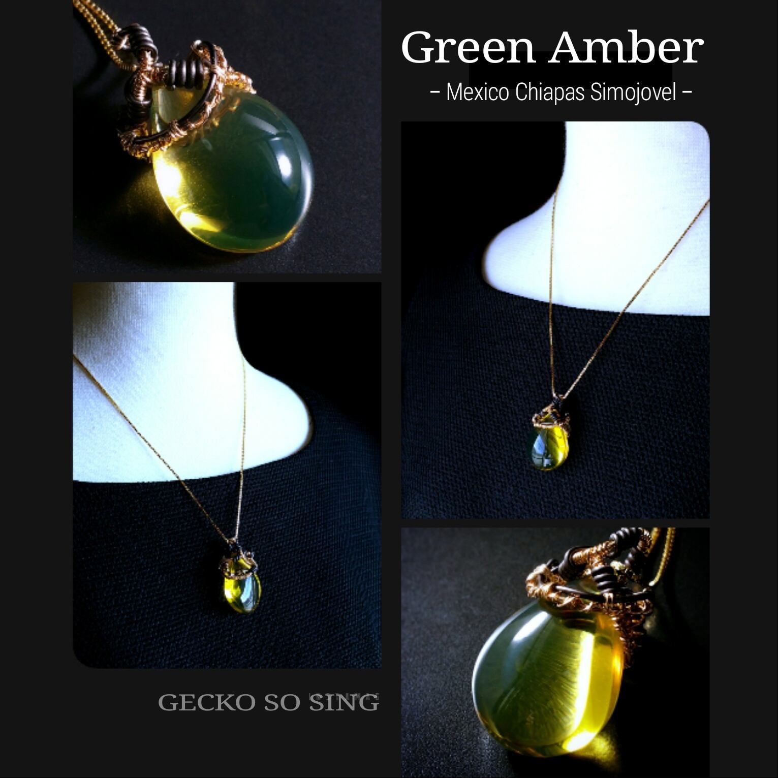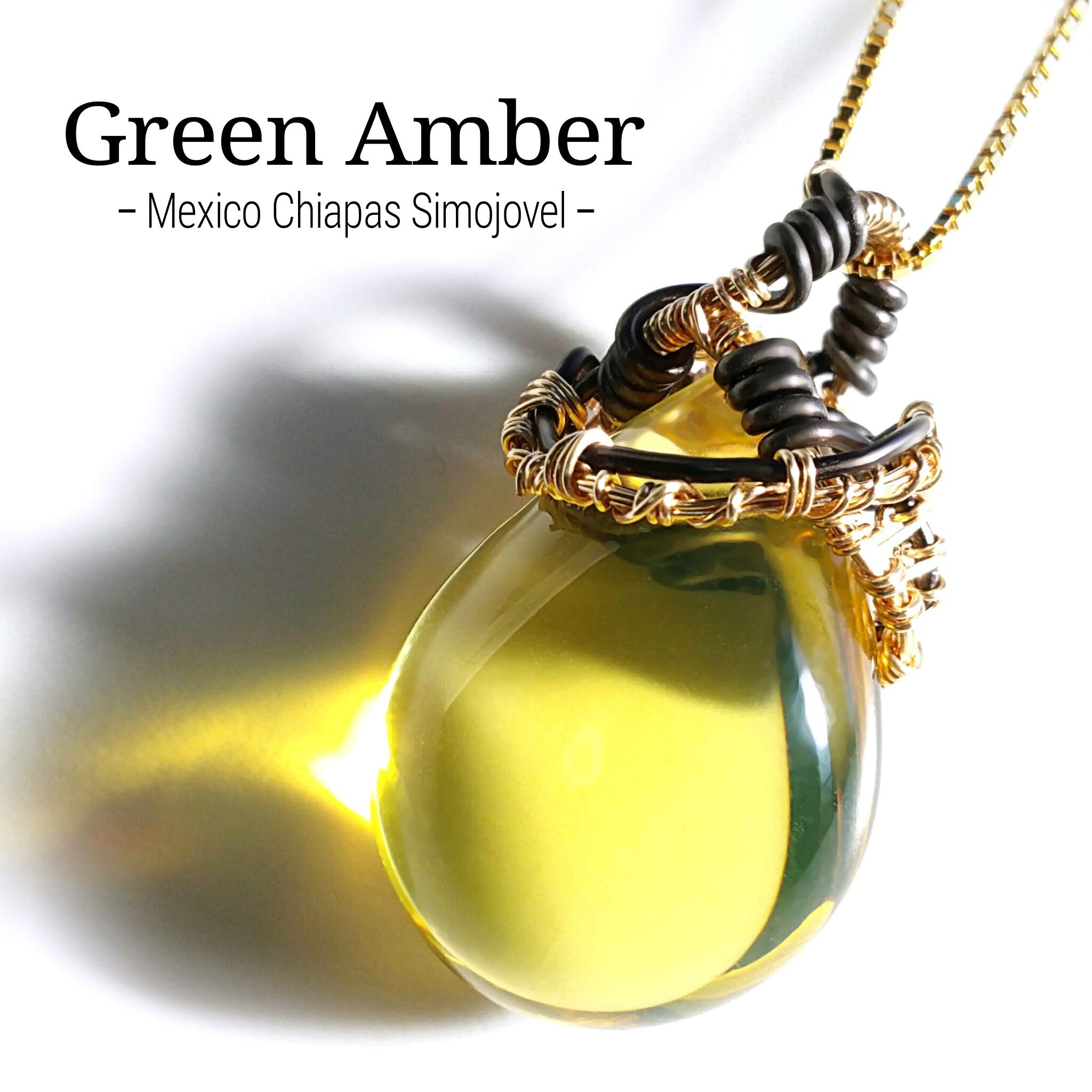 メキシコはチアパス州シモホルベ鉱山産のグリーンアンバーを、ゴールドのアーティスティックワイヤーとアルマイト鍍金のアルミニウム製ワイヤーを使用し、ペンダントトップにデザインしました。