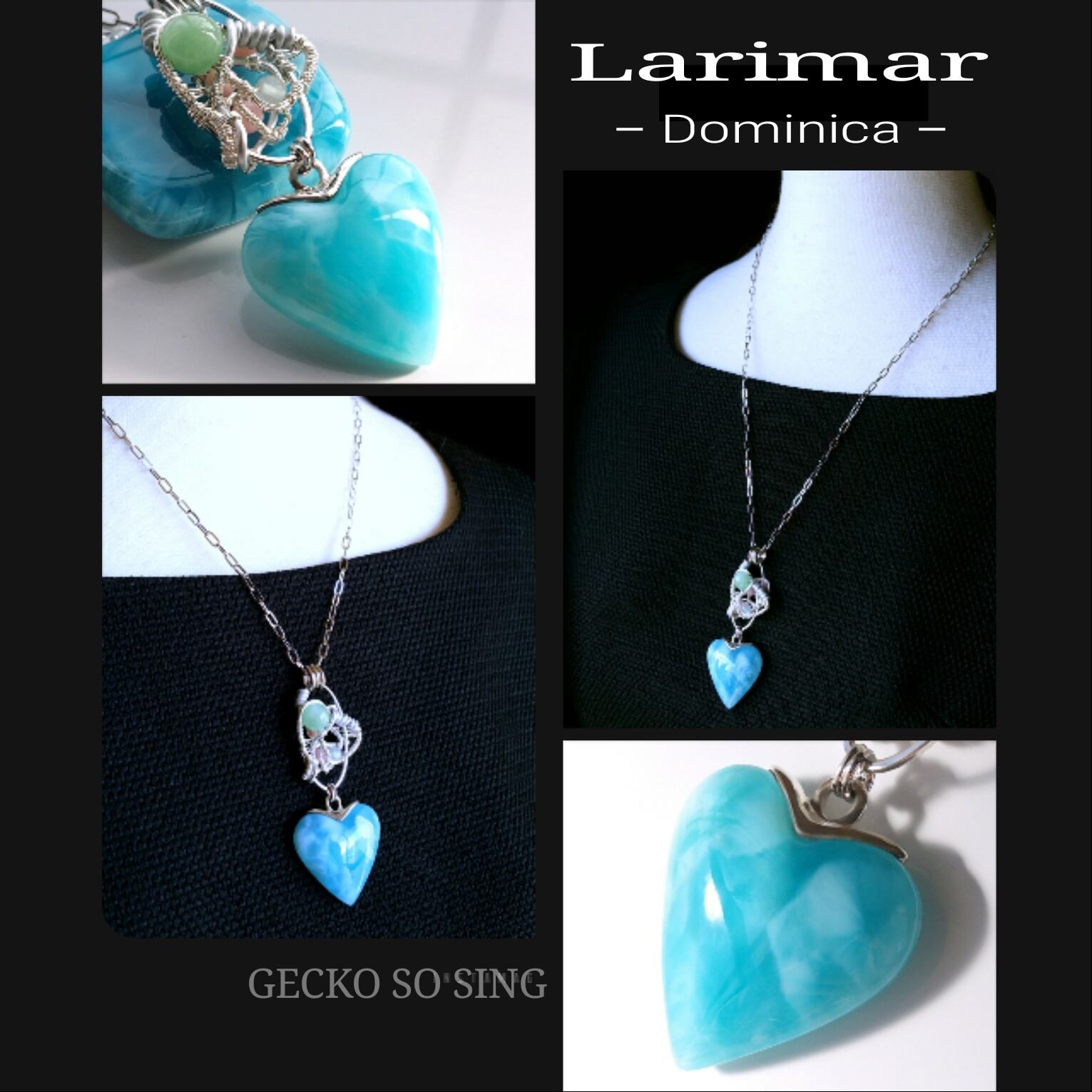 美しい透明感あふれるハートシェイプのラリマーを、シルバーのアーティスティックワイヤーとアルマイト鍍金アルミ製ワイヤーを使用し、ペンダントトップにデザインしました。