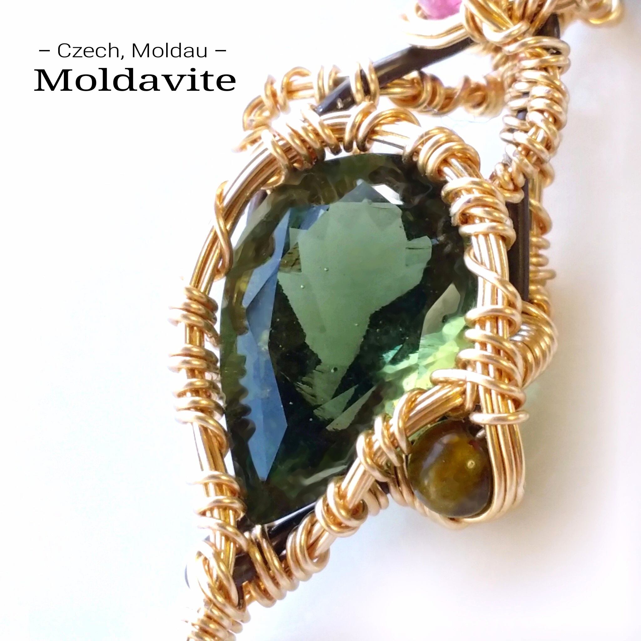 モルダバイトとガーネットを組み合わせ、ゴールドのアーティスティックワイヤーとブラックのアルマイト鍍金アルミ製ワイヤーを使用し、ペンダントトップにデザインしました。