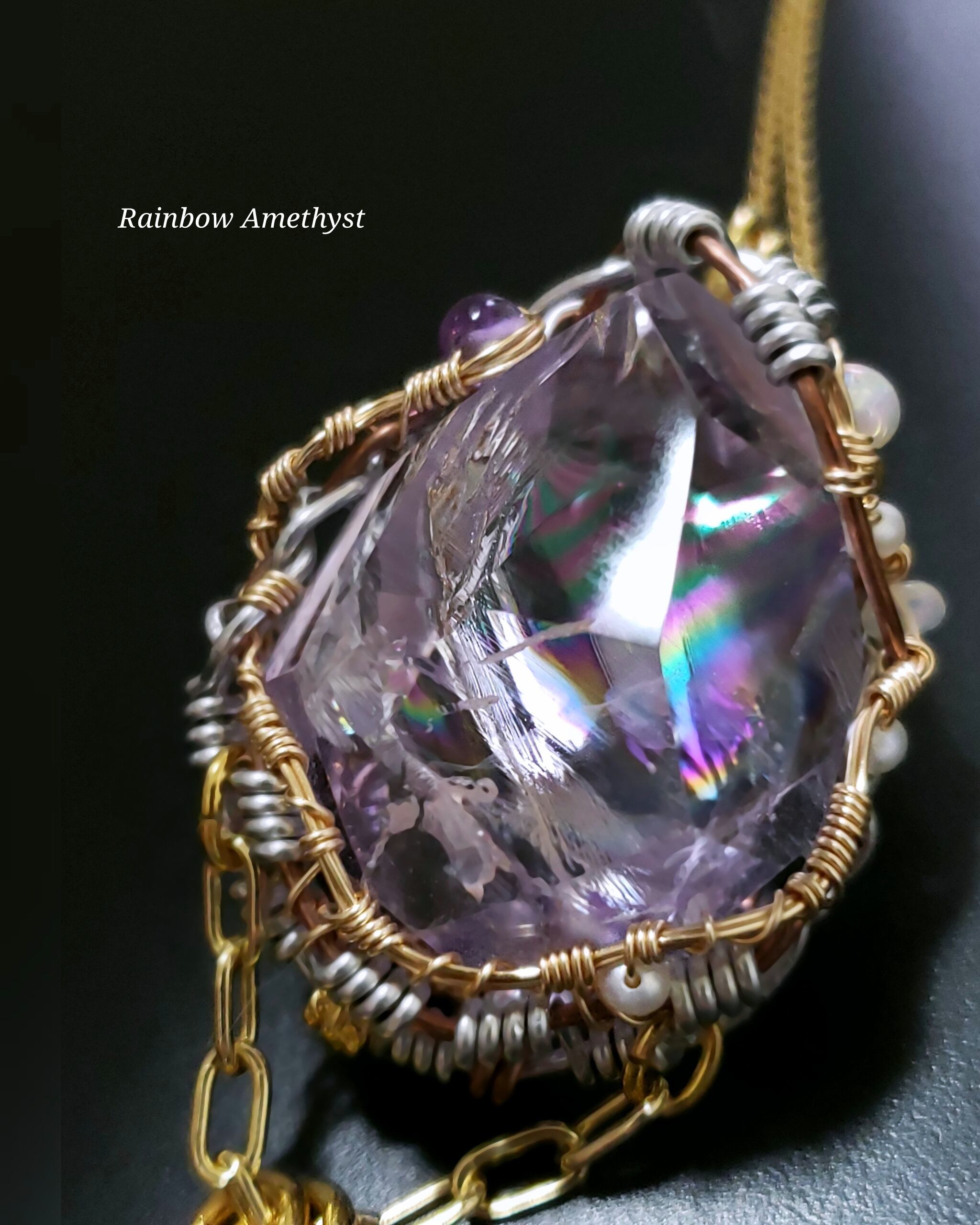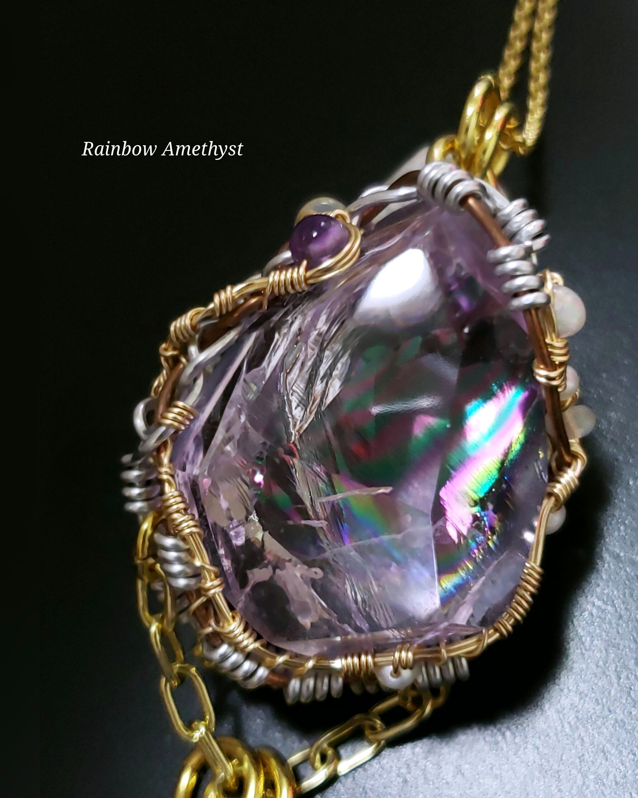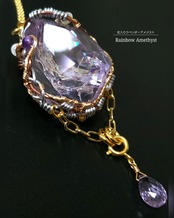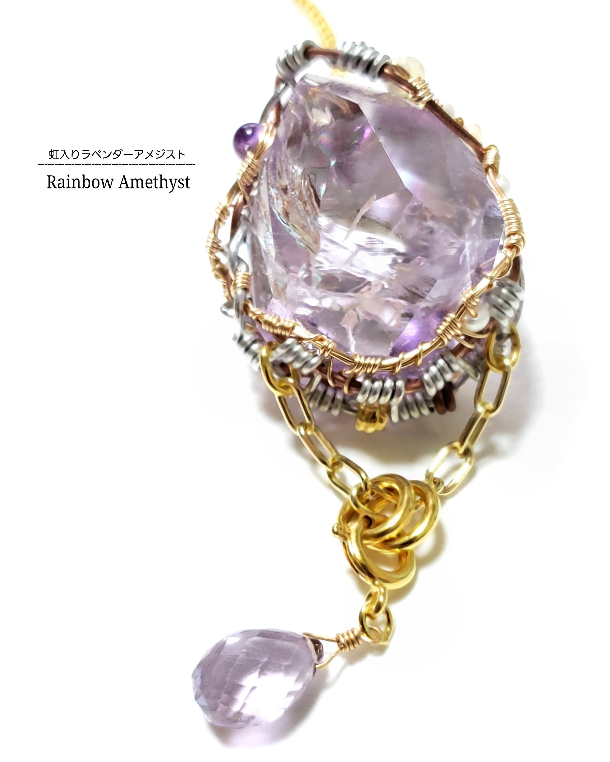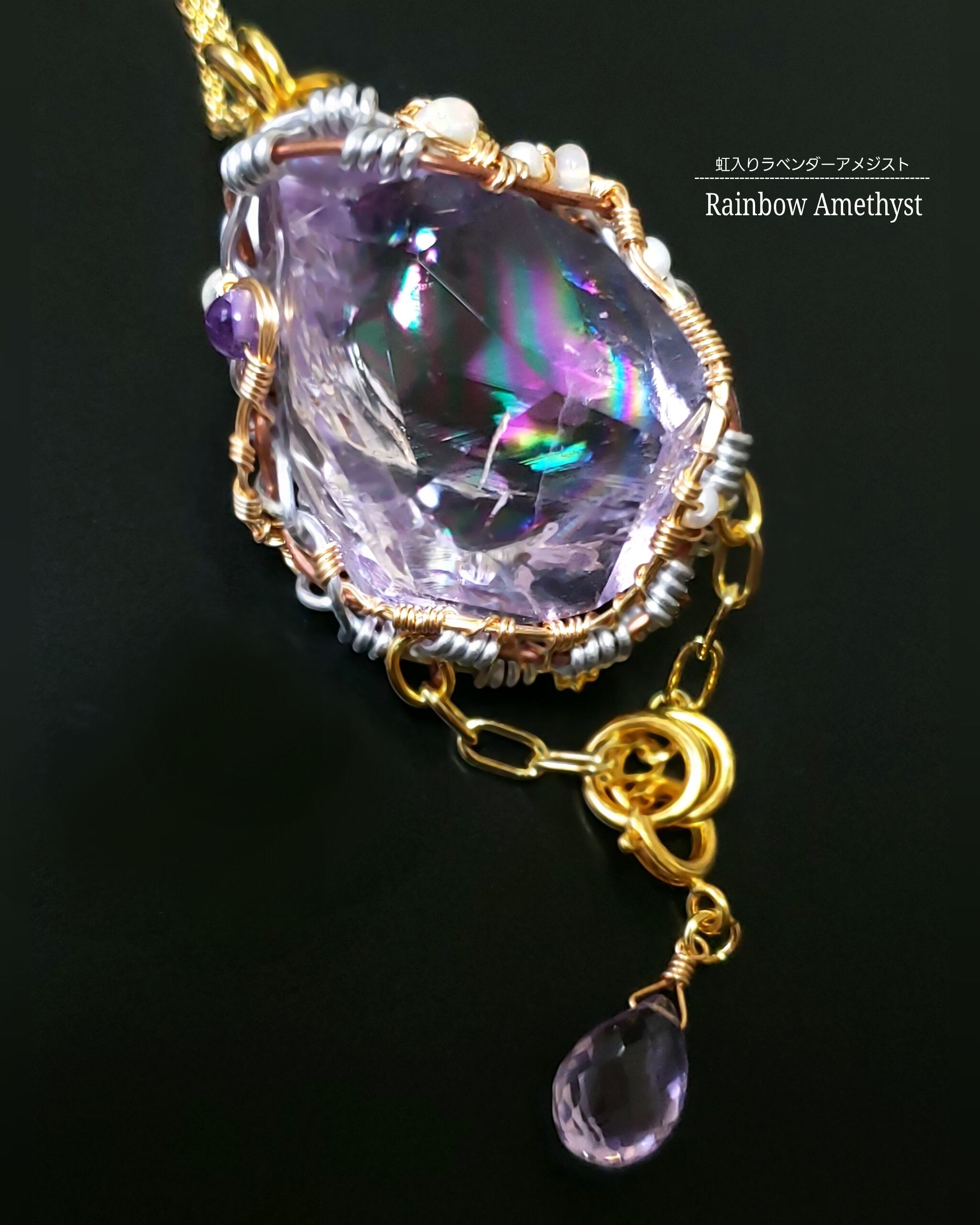 美しいレインボーが現れるラベンダーアメジストにアメジストとエチオピアンオパールと淡水パール、そして、ラベンダーアメジストのチャームを組み合わせ、ゴールドのアーティスティックワイヤーとアルミ製ワイヤーと銅製ワイヤーを使用し、ペンダントトップにデザインしました。