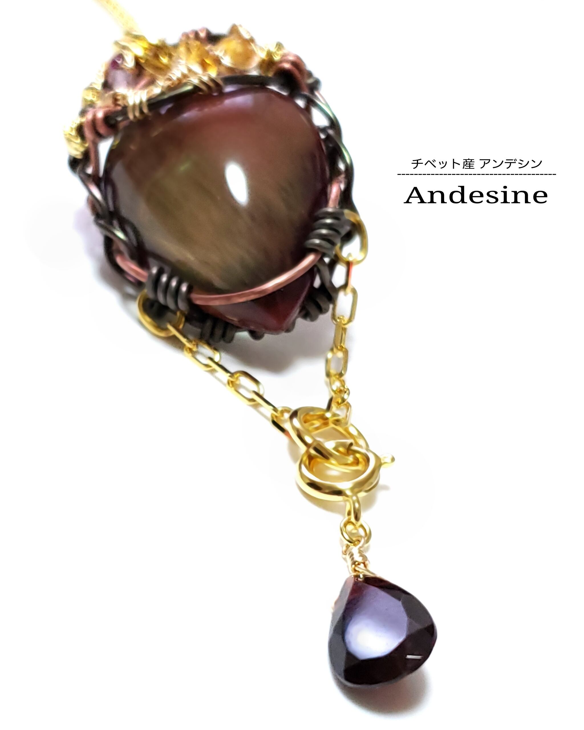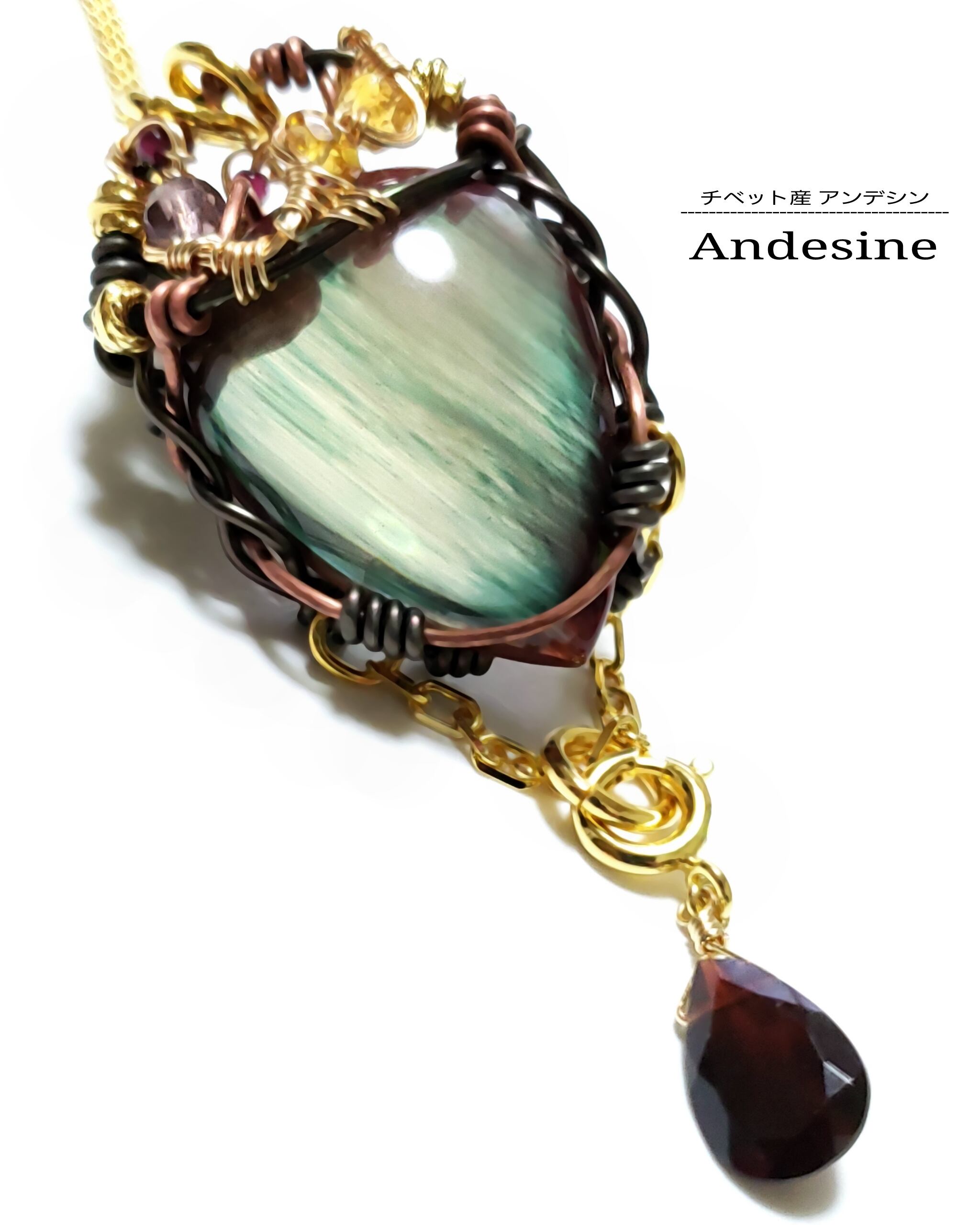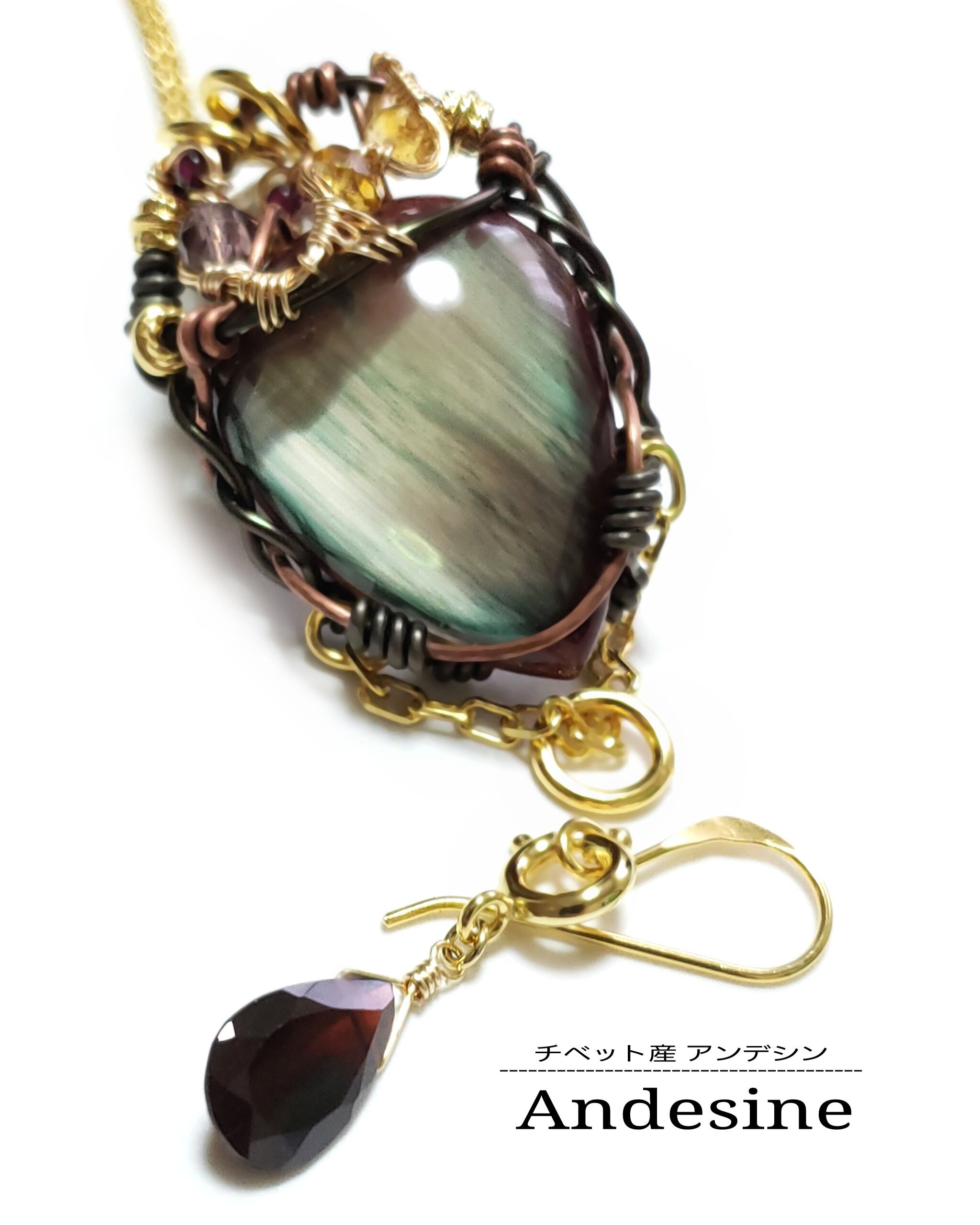 チベット産のアンデシンにシトリンとガーネットとフローライト、そして、ガーネットのチャームを組み合わせ、ゴールドのアーティスティックワイヤーとブラックのアルマイト鍍金アルミ製ワイヤーと銅製ワイヤーを組み合わせ、ペンダントトップにデザインしました。