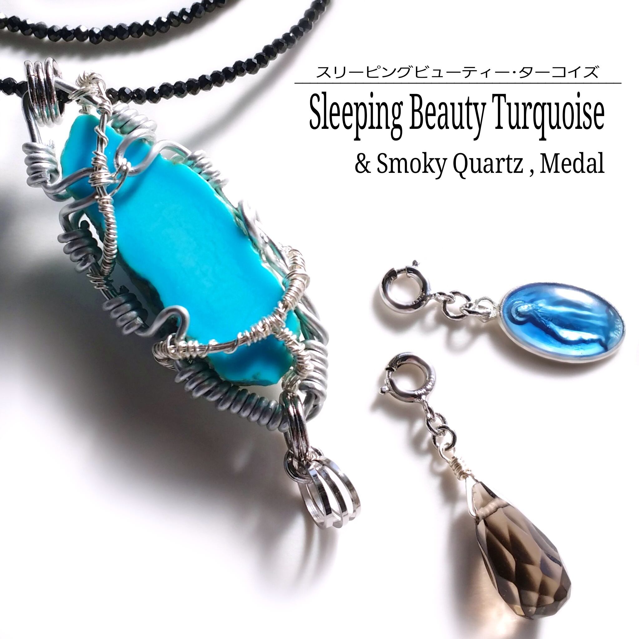 スリーピングビューティー・ターコイズ&メダイ&スモーキークォーツのワイヤーアート・ペンダント