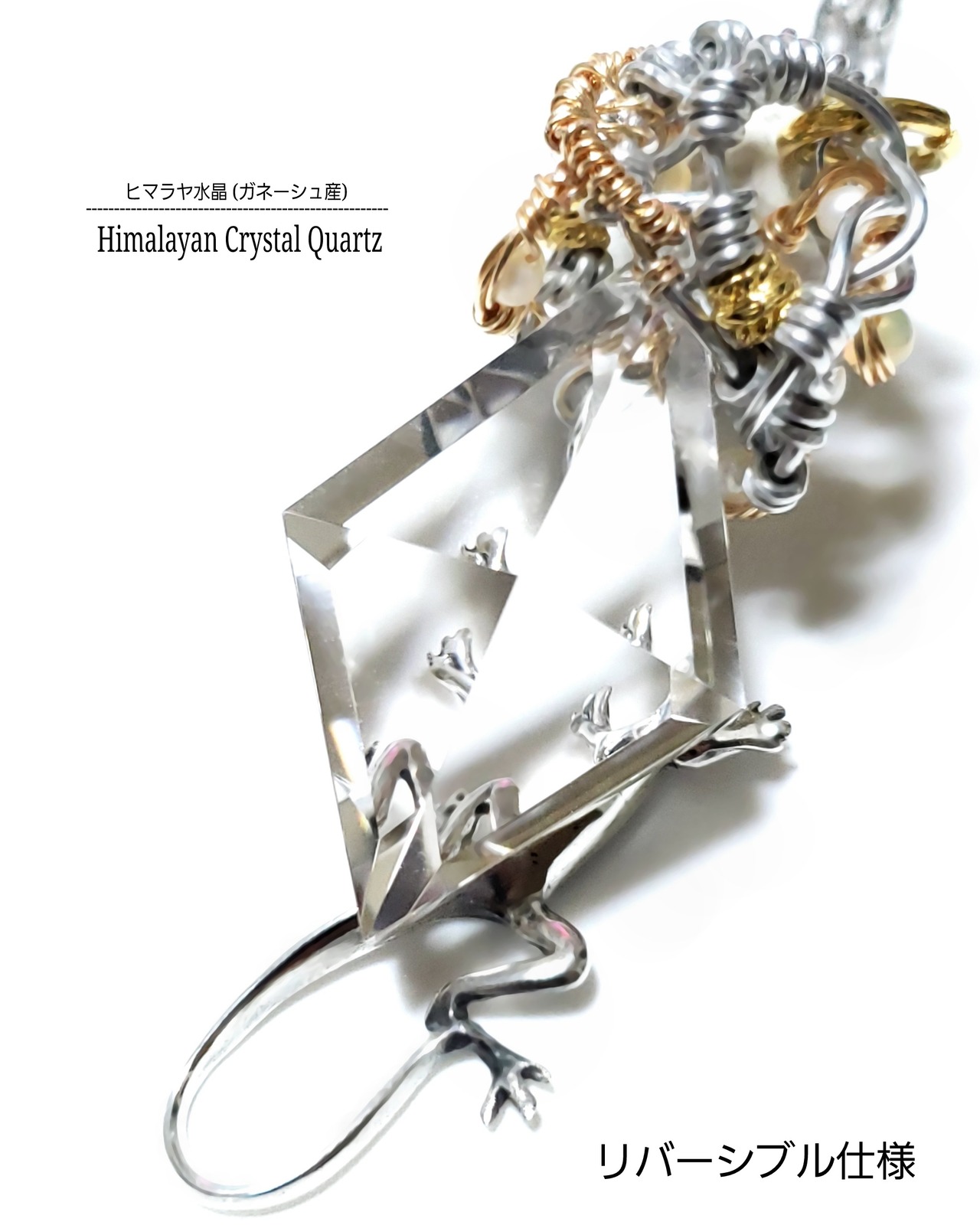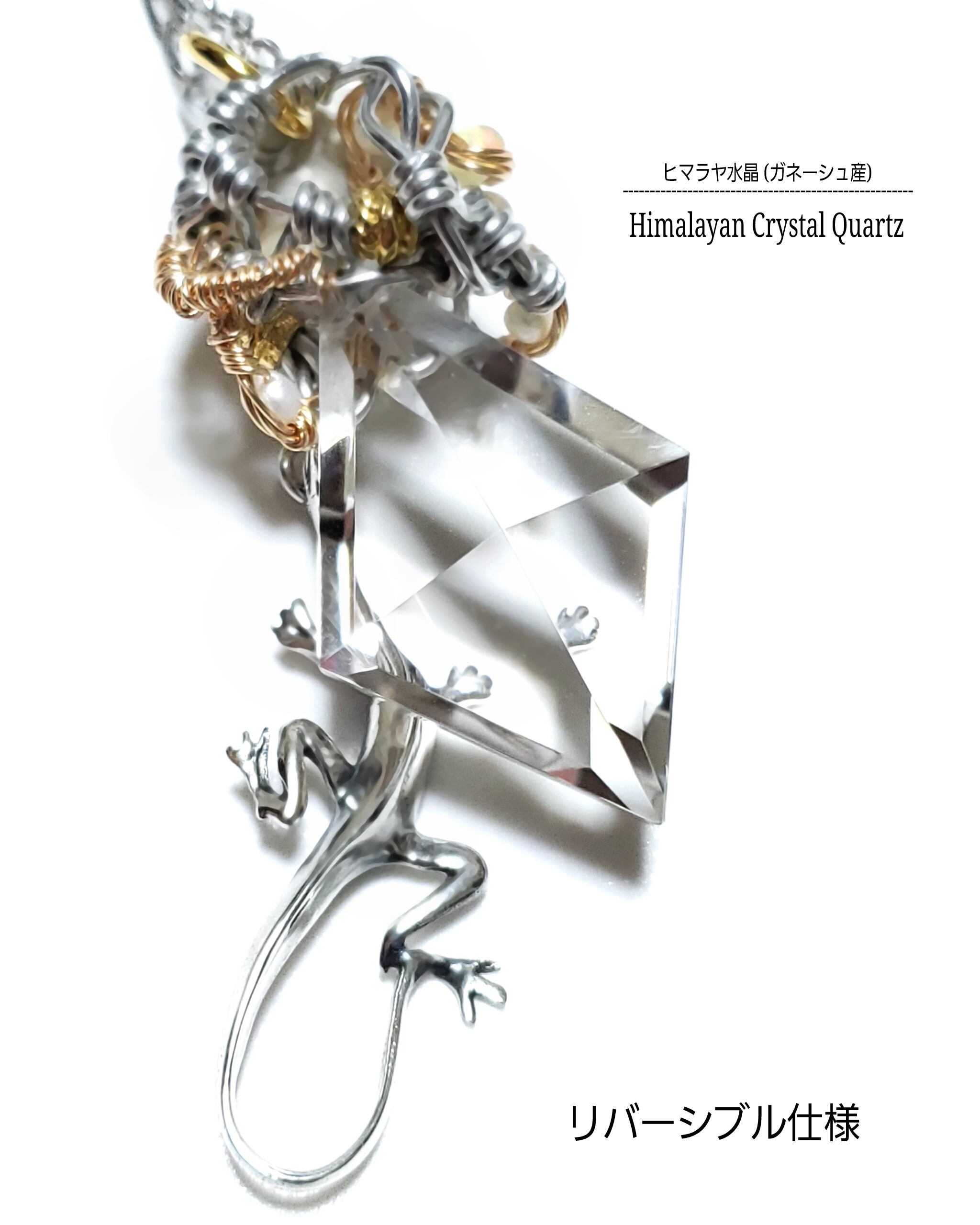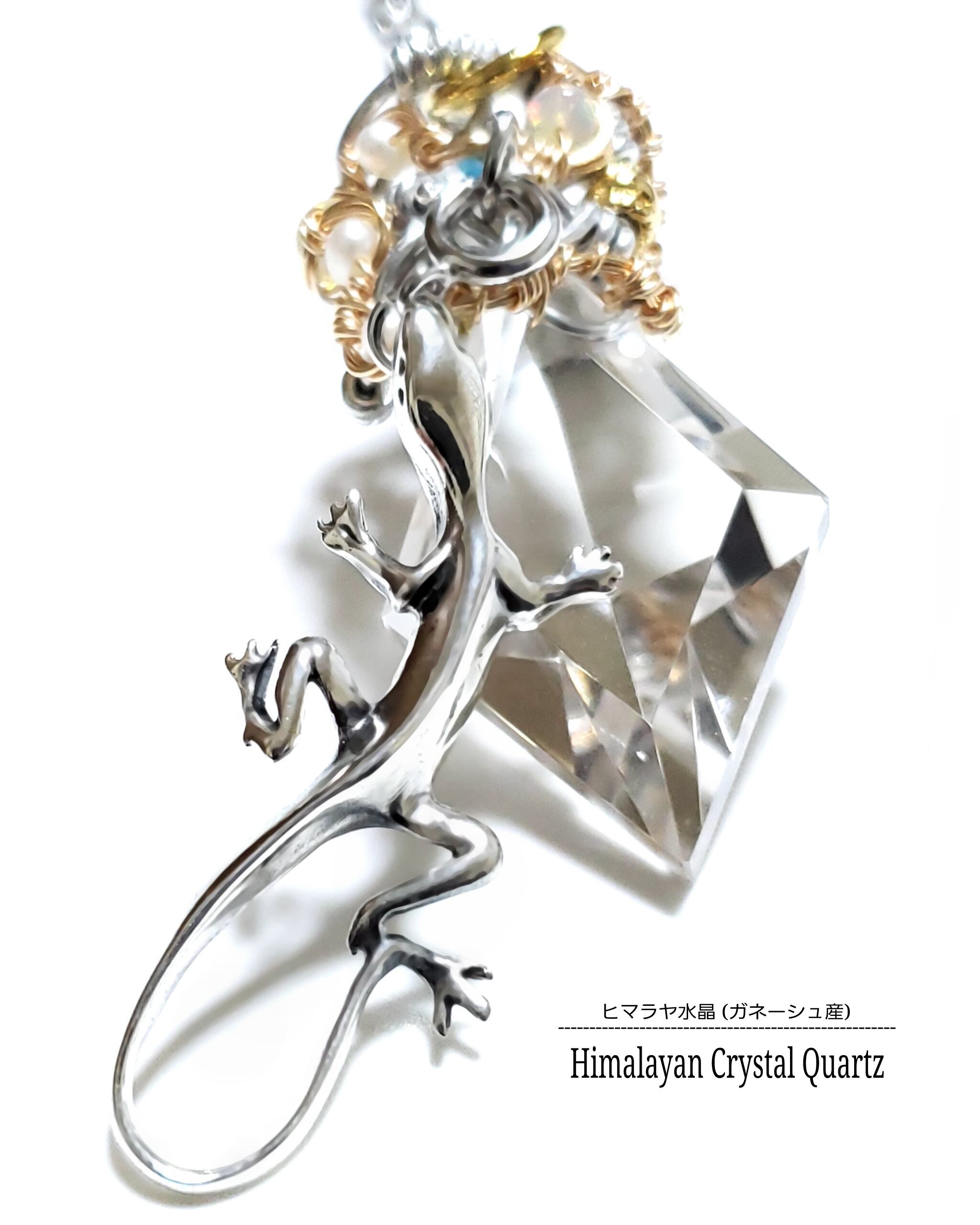 ネパールはガネーシュヒマール産ヒマラヤ水晶にエチオピアンオパールと淡水パールとブルーアパタイト、そして、Silver製蜥蜴チャームを組み合わせ、アーティスティックワイヤーとアルマイト鍍金アルミ製ワイヤーを使用して、ペンダントにデザインしました。