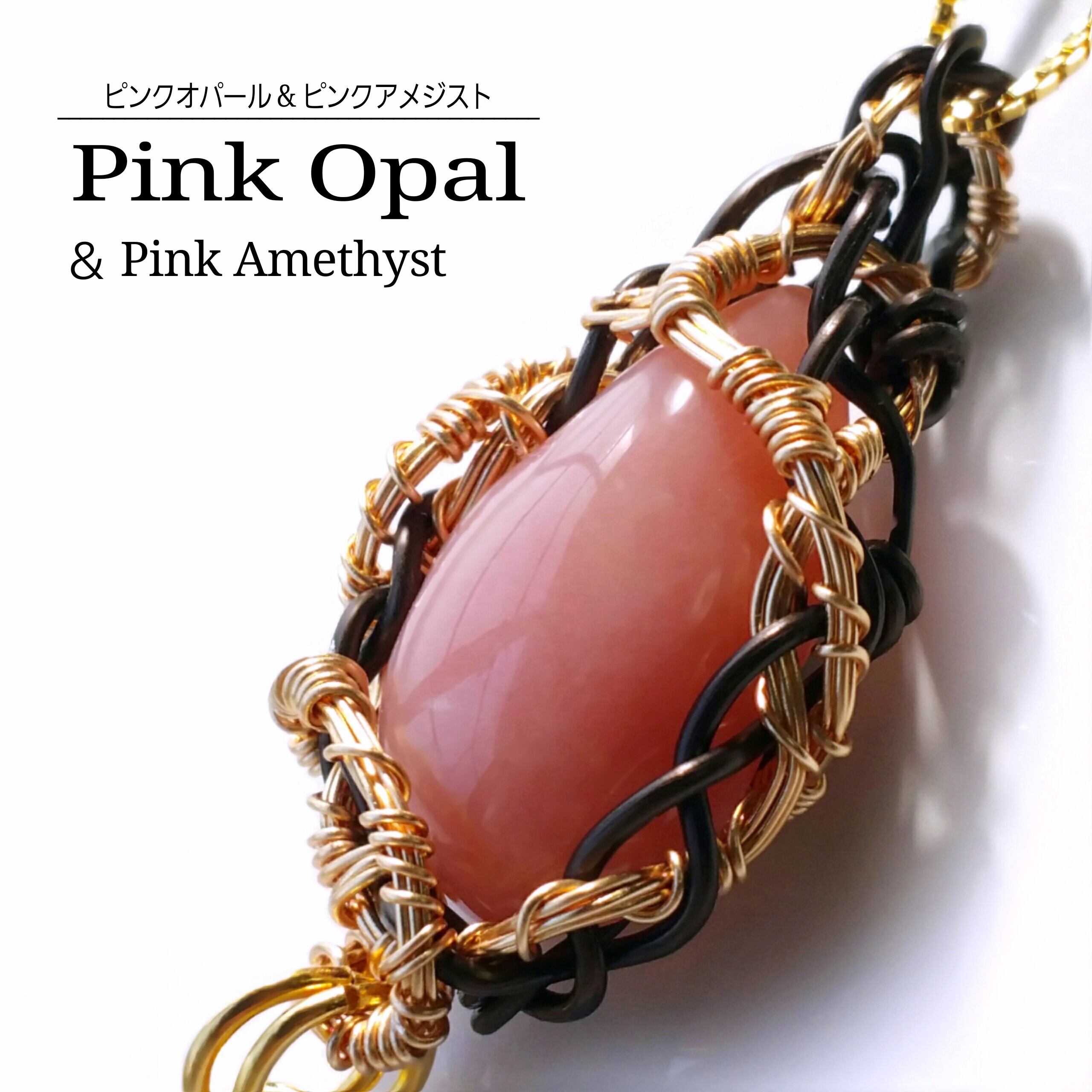 女性をより美しく品良く装わせてくれるピンクオパールとピンクアメジストのチャームを組み合わせ、ゴールドのアーティスティックワイヤーとブラックのアルマイト鍍金アルミ製ワイヤーを使用し、ペンダントトップにデザインしました。