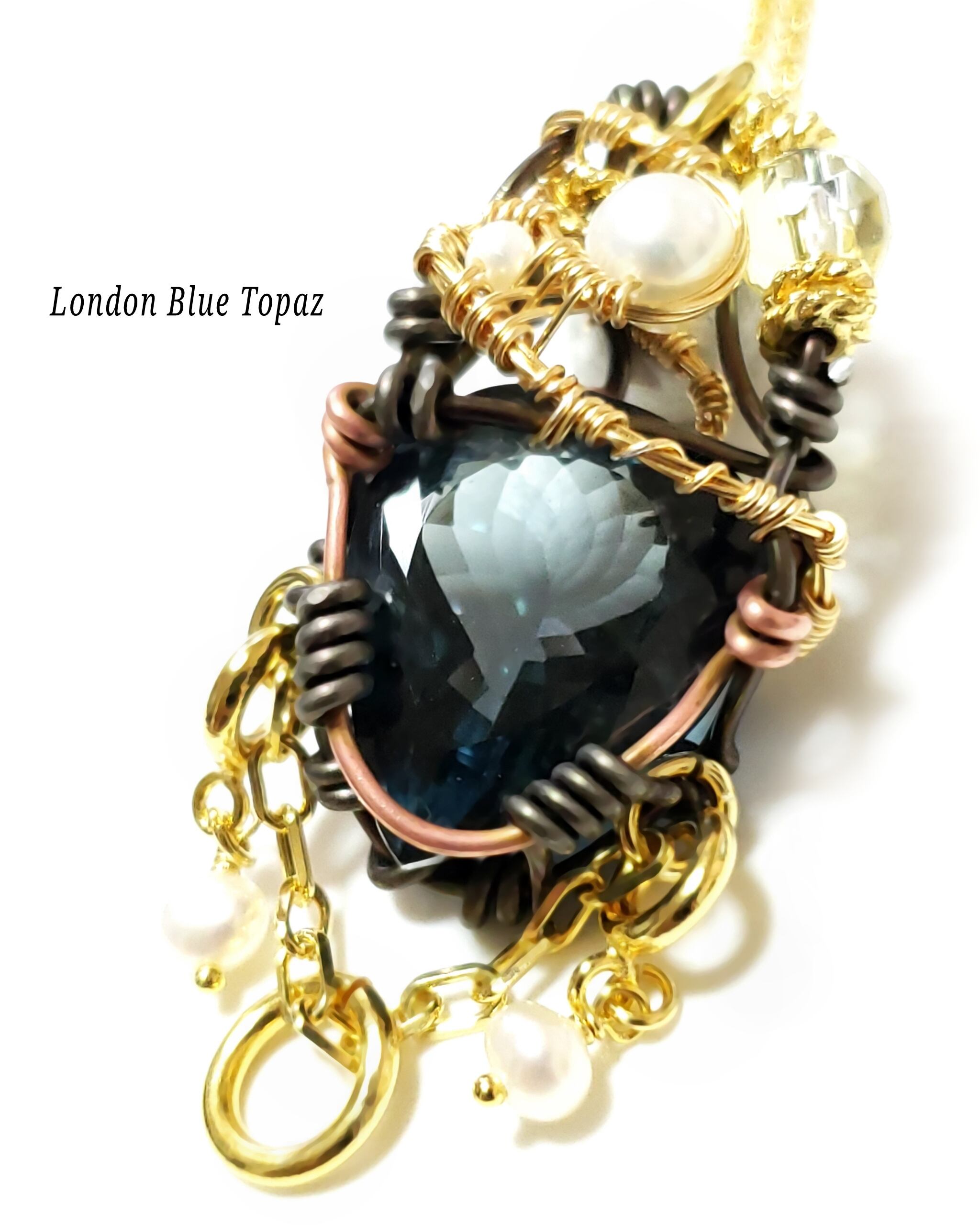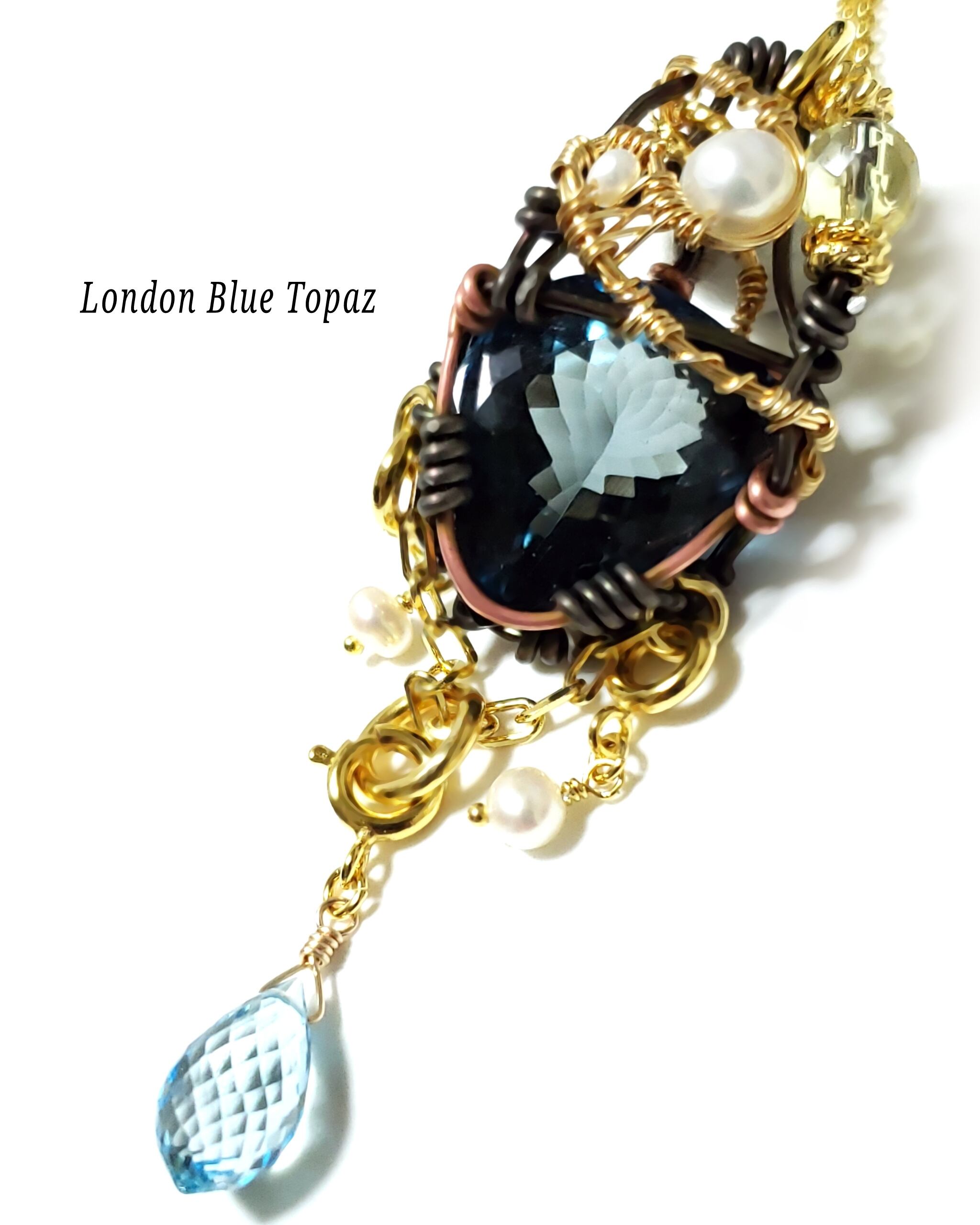 宝石質のロンドンブルートパーズに淡水パールとレモンクォーツ、そして、スイスブルートパーズのチャームと淡水パールのチャームを組み合わせ、ゴールドのアーティスティックワイヤーとブラックのアルマイト鍍金アルミ製ワイヤーと銅製ワイヤーを使用し、ペンダントトップにデザインしました。