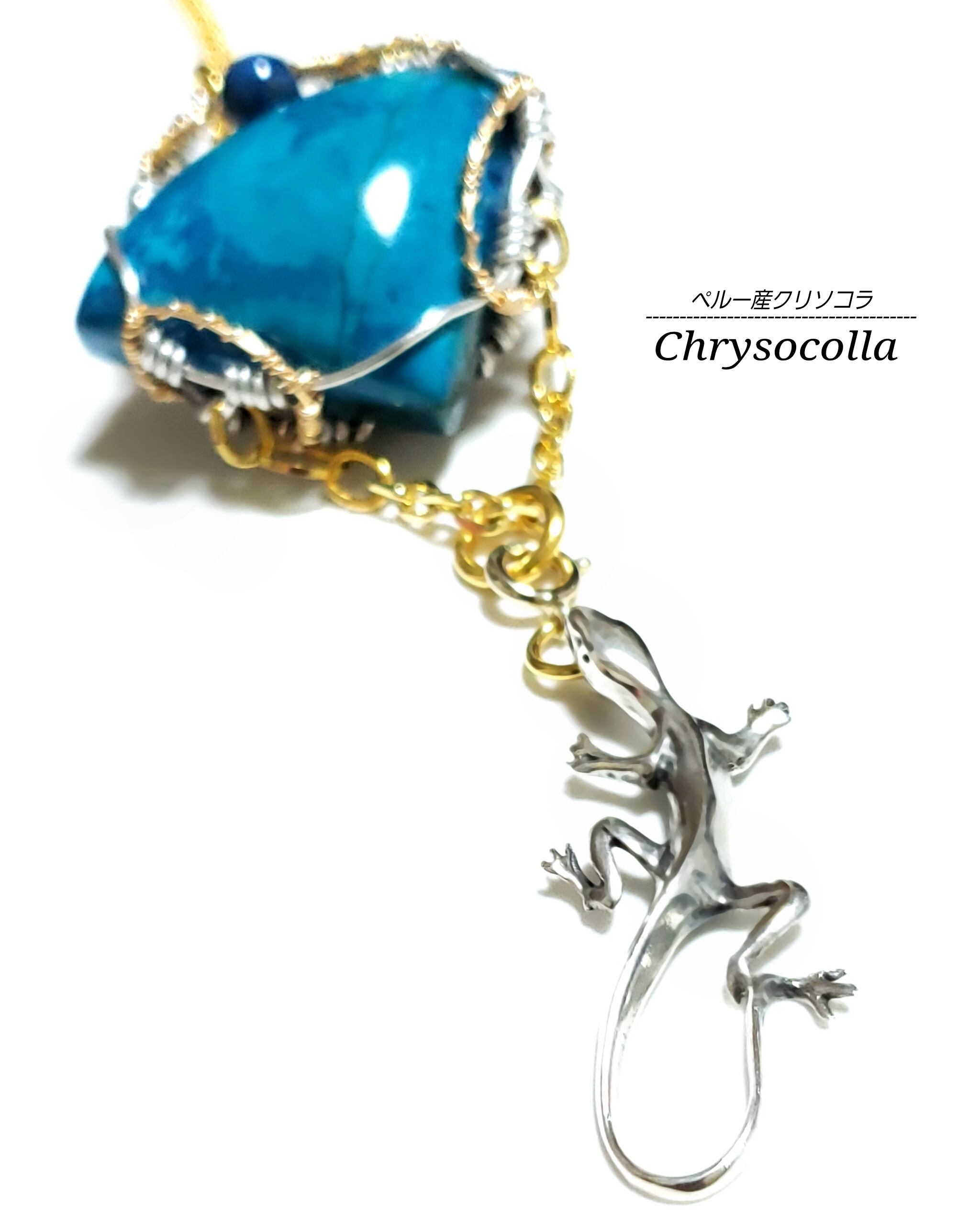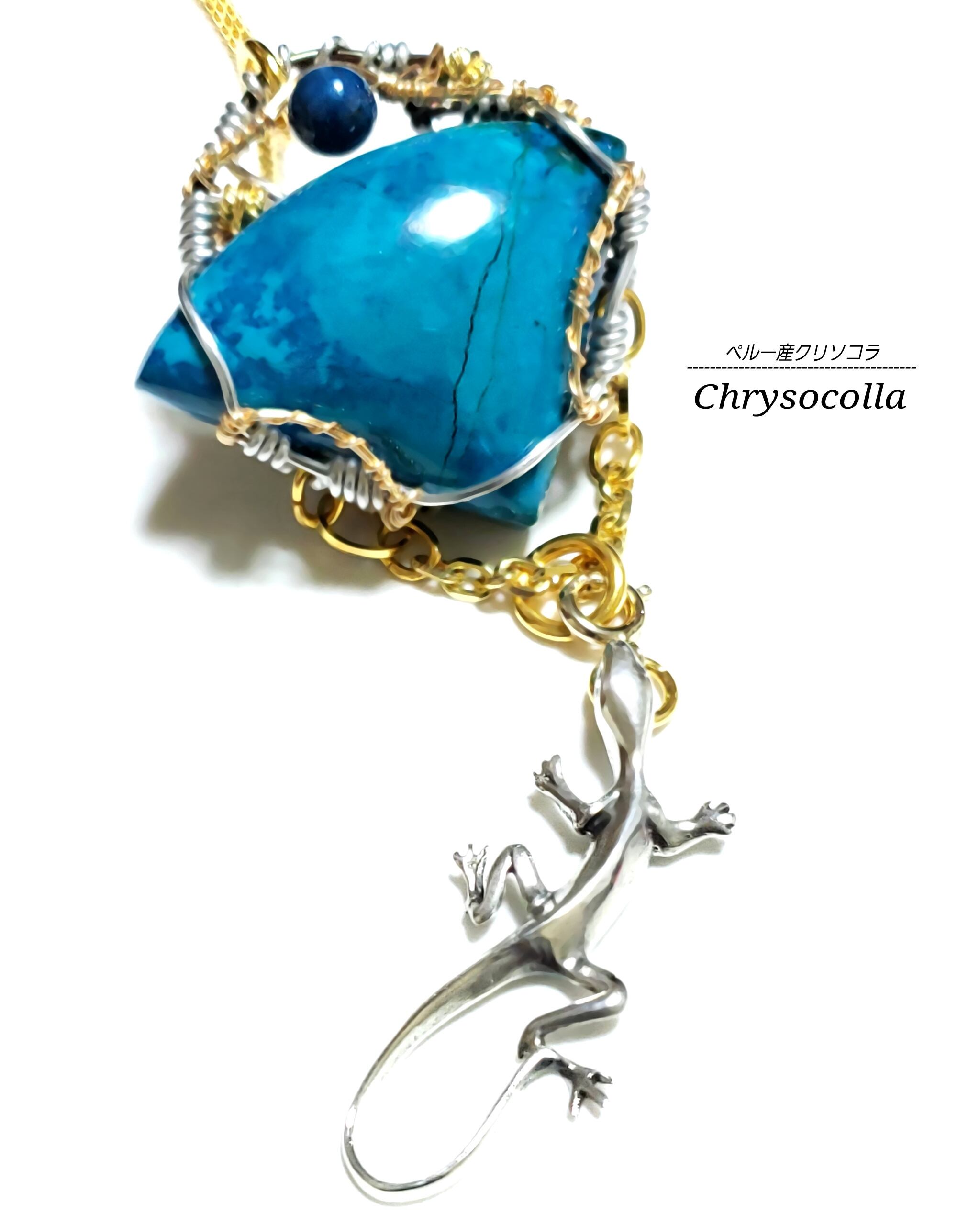 ブルーオーシャンを思わせる扇型した美しいクリソコラにクリソコラのビーズとエチオピアンオパール、そして、silver製の蜥蜴チャームを組み合わせ、ゴールドのアーティスティックワイヤーとブラックのアルマトイ鍍金アルミ製ワイヤーを使用し、ペンダントトップにデザインしました。