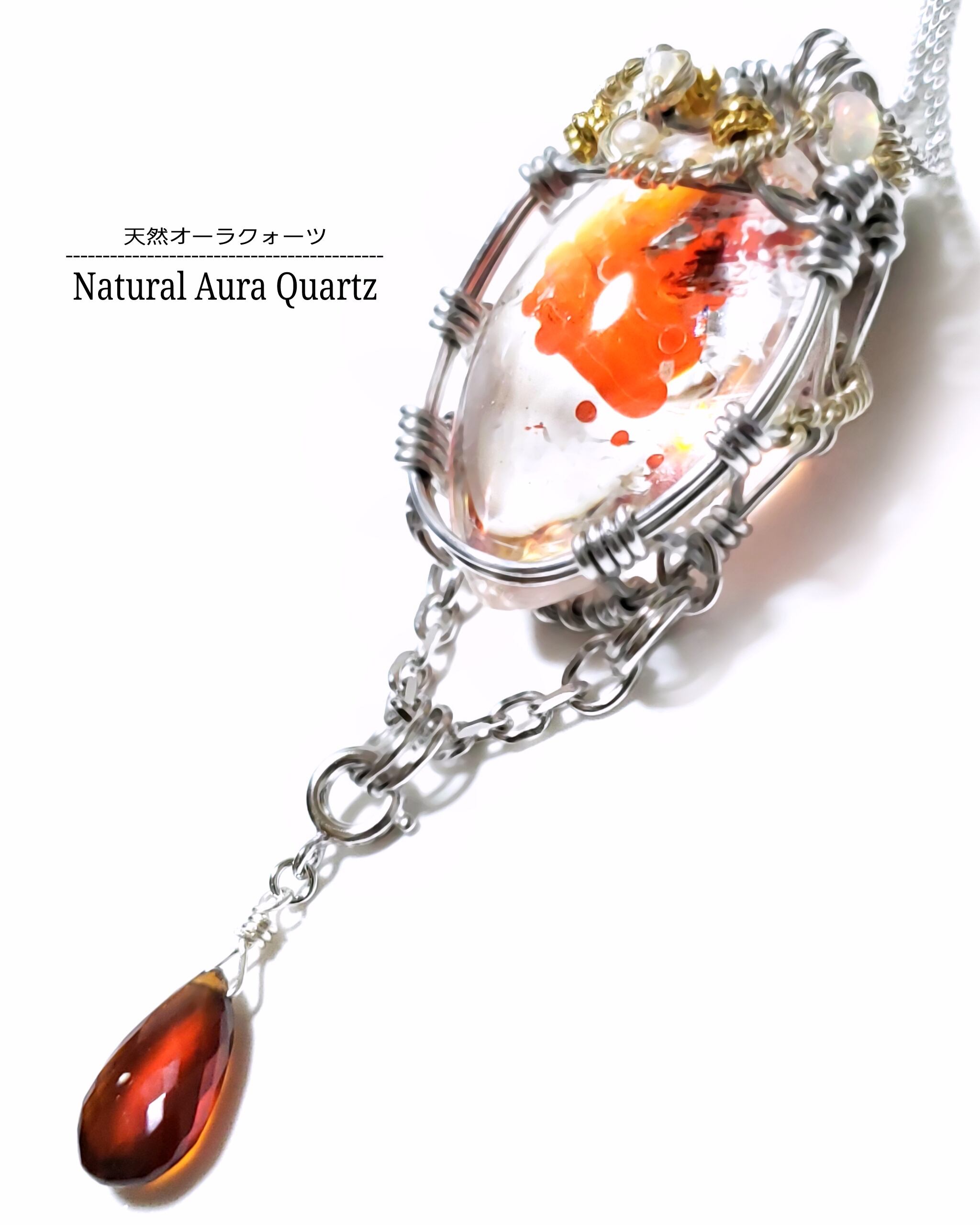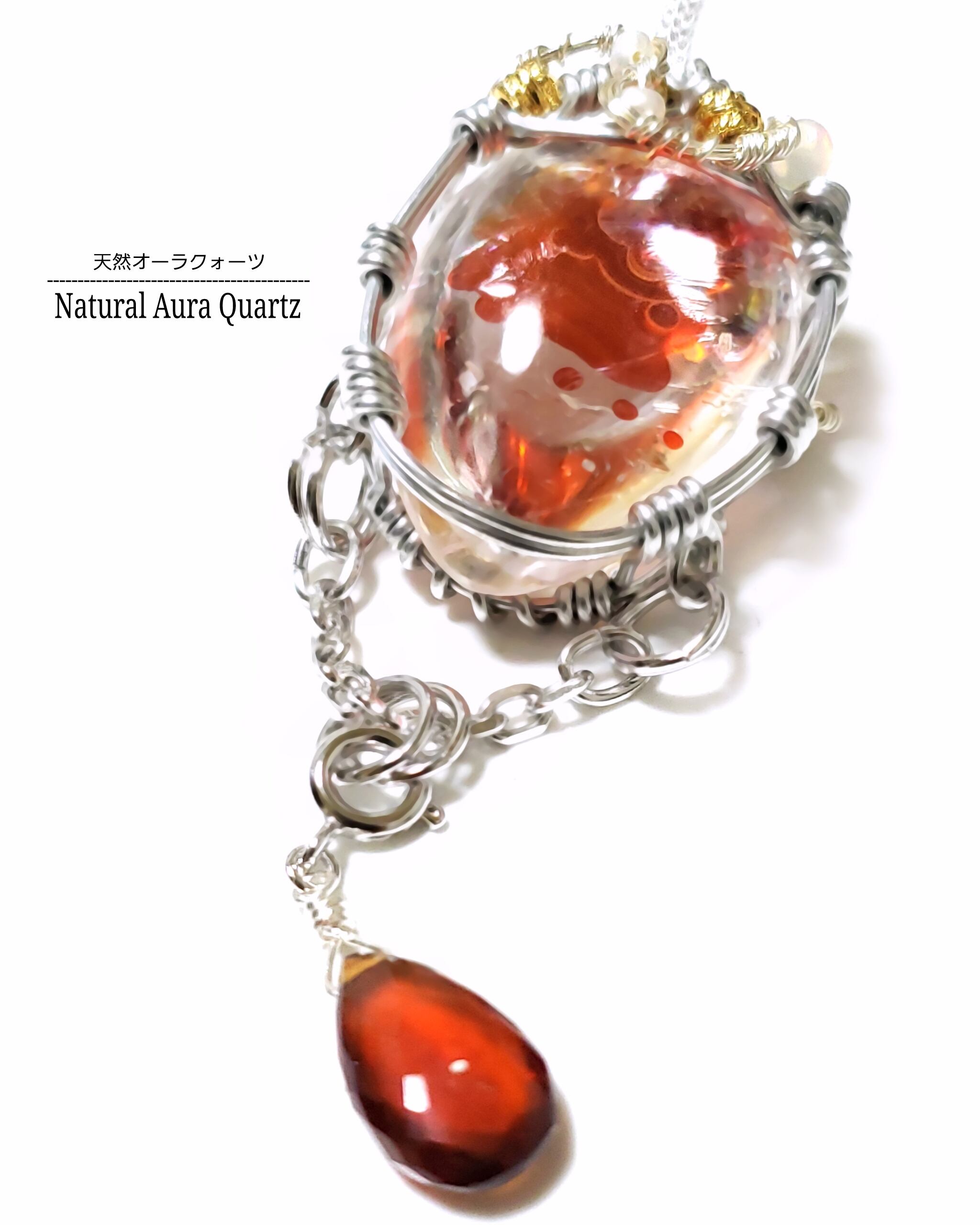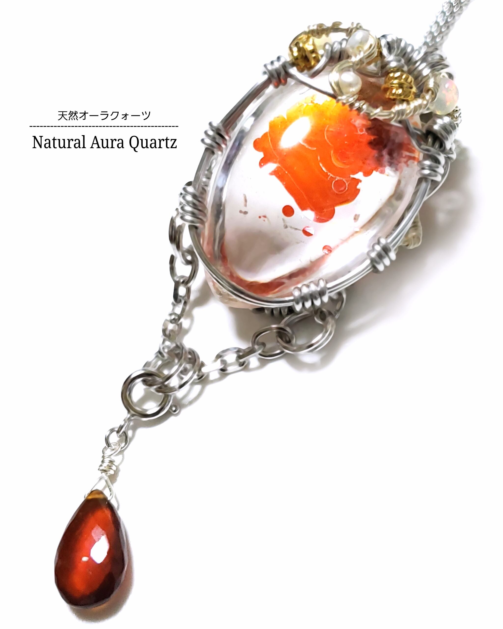 水晶の内部に赤褐色~オレンジ色のヘマタイト(赤鉄鉱)と黄色のライモナイト(褐鉄鉱)を内包した大変に珍しい水晶にエチオピアンオパールと淡水パール、そして、ガーネットのチャームを組み合わせ、シルバーのアーティスティックワイヤーとアルミ製ワイヤーを使用し、ペンダントトップにデザインしました。