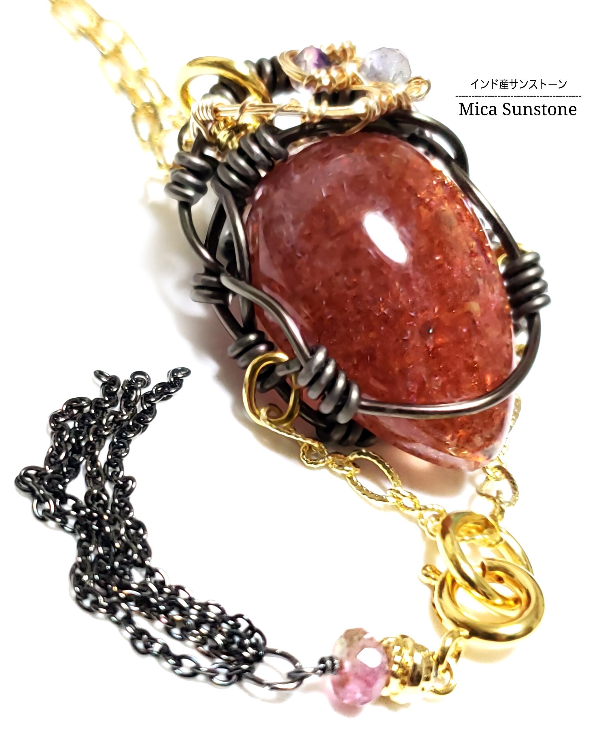 キラキラと煌めくインド産マイカサンストーンにアイオライトとフローライト、そして、トルマリンのチャームを組み合わせ、ゴールドのアーティスティックワイヤーとアルマイト鍍金アルミ製ワイヤーを使用し、ペンダントトップにデザインしました。