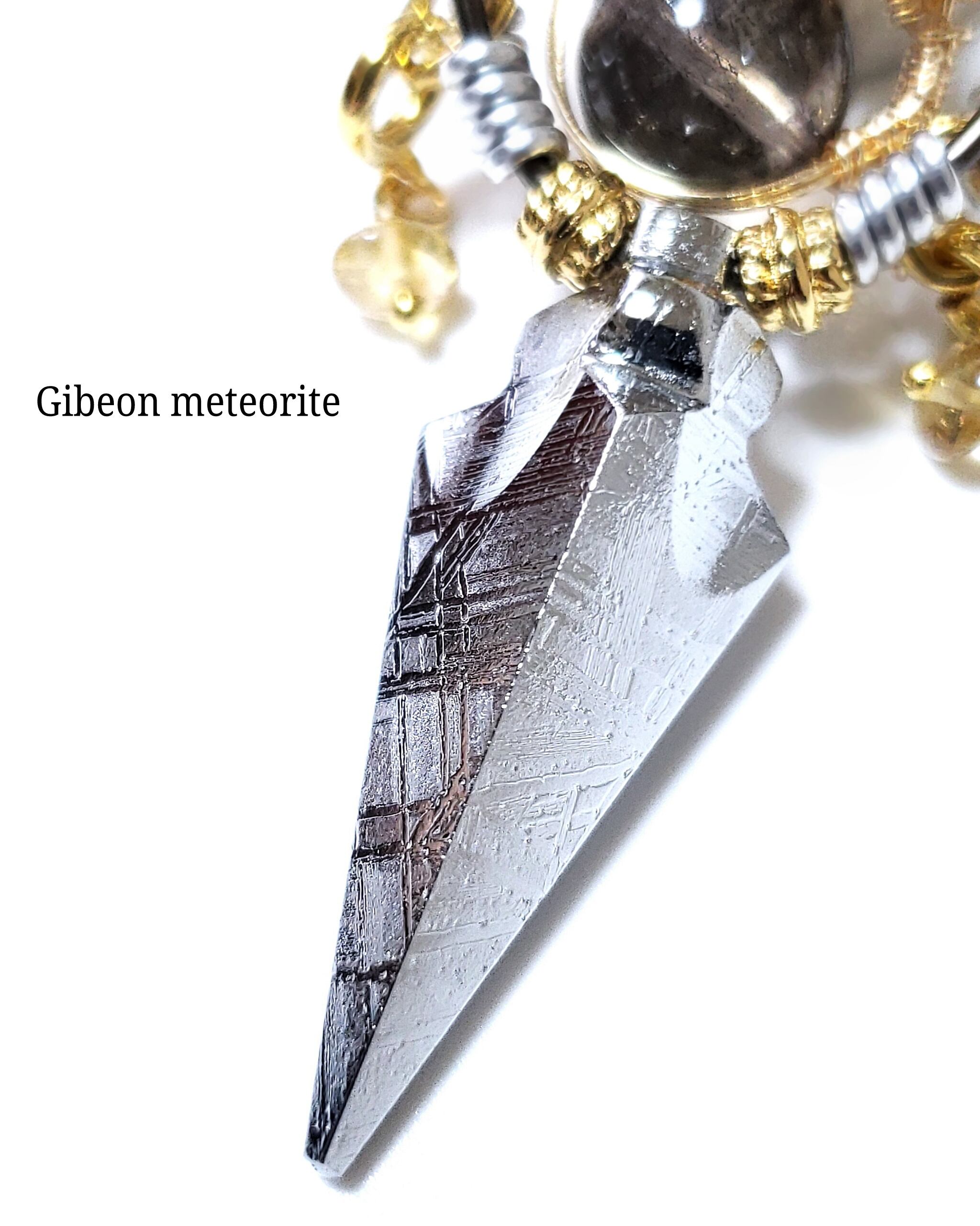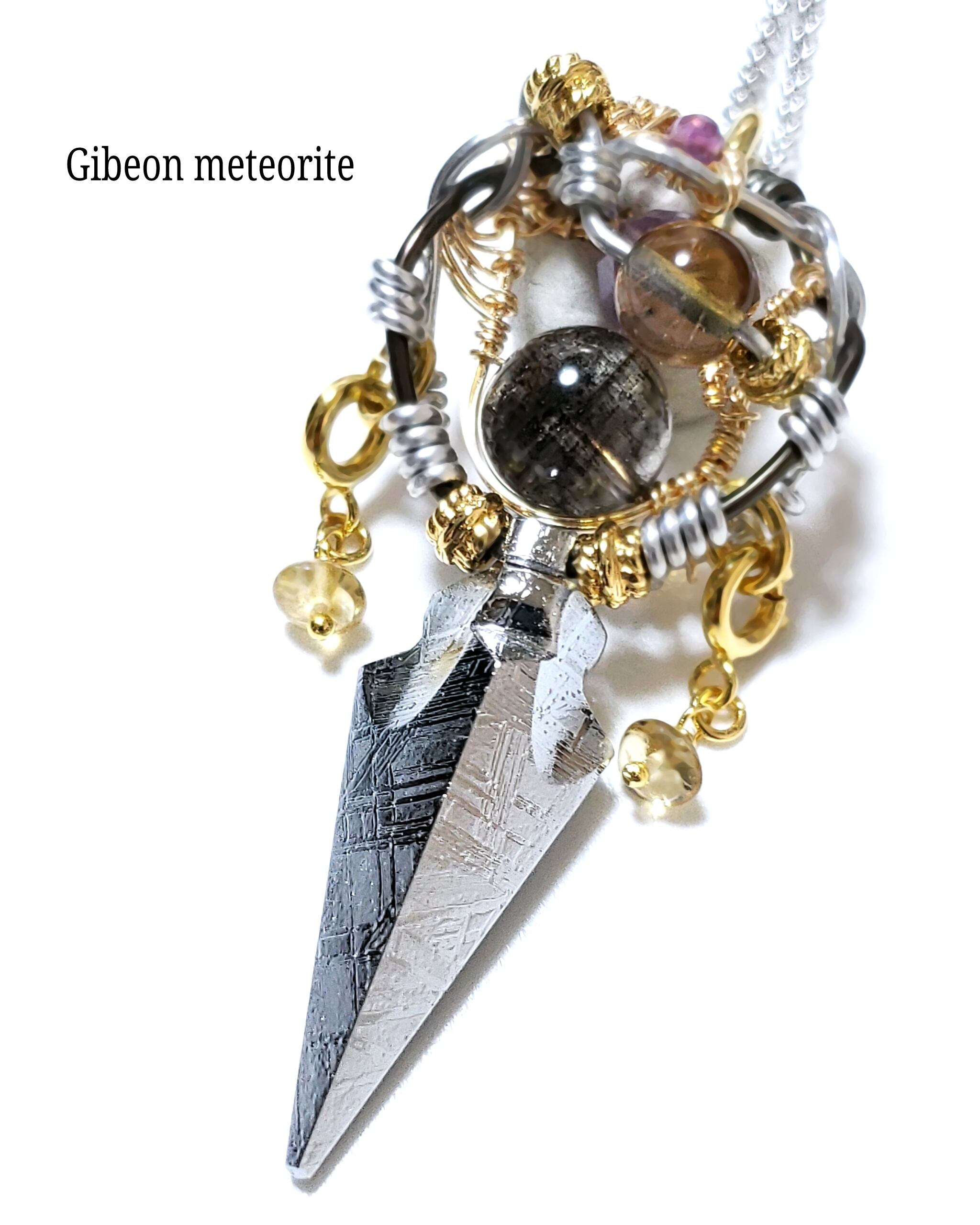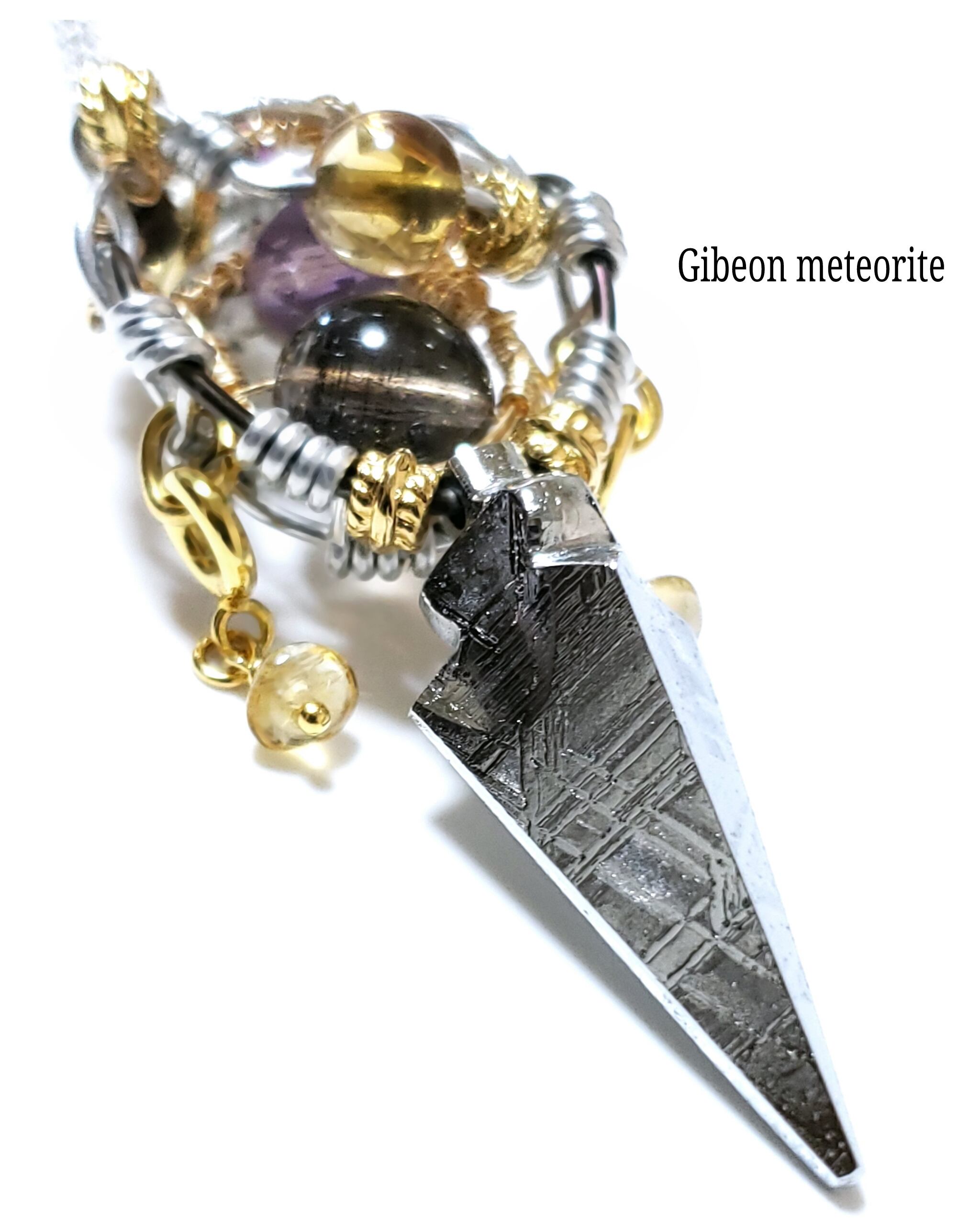 剣形したウィドマンシュテッテン構造が有名なギベオン隕石にプラチナクォーツとシトリンとアメジスト、そして、二つのシトリンのチャームを組み合わせ、ゴールドのアーティスティックワイヤーとアルマイト鍍金アルミ製ワイヤーを使用し、ペンダントトップにデザインしました。