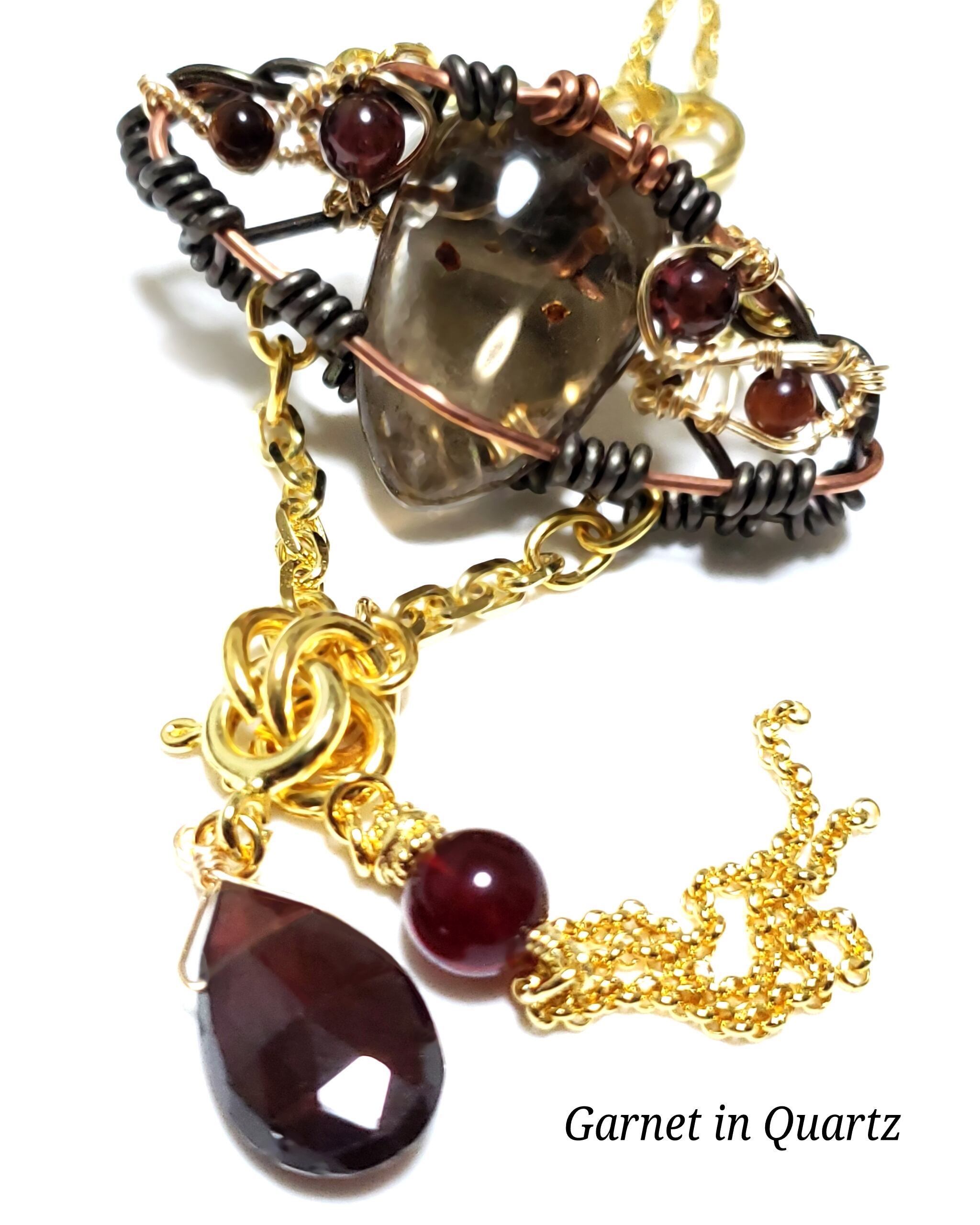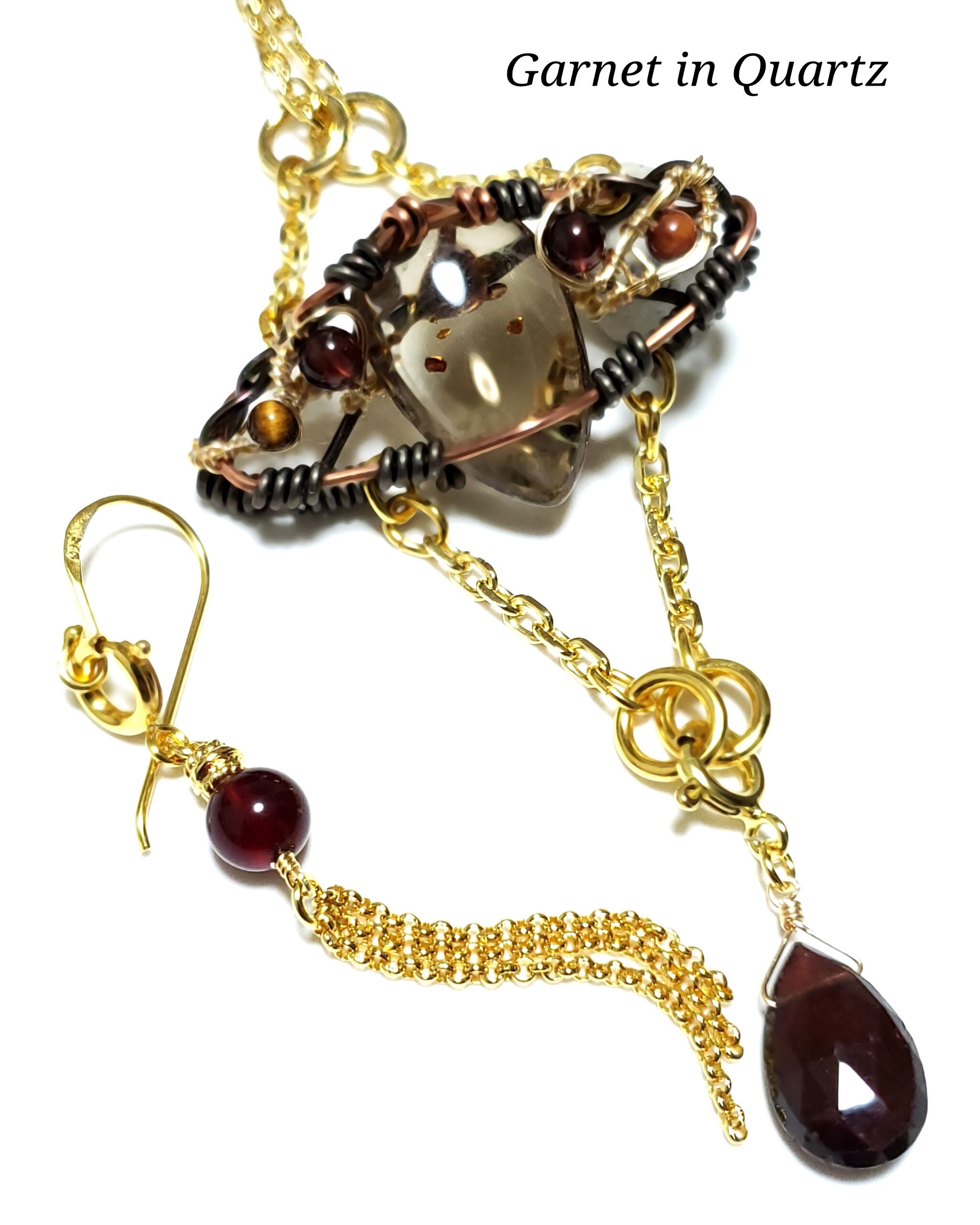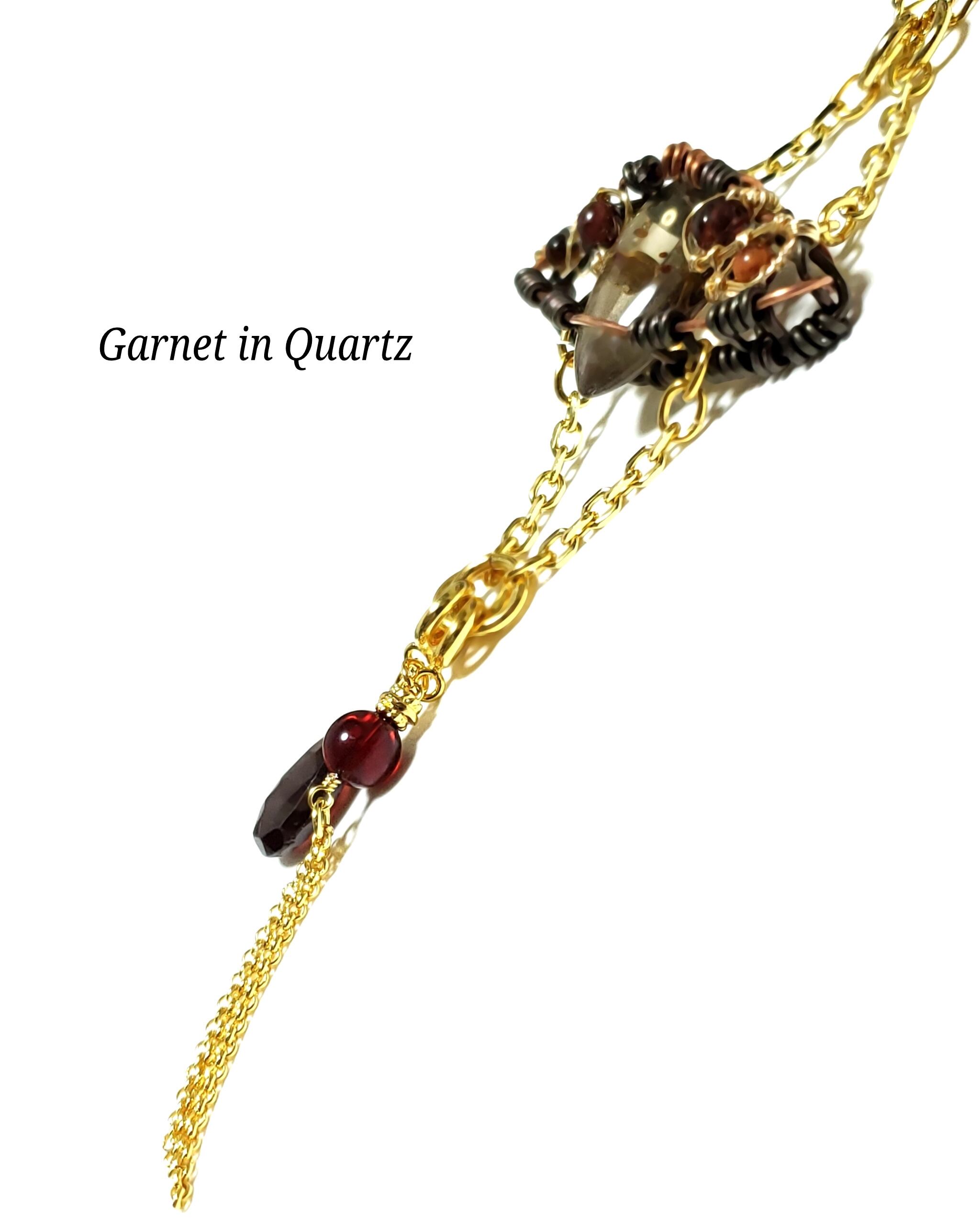 水晶(スモーキークォーツ)の中にガーネットがインクルージョン(内包)されたガーネットinクォーツにガーネットとタイガーアイ、そして、ガーネットのチャームとタッセルチェーン付きレッドアンバーのチャームを組み合わせ、ゴールドのアーティスティックワイヤーとブラックのアルマイト鍍金アルミ製ワイヤーと銅製ワイヤーを使用し、ペンダントトップにデザインしました。
