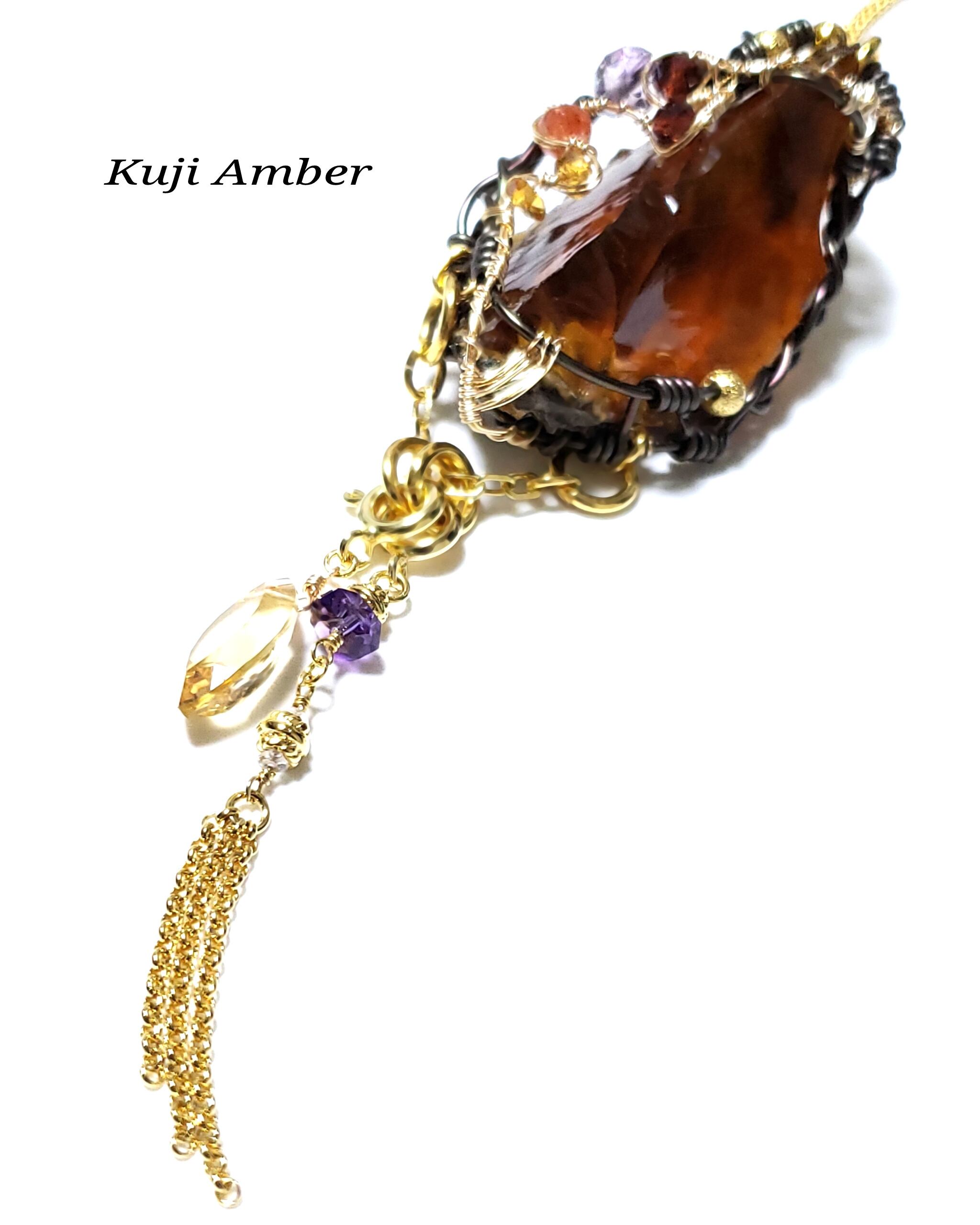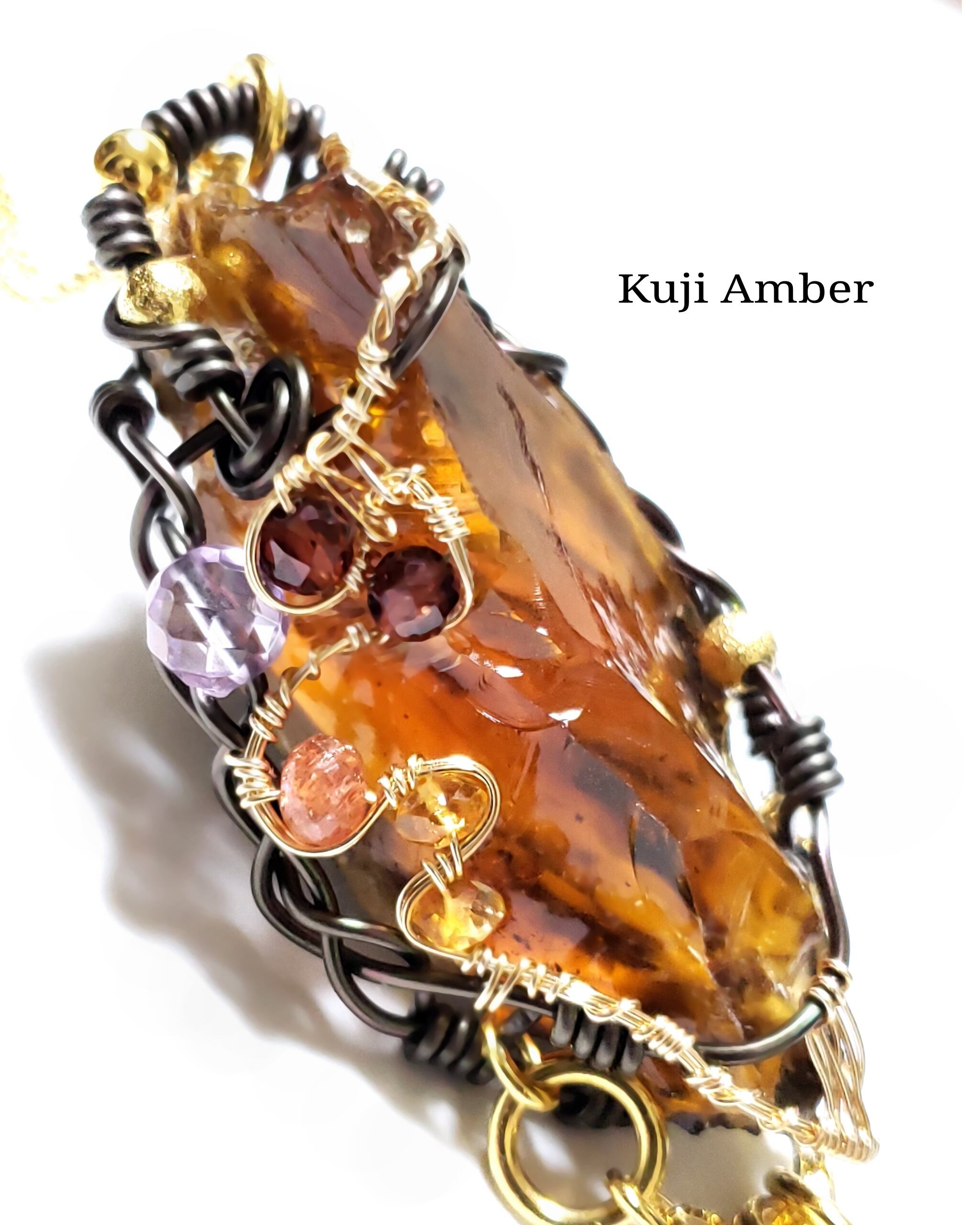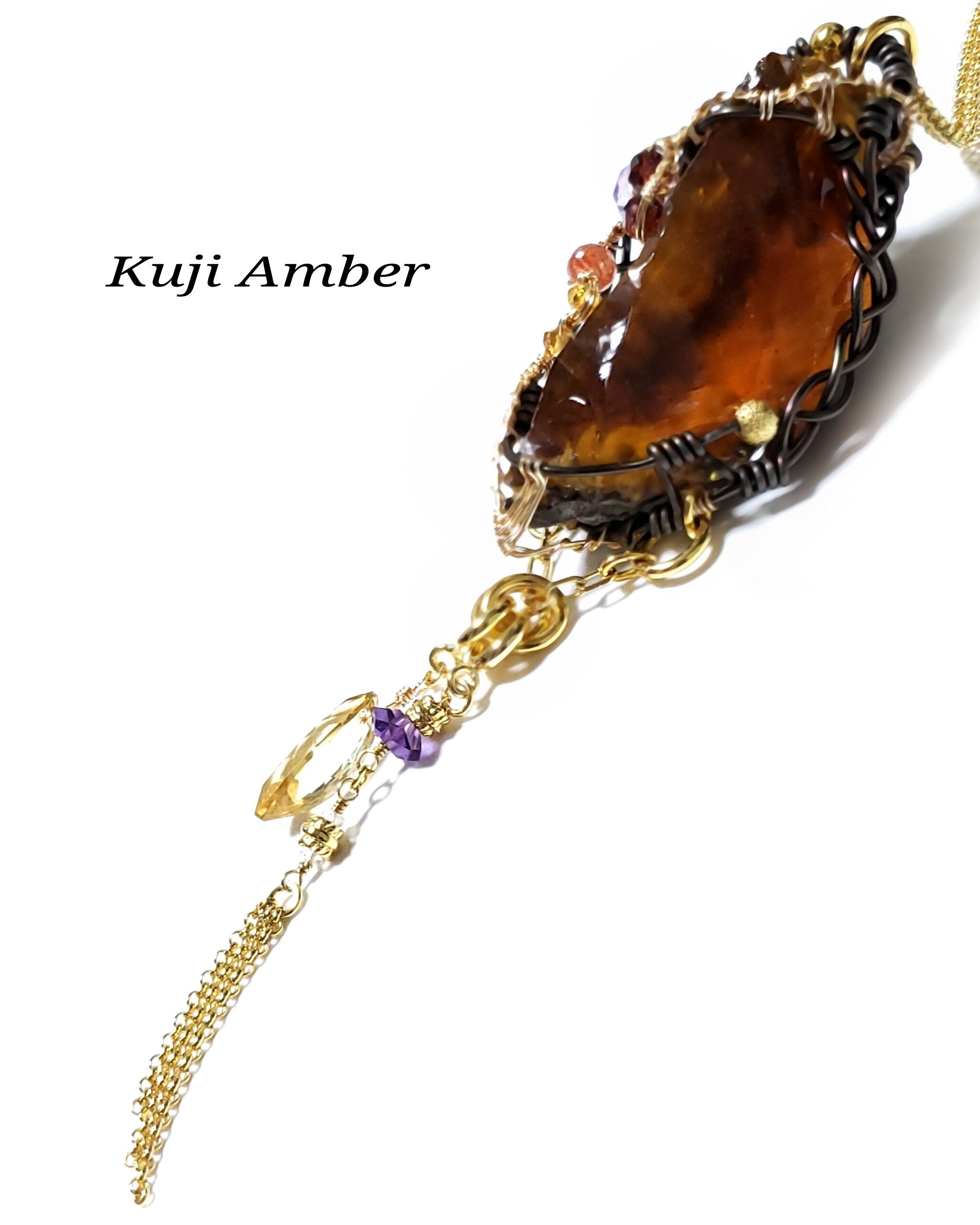 岩手県久慈市宇部町産の国産琥珀にガーネットとアメジストとシトリンとサンストーン、そして、シトリンのチャームとアメジストのチャームを組み合わせ、ゴールドのアーティスティックワイヤーと、ブラックのアルマイト鍍金アルミ製ワイヤーを使用し、ペンダントトップにデザインしました。