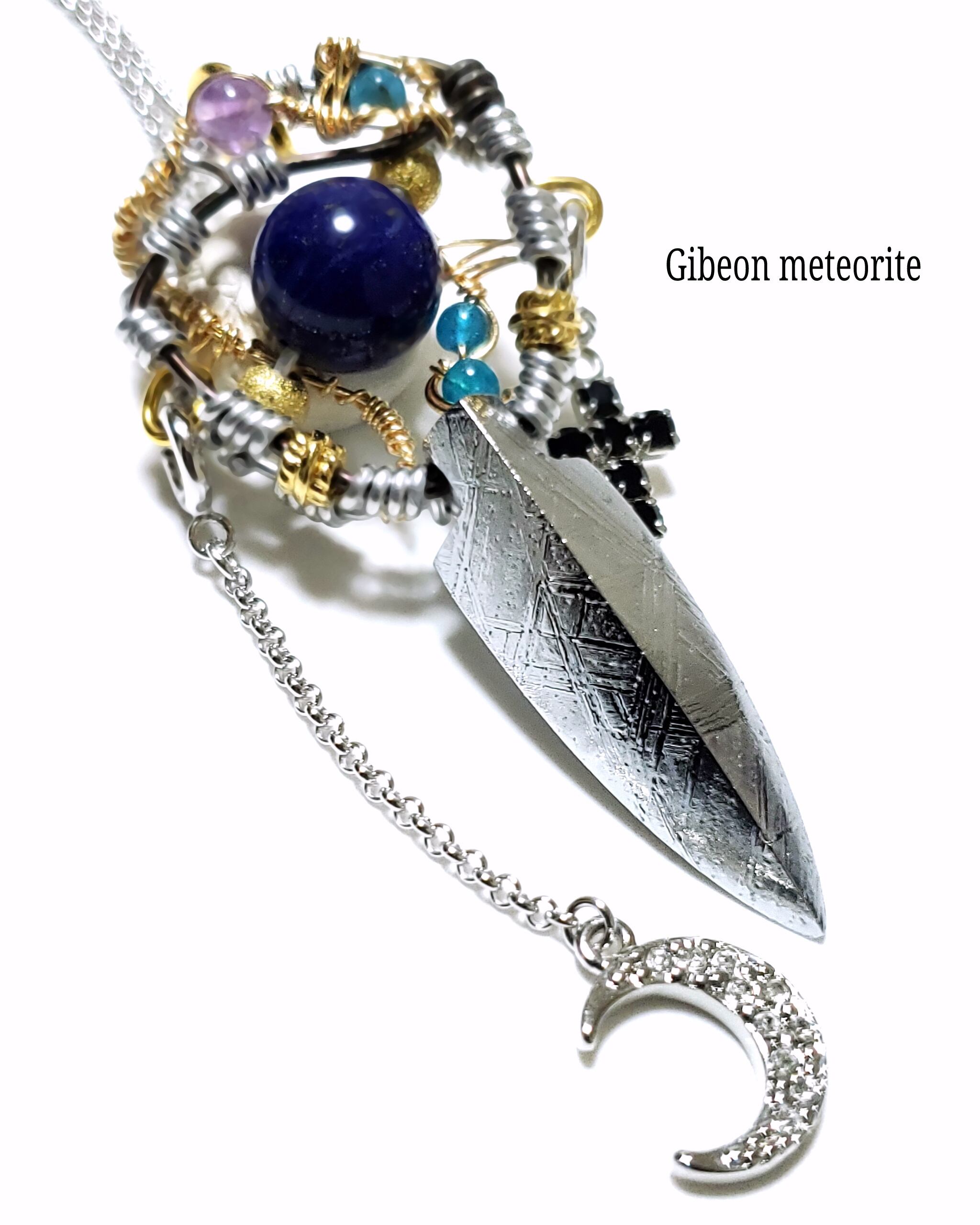 剣形したウィドマンシュテッテン構造が有名なギベオン隕石にラピスラズリとブルーアパタイトとアメジスト、そして、三日月とジェット付きクロスの2つチャームを組み合わせ、ゴールドのアーティスティックワイヤーとアルマイト鍍金アルミ製ワイヤーを使用し、ペンダントトップにデザインしました。