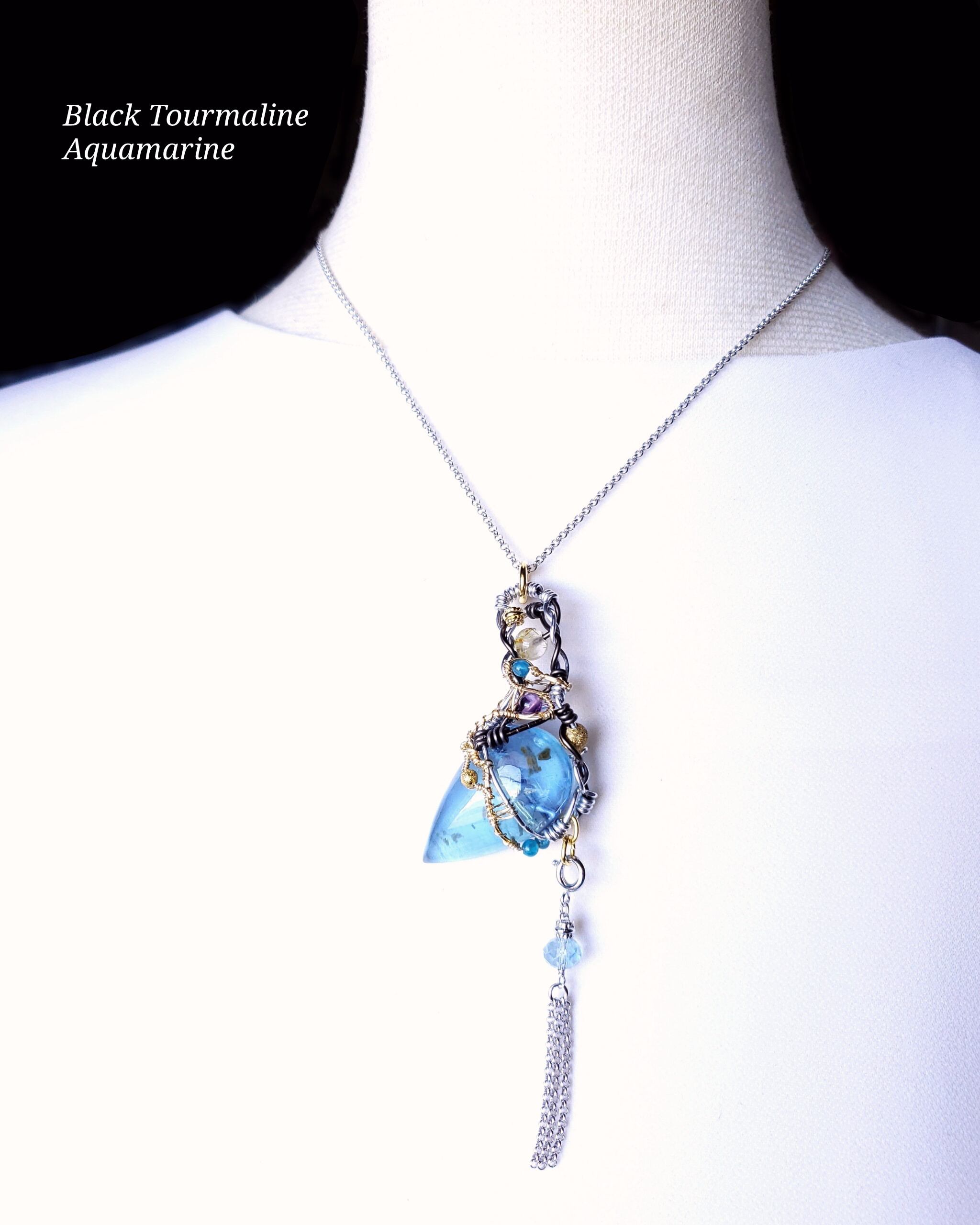 ブラックトルマリンを内包したシラーやとろみ加減のあるアクアマリンに、ルチルクォーツとアメジストとブルーアパタイト、そして、タッセルチェーン付きブルートパーズのチャームを組み合わせ、ゴールドのアーティスティックワイヤーとアルミ製ワイヤーを使用し、ペンダントトップにデザインしました。