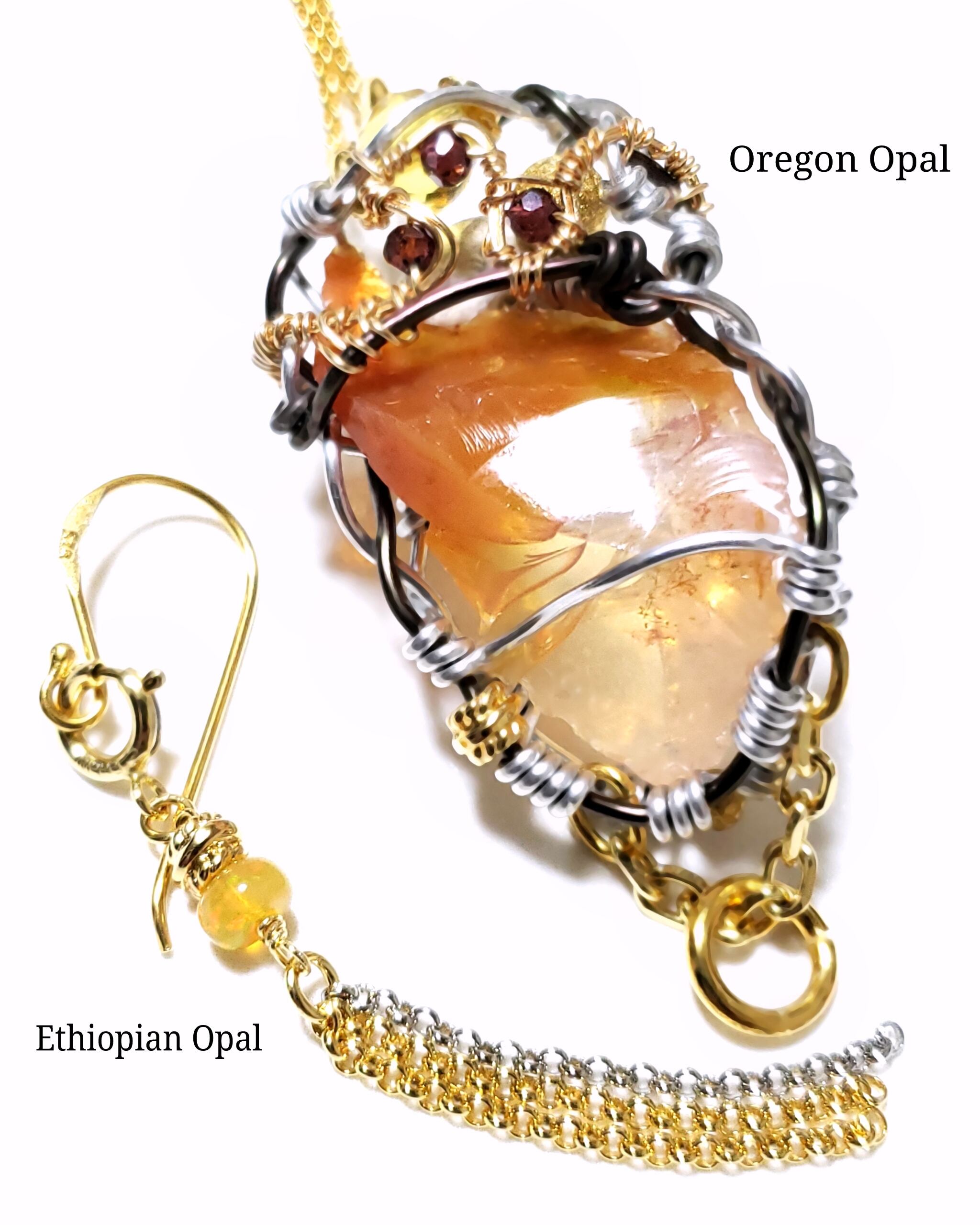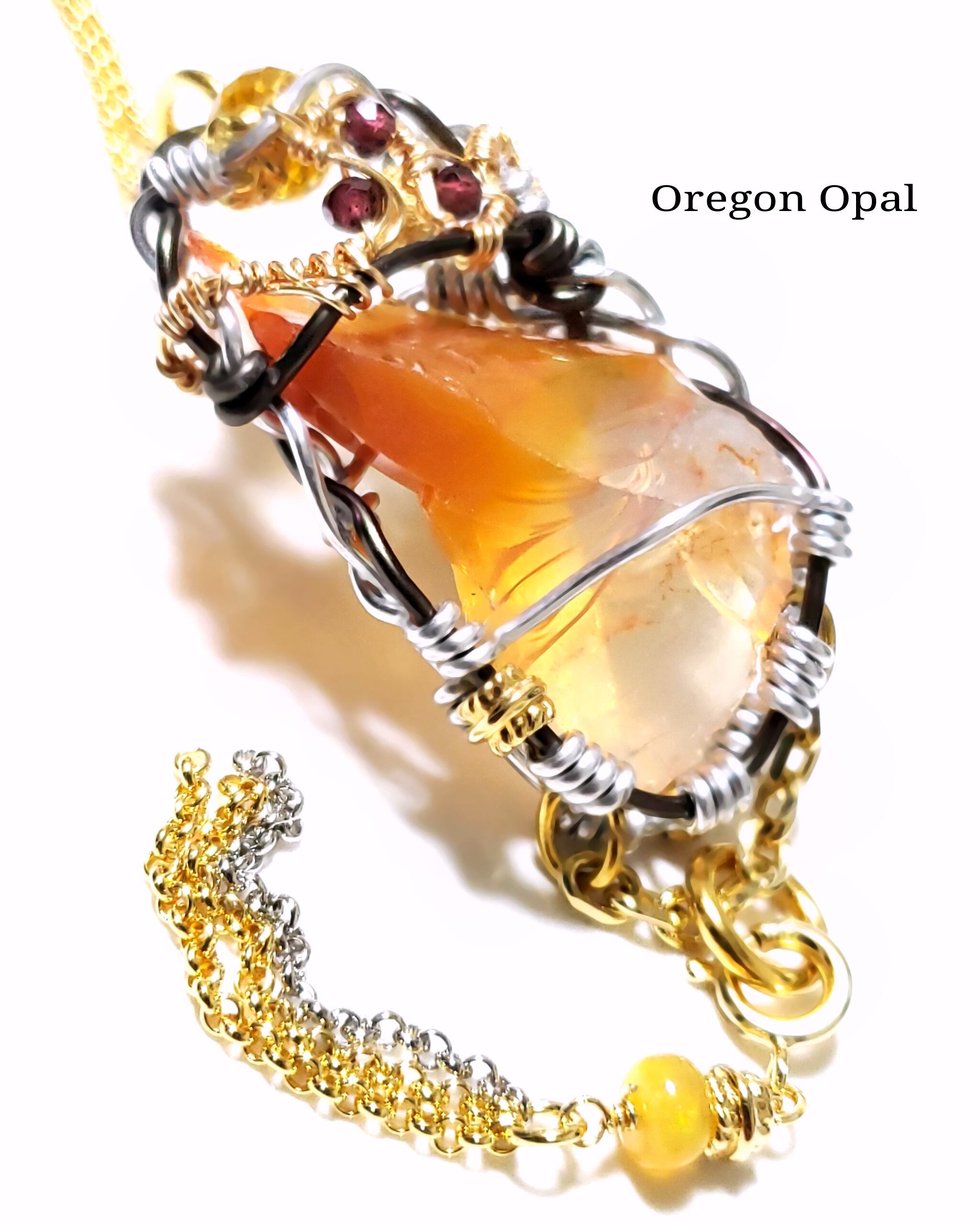 アメリカはオレゴン州産の半透明のイエローオレンジ色したオレゴンオパールに、レモンクォーツとガーネット、そして、エチオピアンオパールのチャームを組み合わせ、ゴールドのアーティスティックワイヤーとアルミ製ワイヤーを使用し、ペンダントトップにデザインしました。