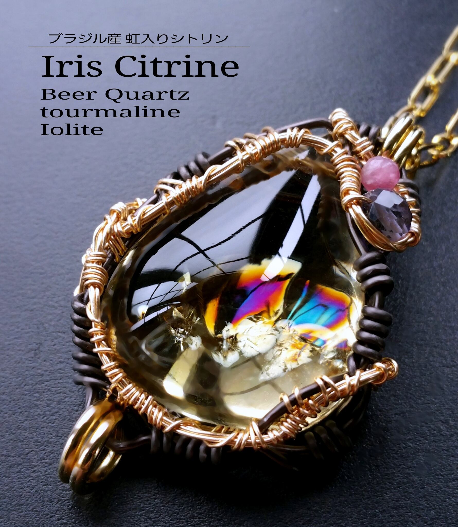虹色の輝きが美しいアイリス・シトリンとビアクォーツのチャームを組み合わせ、ゴールドのアーティスティックワイヤーとブラックのアルマイト鍍金アルミ製のワイヤーを使用し、ペンダントトップにデザインしました。