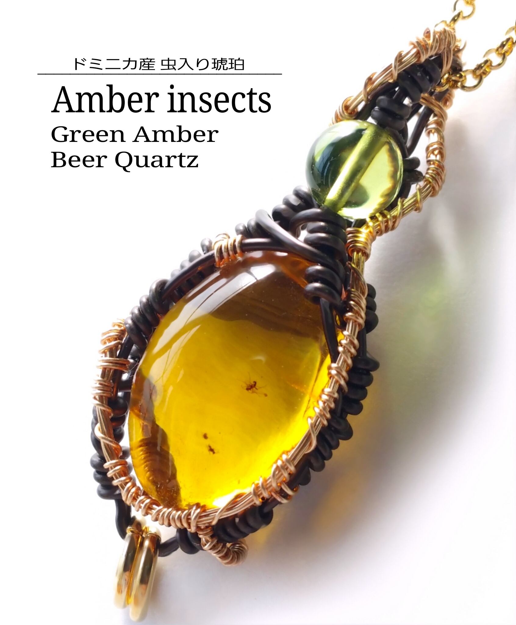 ドミニカ産の虫入り琥珀とグリーンアンバー、そしてビアクォーツのチャームを組み合わせ、ゴールドのアーティスティックワイヤーと、ブラックのアルマイト鍍金アルミ製ワイヤーを使用し、ペンダントトップにデザインしました。