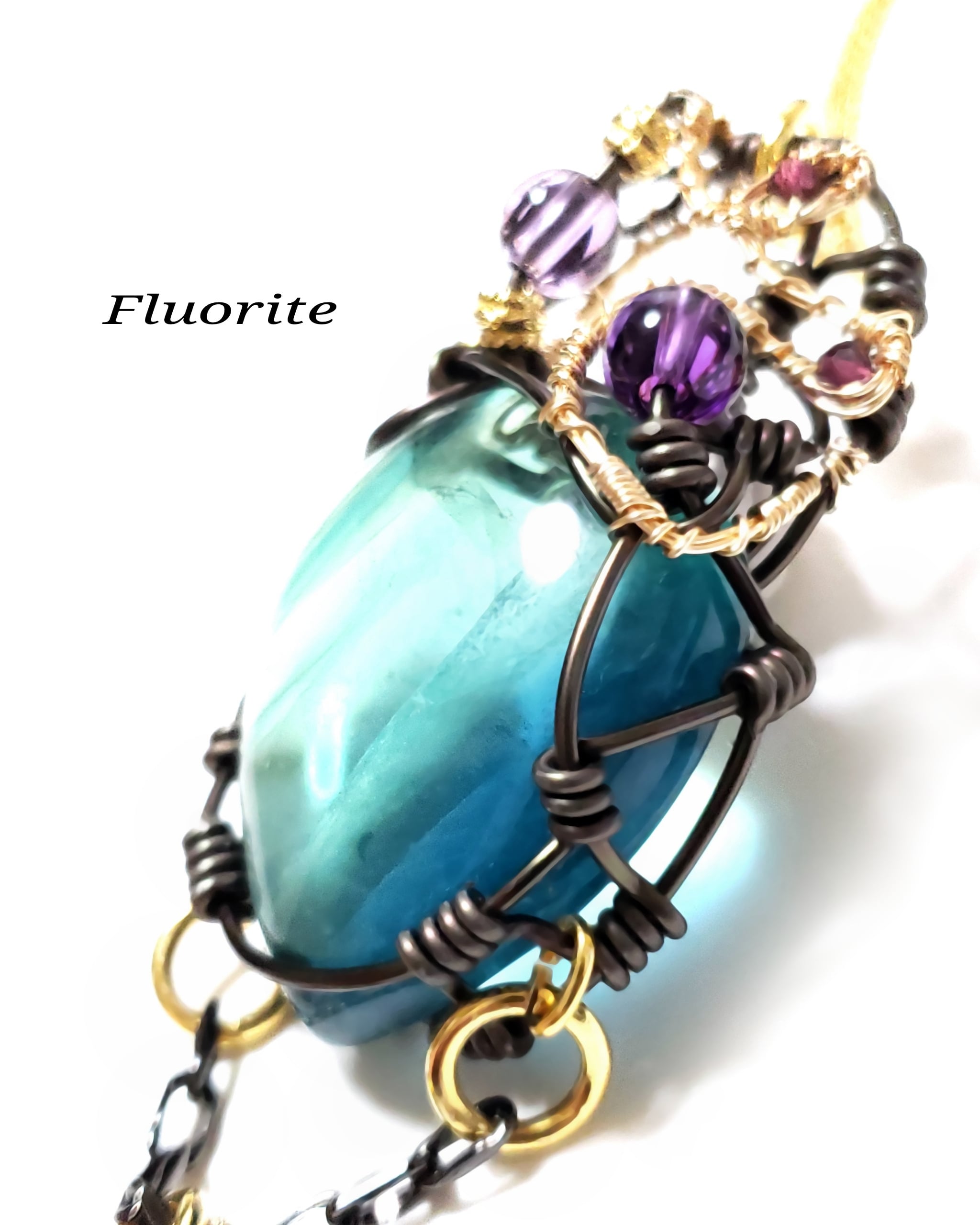 深く澄んだ海のように美しいピーコックブルーのフローライトにアメジストとガーネット、そして、タスモーキークォーツのチャームを組み合わせ、ゴールドのアーティスティックワイヤーとブラックのアルマイト鍍金アルミ製ワイヤーを使用し、ペンダントトップにデザインしました。