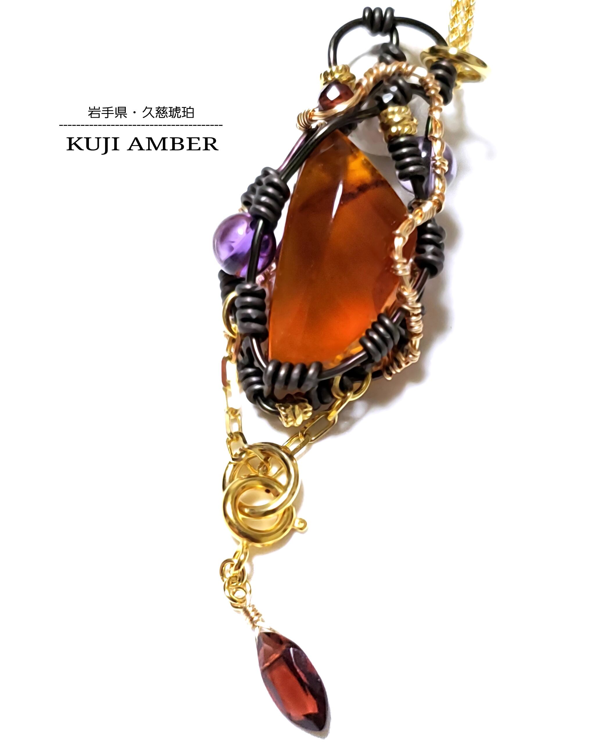 岩手県久慈市宇部町産の国産琥珀にアメジストとガーネット、そして、ガーネットのチャームを組み合わせ、ゴールドのアーティスティックワイヤーとブラックのアルマイト鍍金アルミ製ワイヤーを使用し、ペンダントトップにデザインしました。