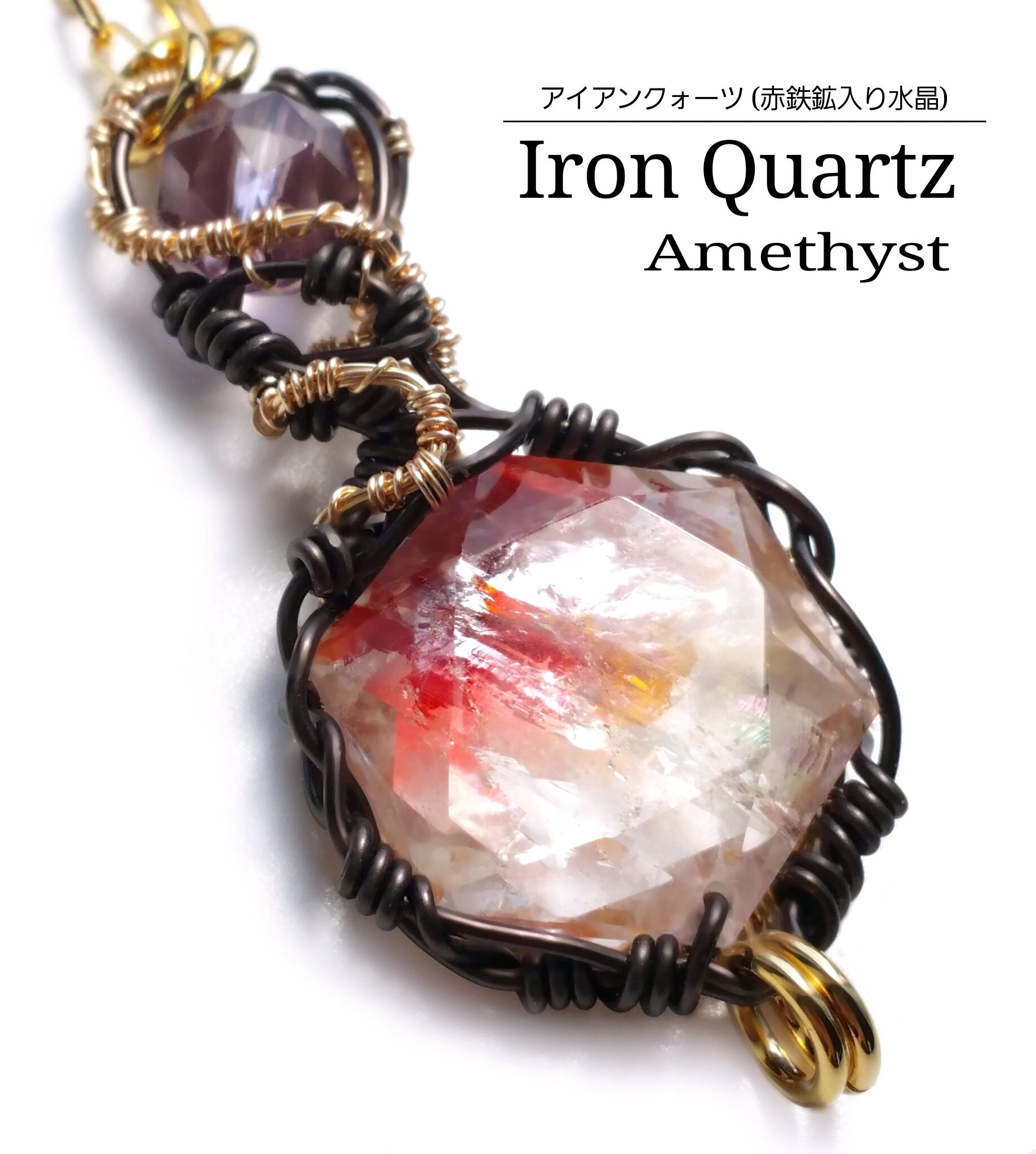 水晶の内部に赤色~オレンジ色のヘマタイト(赤鉄鉱)を内包した、大変に珍しいアイアンクォーツとアメジストを組み合わせ、ゴールドのアーティスティックワイヤーとブラックのアルマイト鍍金アルミ製ワイヤーを使用し、ペンダントトップにデザインしました。
