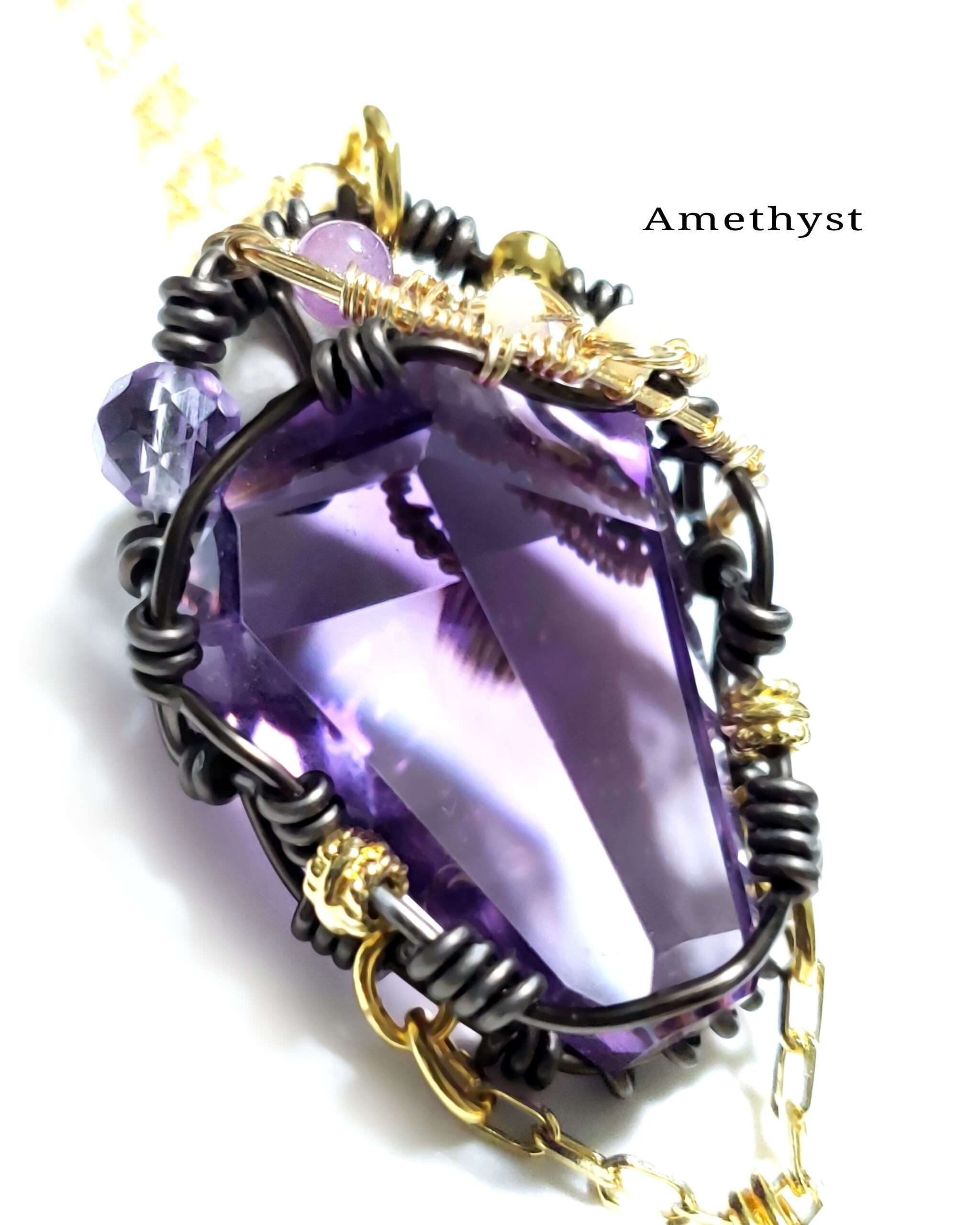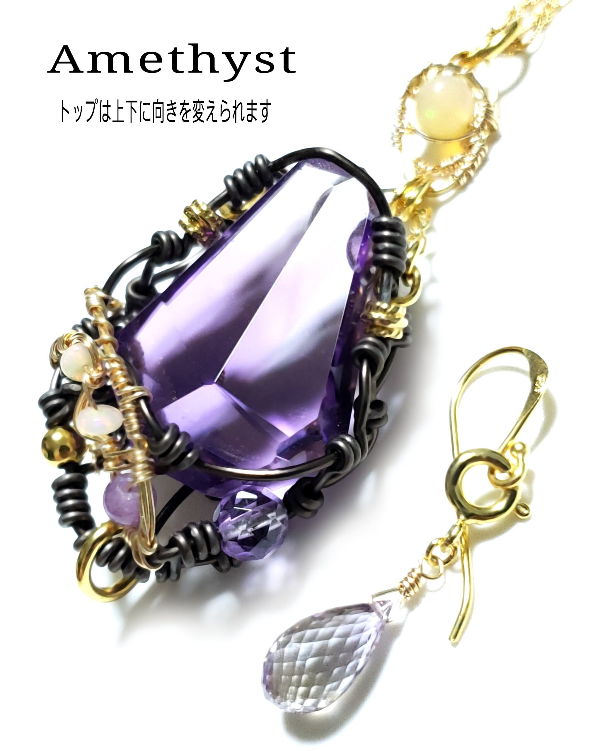 フラットカットが施された宝石質のアメジストに、アメジストとエチオピアンオパール、そして、アメトリンのチャームを組み合わせ、ゴールドのアーティスティックワイヤーとアルマイト鍍金アルミニウム製ワイヤーを使用し、ペンダントトップにデザインしました。