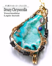 チリ産の美しいドゥルージー・クリソコラとトルマリン、ラピスラズリのビーズを組み合わせ、ゴールドのアーティスティックワイヤーとブラックのアルマイト鍍金アルミ製ワイヤーを使用し、ペンダントトップにデザインしました。