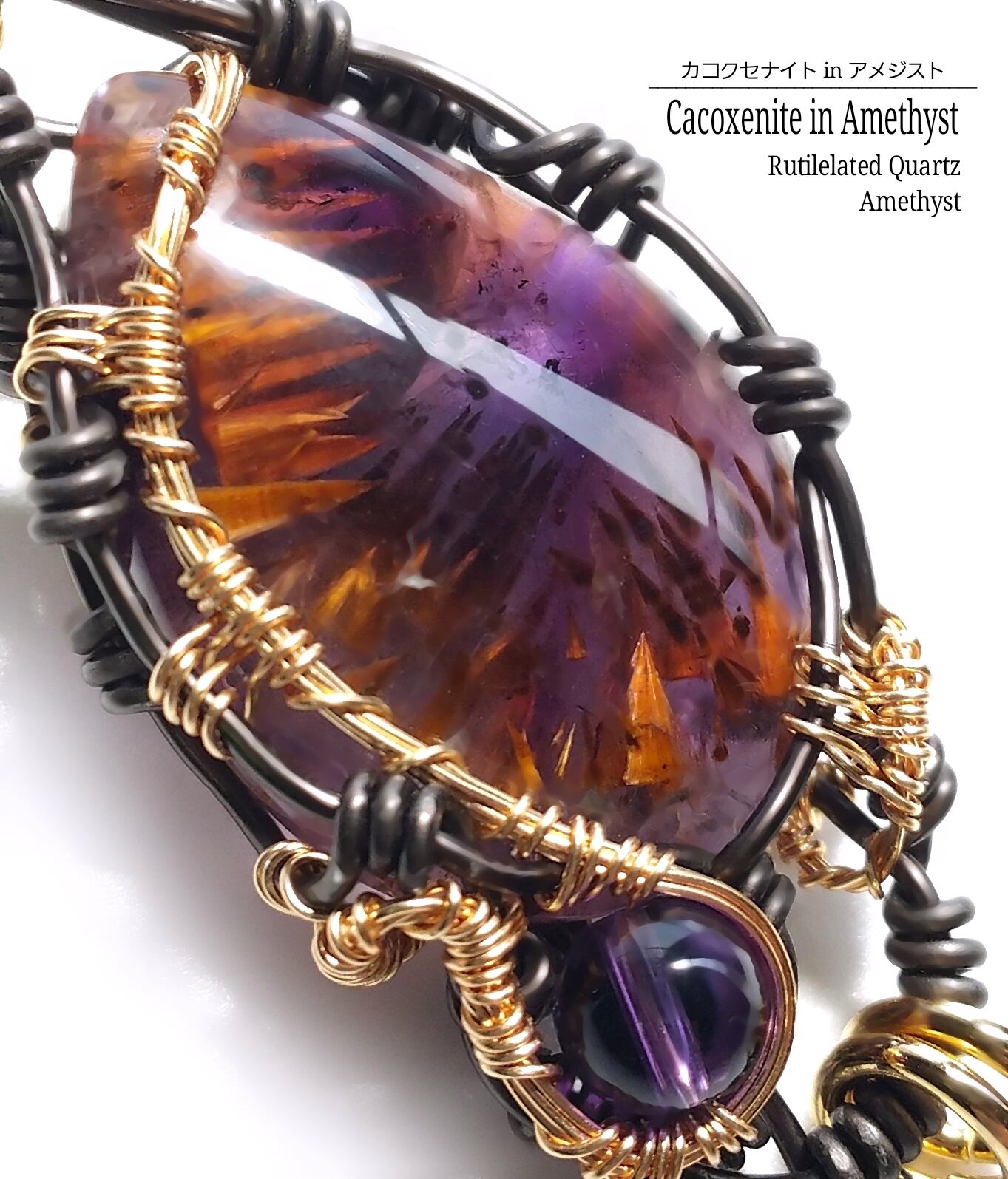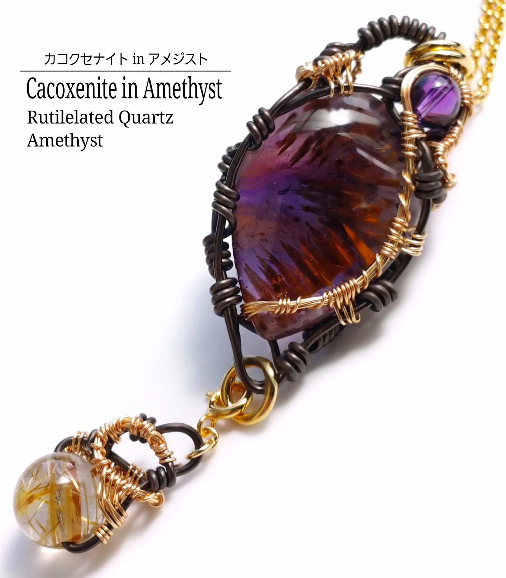 天使の翼と呼ばれる“ カコクセナイト“ が内包された個性的なアメジストと、ゴールドの輝が美しいルチルクォーツのチャームを組み合わせ、ゴールドのアーティスティックワイヤーと、ブラックのアルマイト鍍金アルミ製ワイヤーを使用し、ペンダントトップにデザインしました。