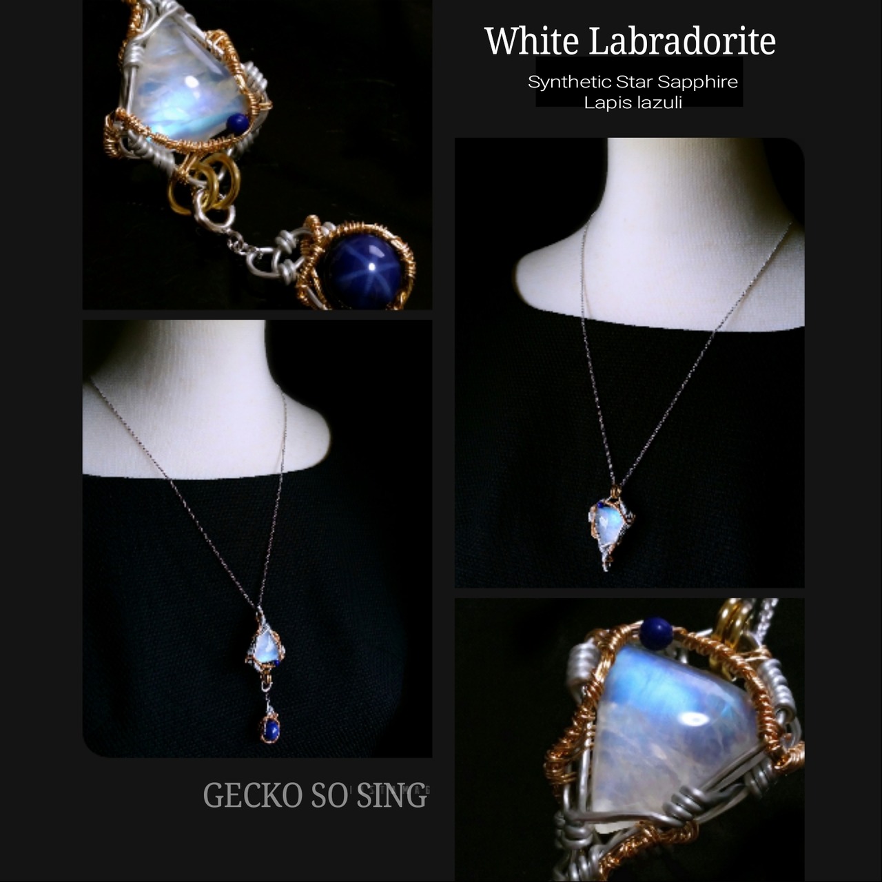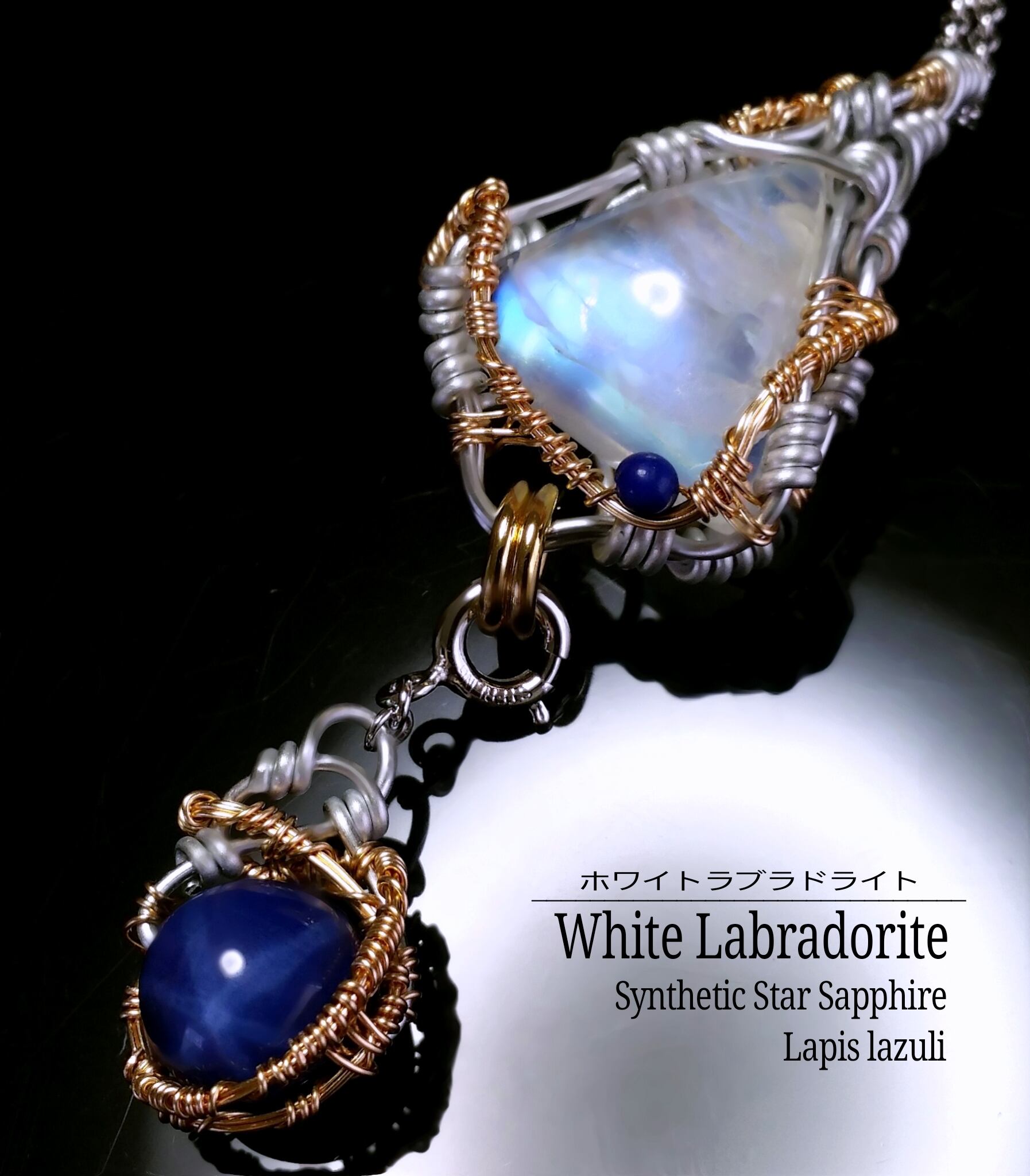 ホワイトラブラドライトとラピスラズリ、合成スターサファイアのチャームを組み合わせ、シルバーのアーティスティックワイヤーとアルマイト鍍金アルミ製ワイヤーを使用し、ペンダントトップにデザインしました。