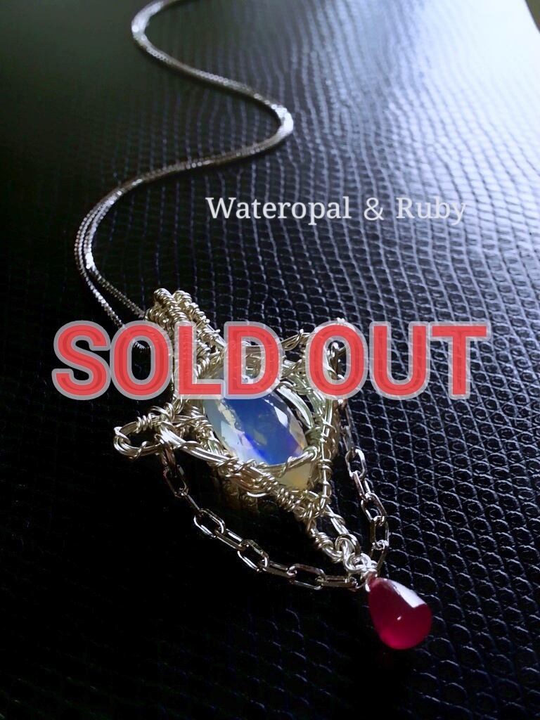ウォーターオパール&ルビーのワイヤーアートペンダント