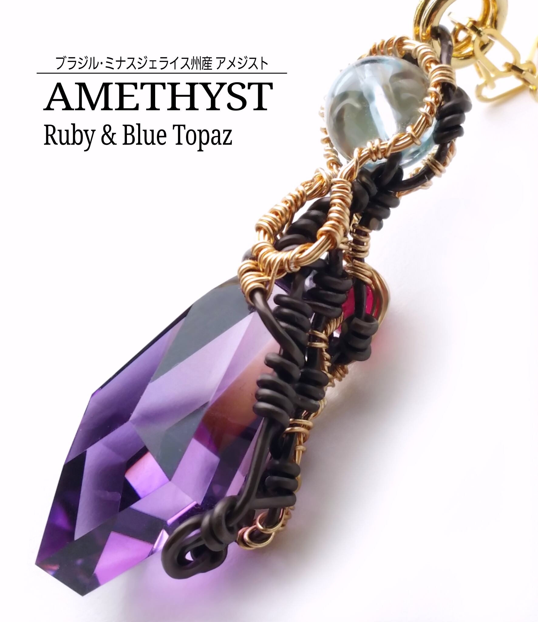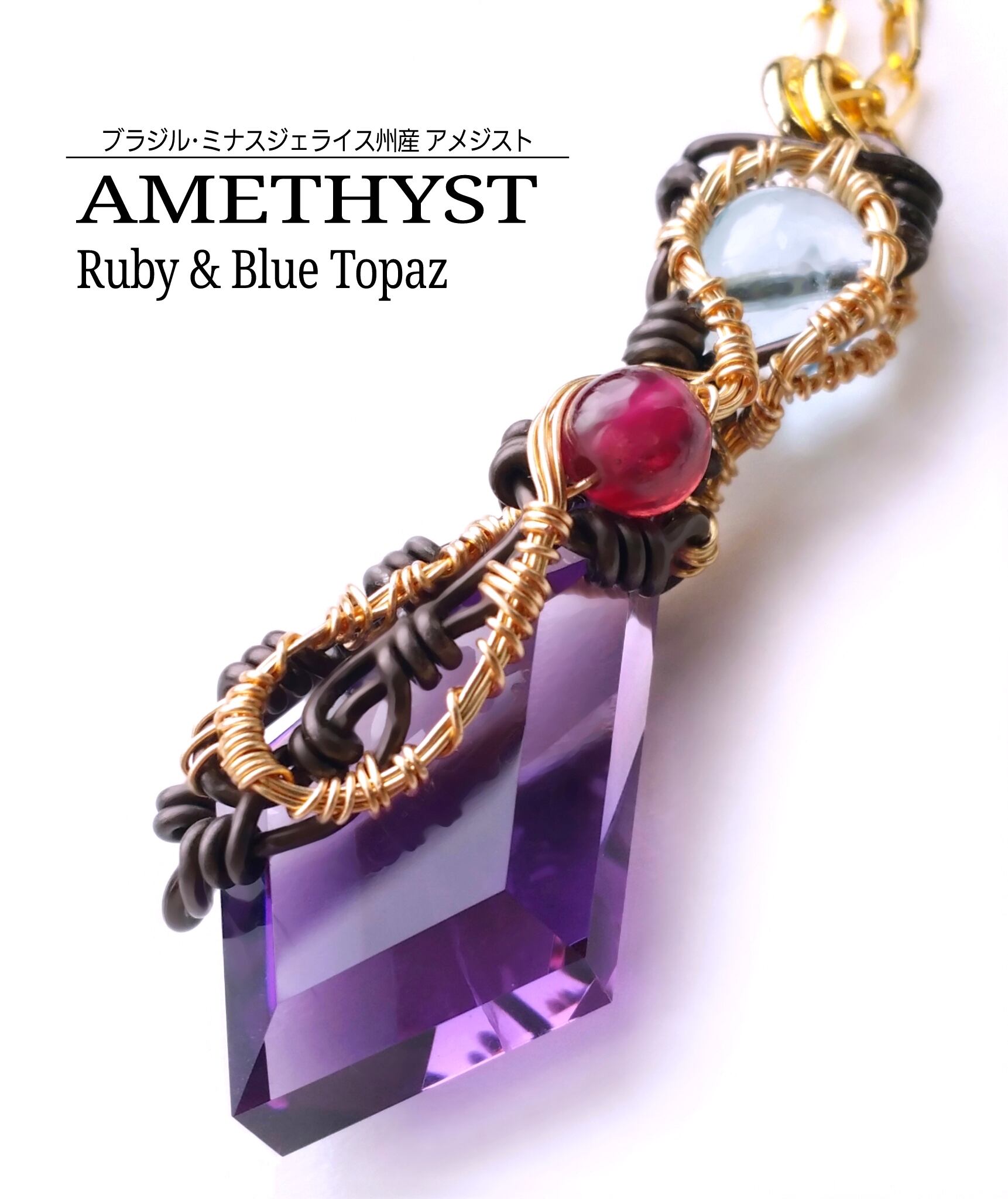 美しい貴石の産地ブラジルはミナスジェライス州産のアメジストと、宝石質のルビー&ブルートパーズを組み合わせを、ゴールドのアーティスティックワイヤーとブラックのアルマイト鍍金加工のアルミニウム製ワイヤーを使用し、ペンダントトップにデザインしました。
