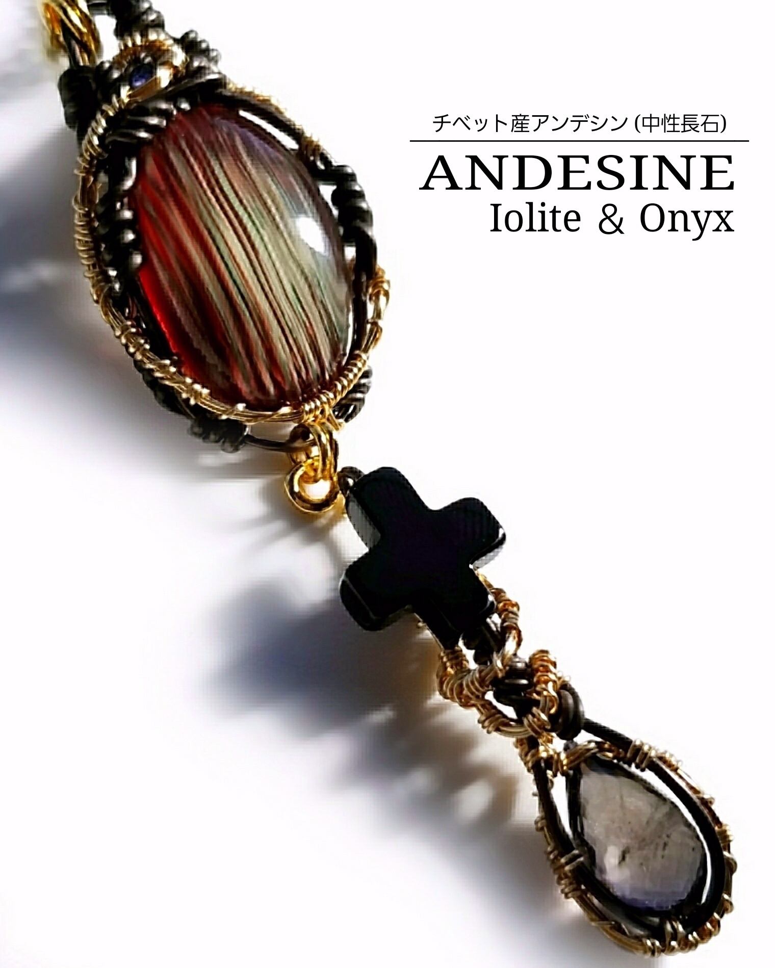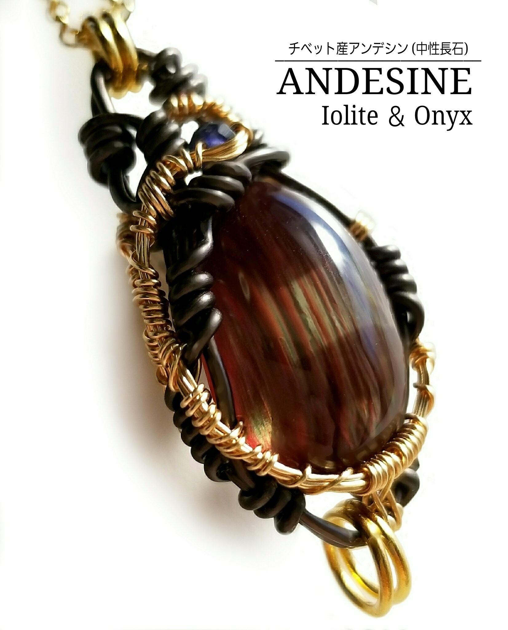 珍しいチベットのアンデシンと、アイオライト&オニキスのチャームを組み合わせ、ゴールドのアーティスティックワイヤーとブラックのアルマイト鍍金アルミ製ワイヤーを組み合わせ、ペンダントトップにデザインしました。