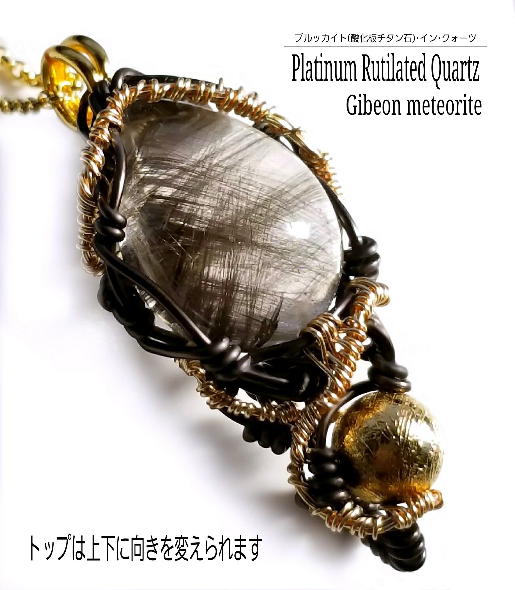 プラチナルチルクォーツ&ギベオン隕石のワイヤーアート・ペンダント