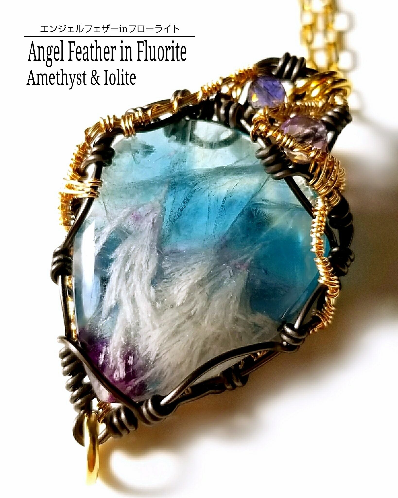 激レアのエンジェルフェザーinフローライトと、アイオライトとピンクアメジストのビーズを組み合わせ、ゴールドのアーティスティックワイヤーとブラックのアルマイト鍍金アルミ製のワイヤーを使用し、ペンダントトップにデザインしました。